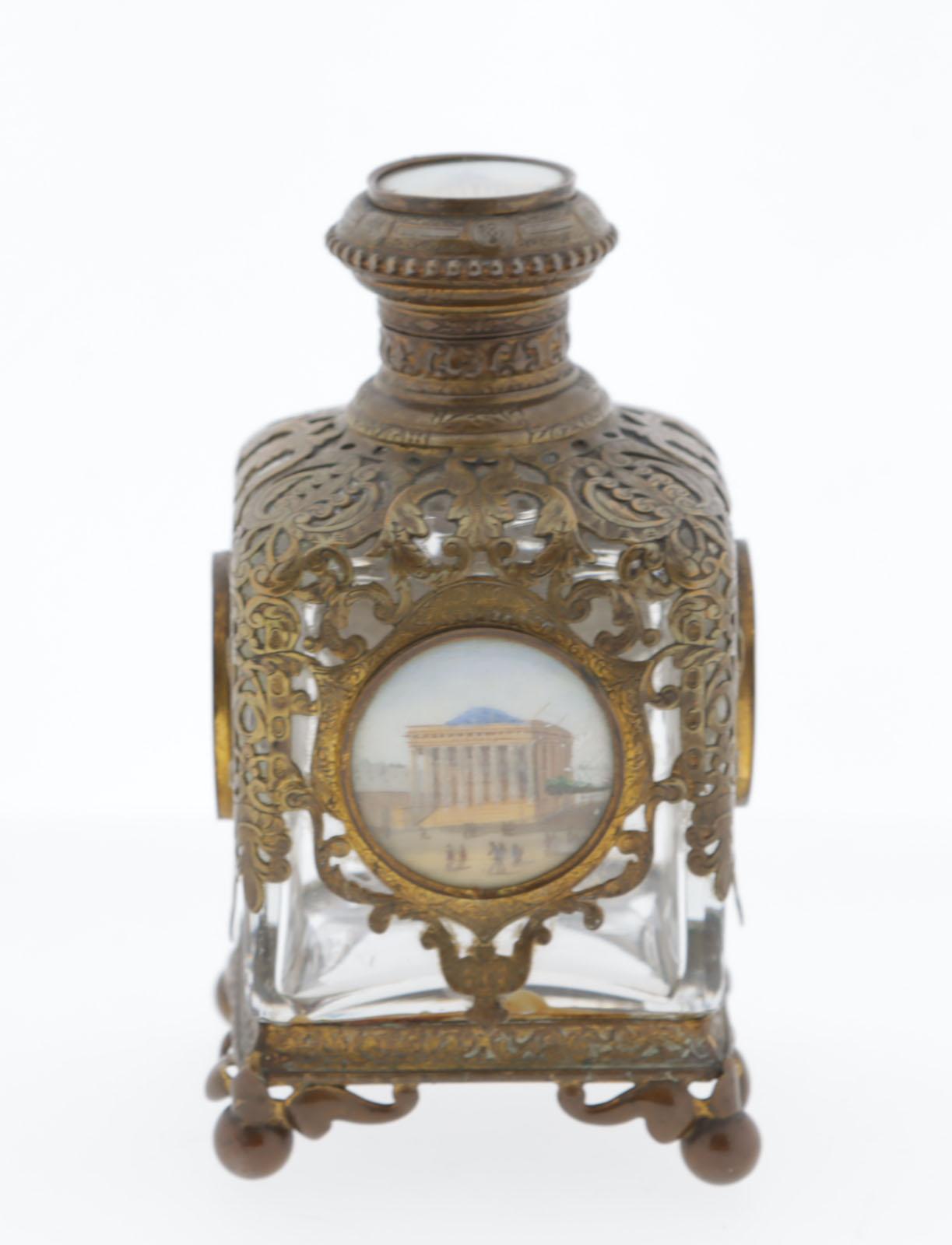 Antieke kristallen parfumfles, le Grand Tour, vuurverguld krullerig messing met daarin verwerkt schilderijtjes van bekende Parijse gebouwen, scharnierende dop met kristallen stopje, 60 x 60 x 12 cm, rond 1880