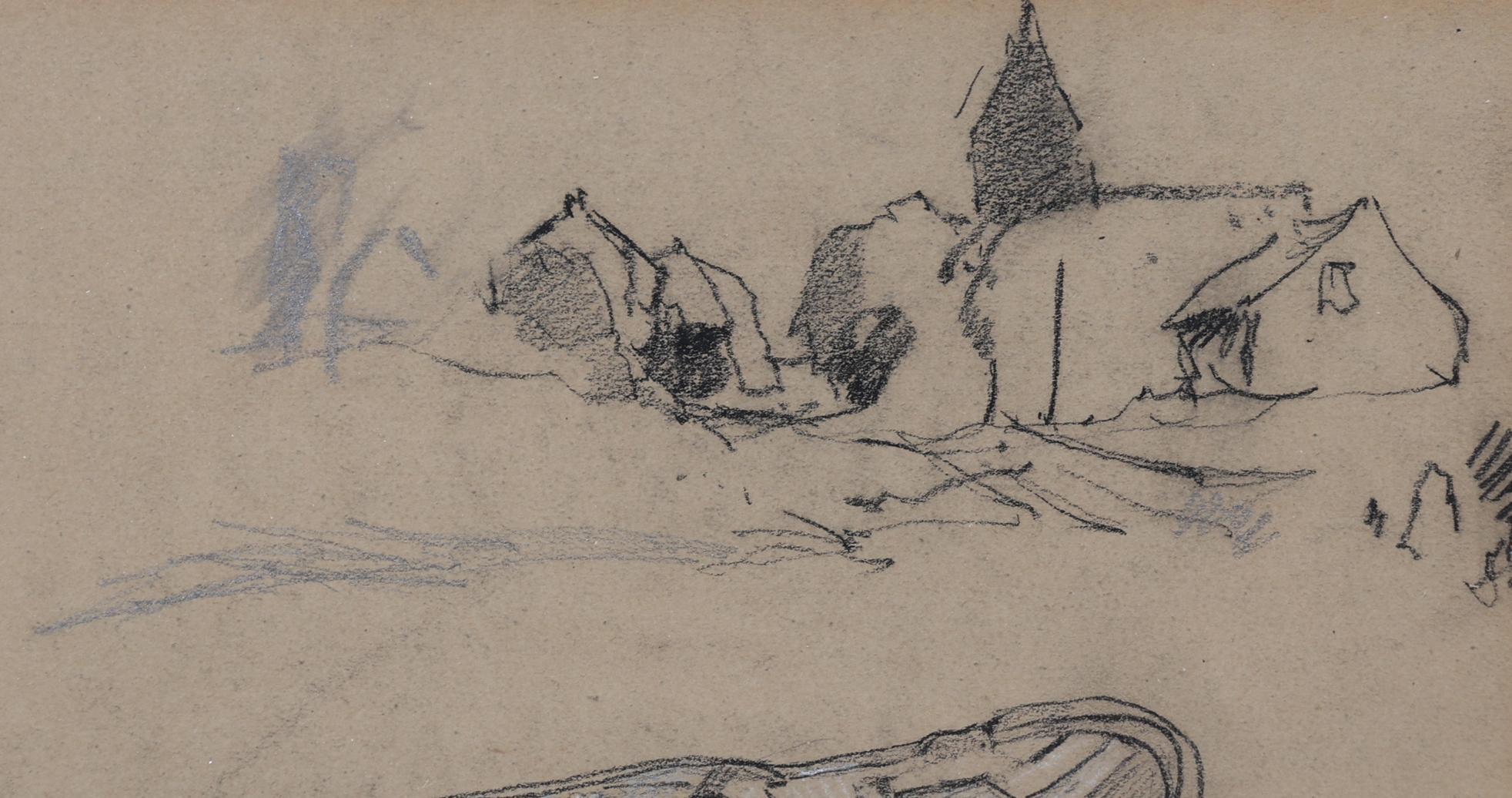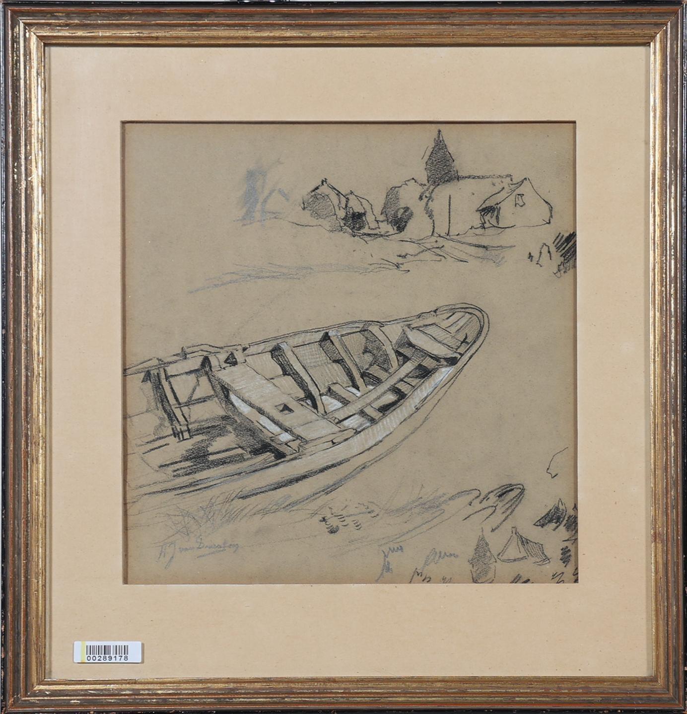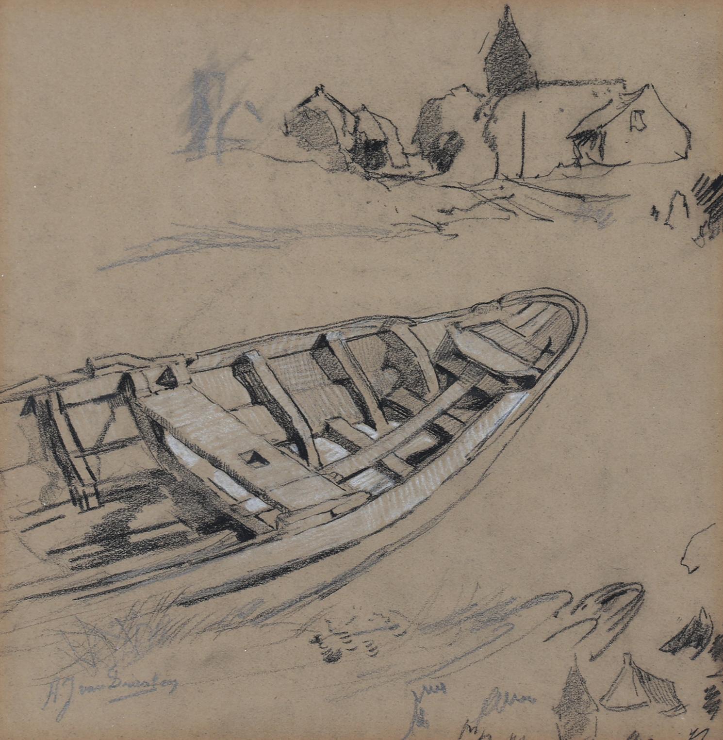 Arend Jan van Driesten (1878-1969), Bootje met dorpsgezicht op de achtergrond, houtskool / pastel op papier, 22 x 22 cm.