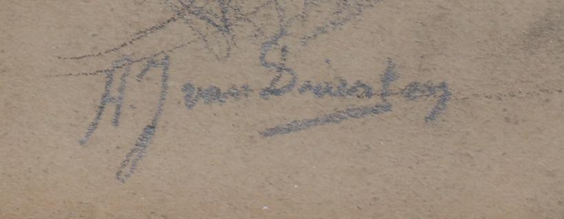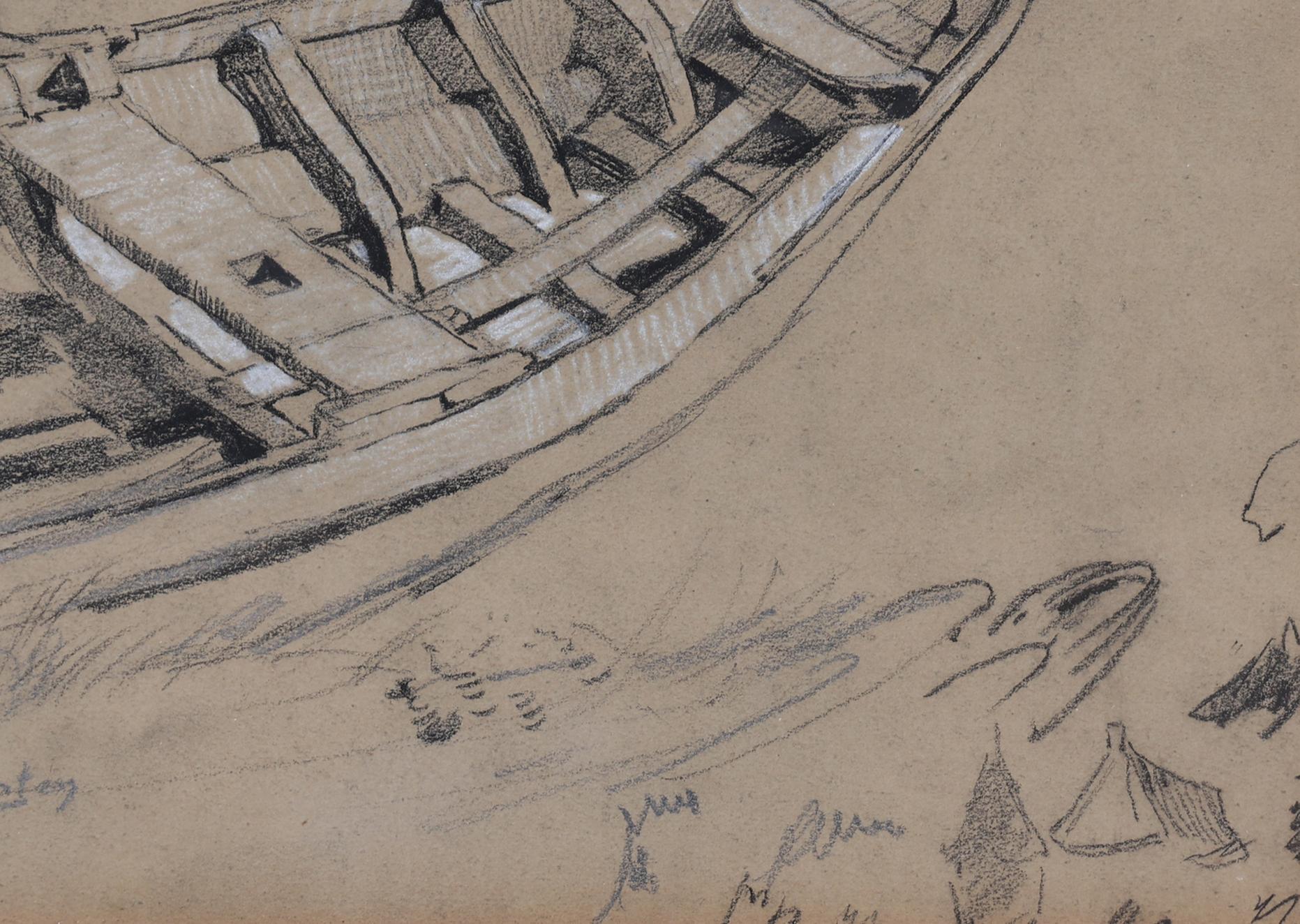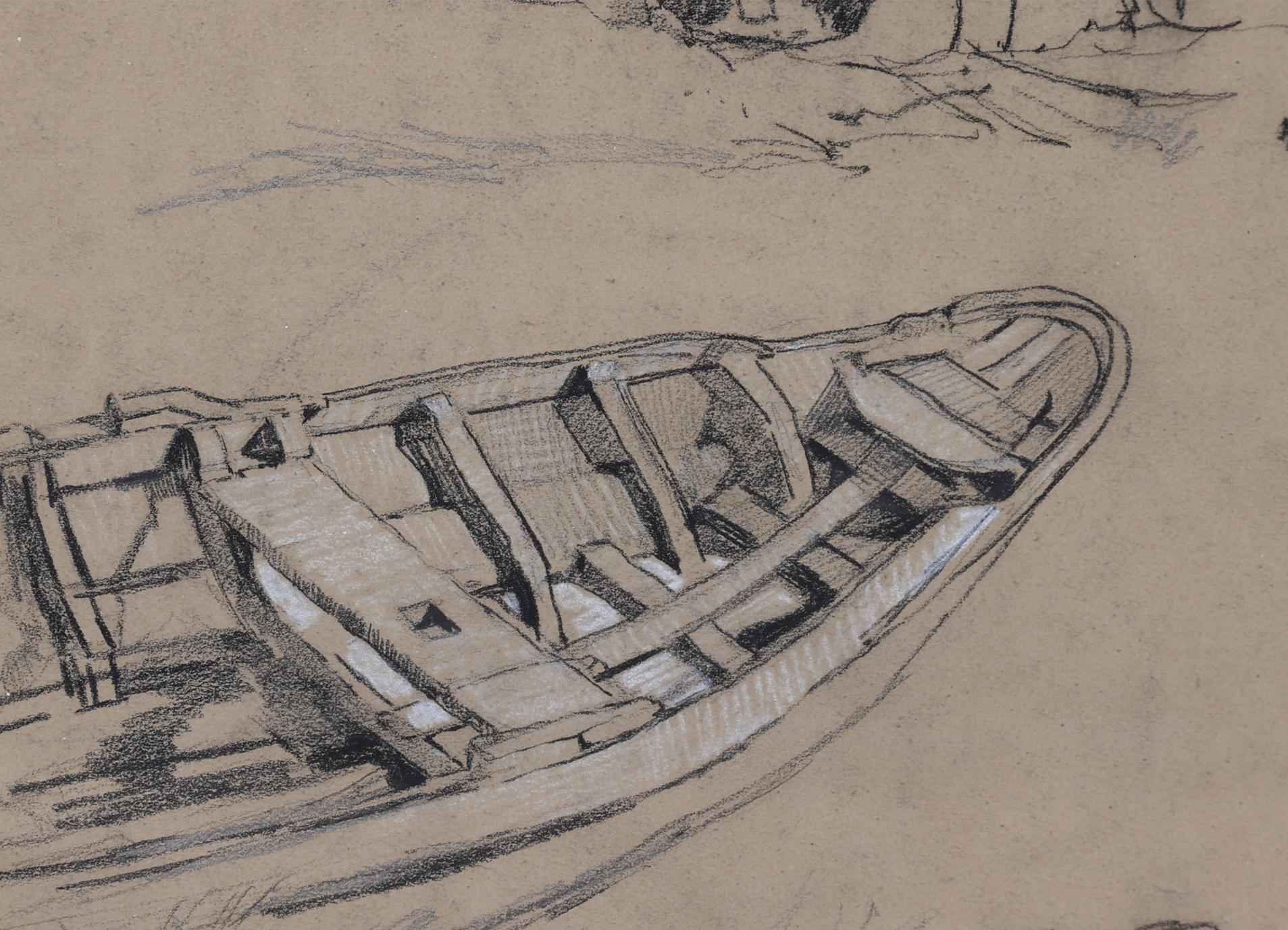Arend Jan van Driesten (1878-1969), Bootje met dorpsgezicht op de achtergrond, houtskool / pastel op papier, 22 x 22 cm.