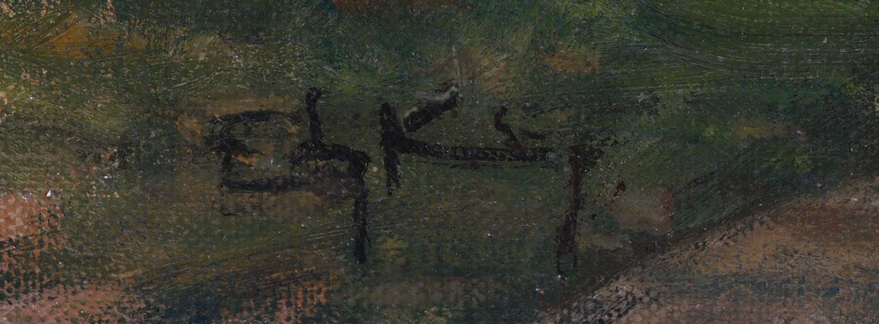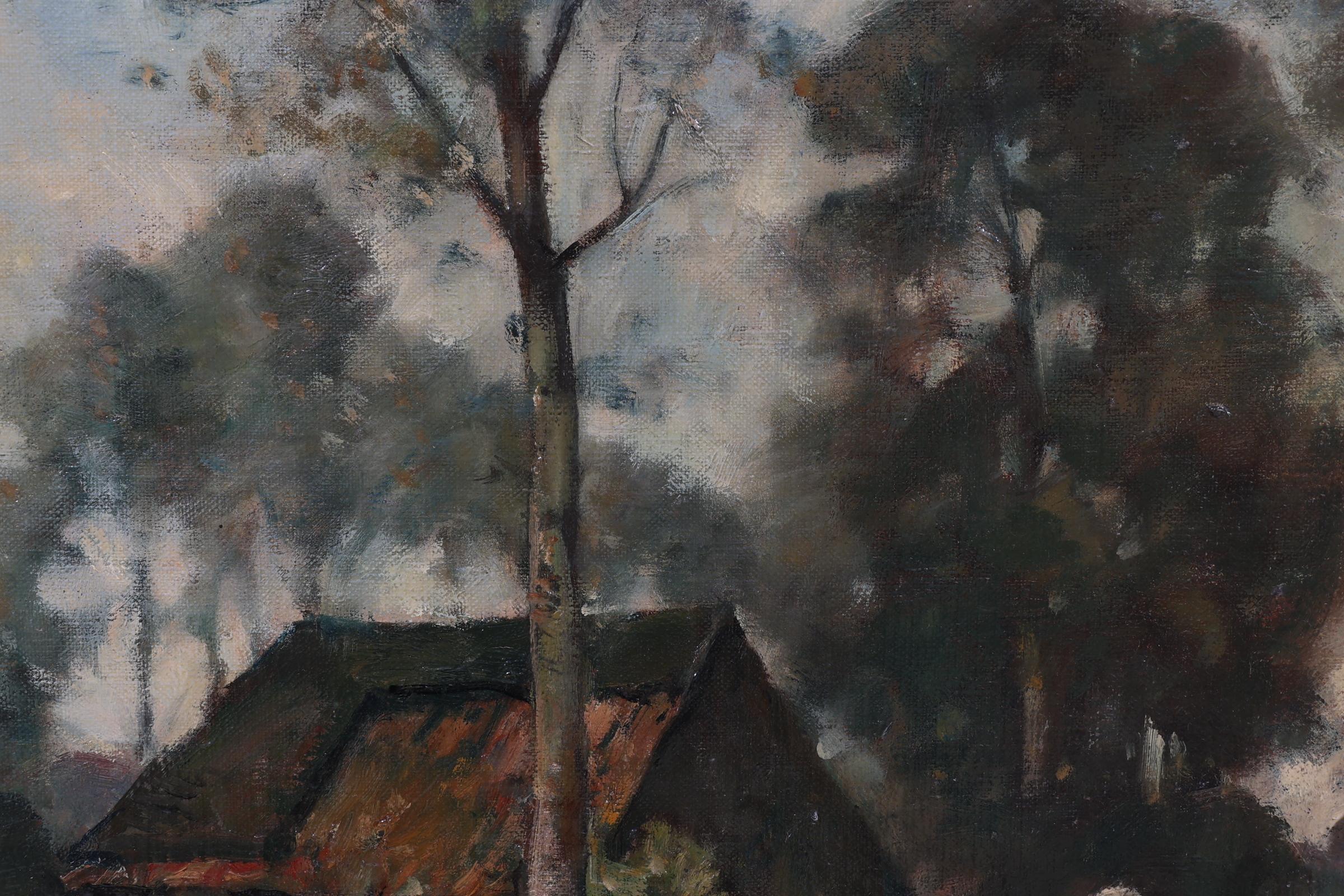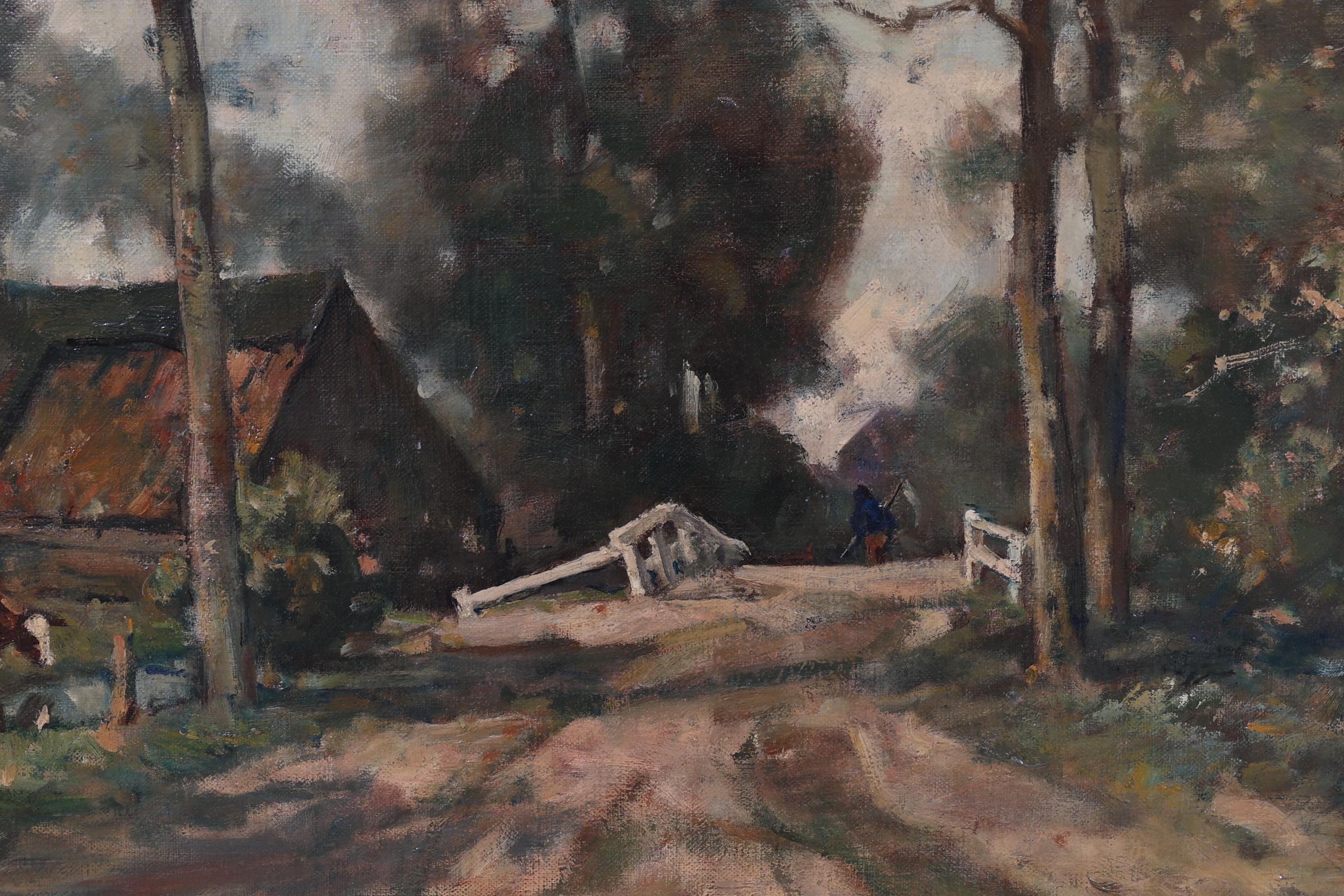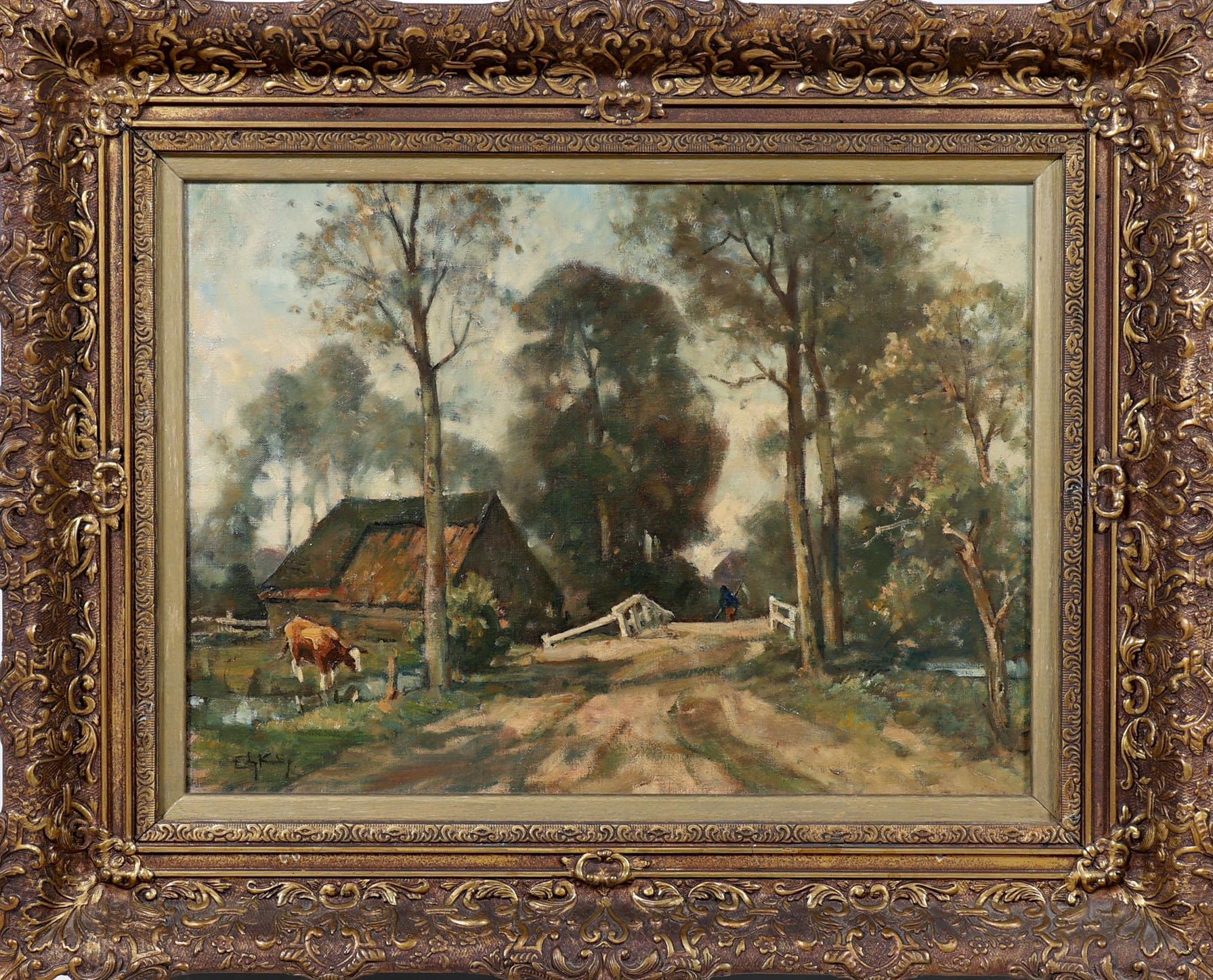 Edzard Willem Koning (1869-1954), Koe langs bospad met boerderij, olieverf op doek, 40 x 55 cm.