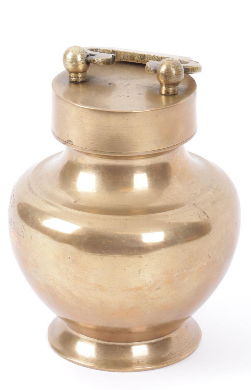 Messing pot met draaideksel voor heilig water, India, h.16 cm.
