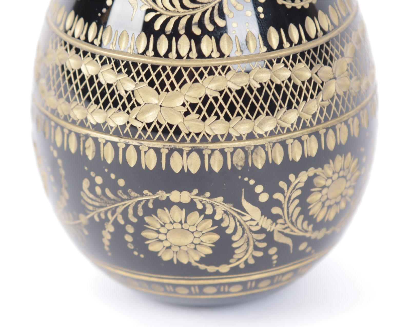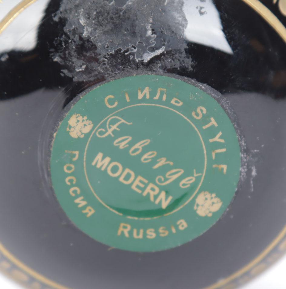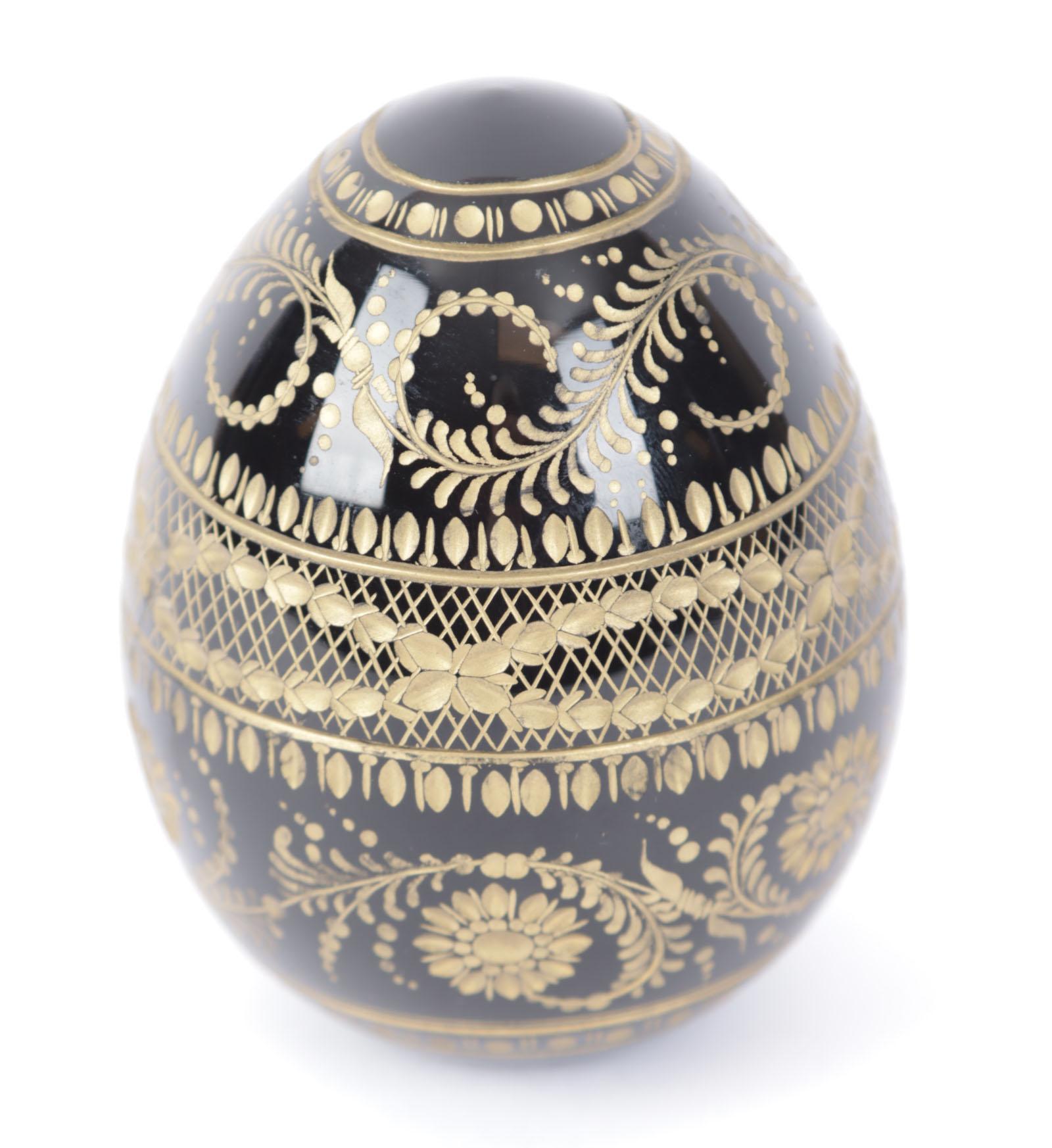 Zwart met goudkleurig glazen Fabergé ei, h.9 cm.