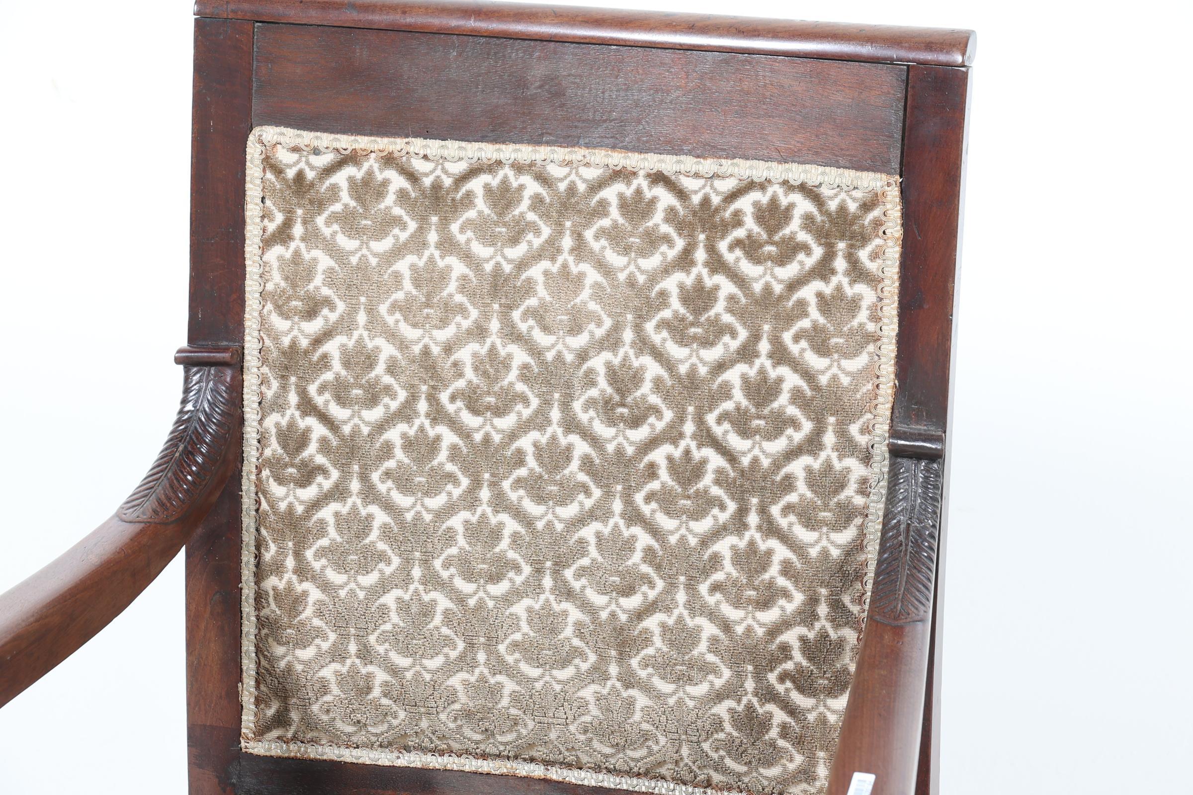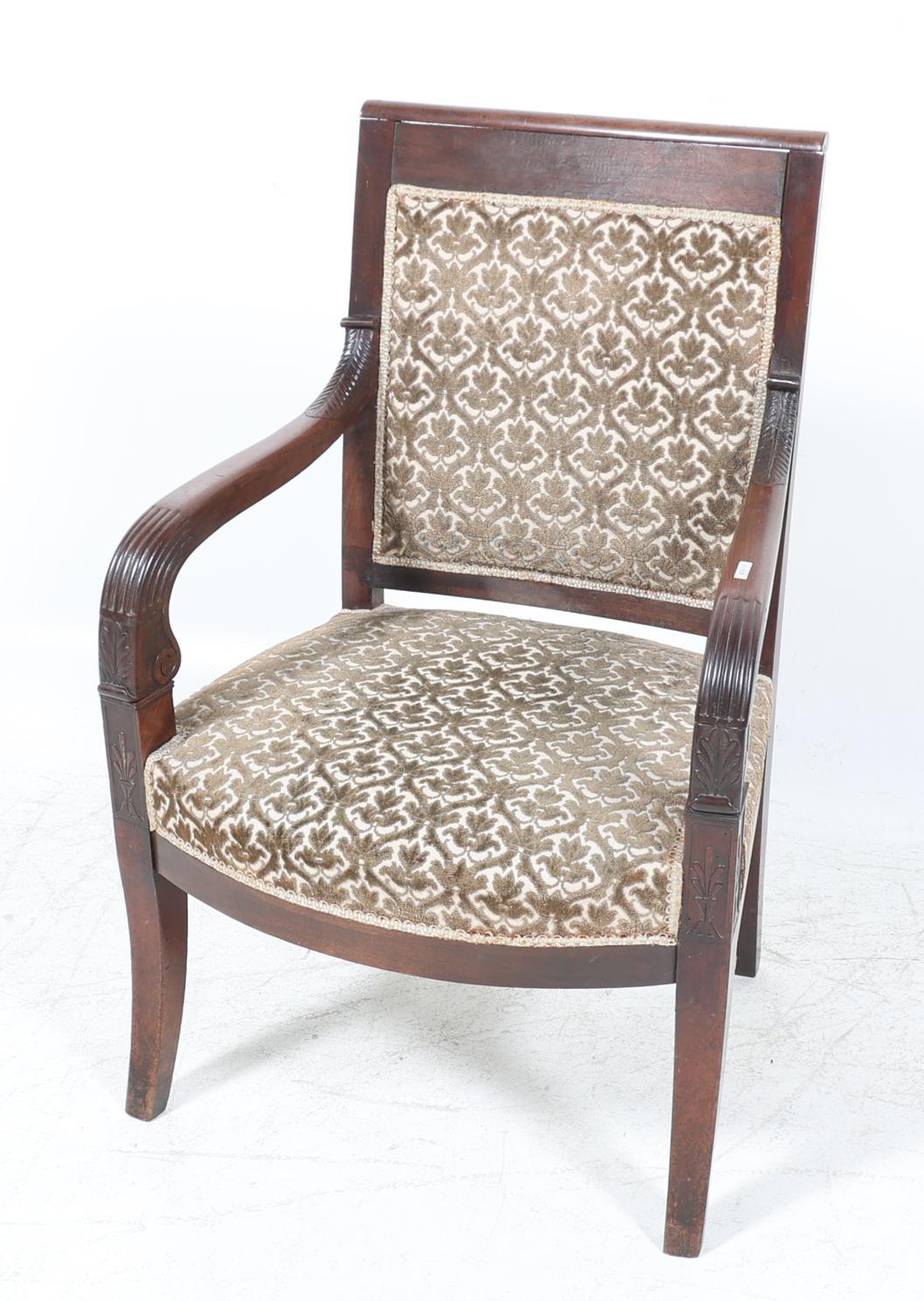 Antieke mahoniehouten empire armfauteuil met bruine stof bekleed