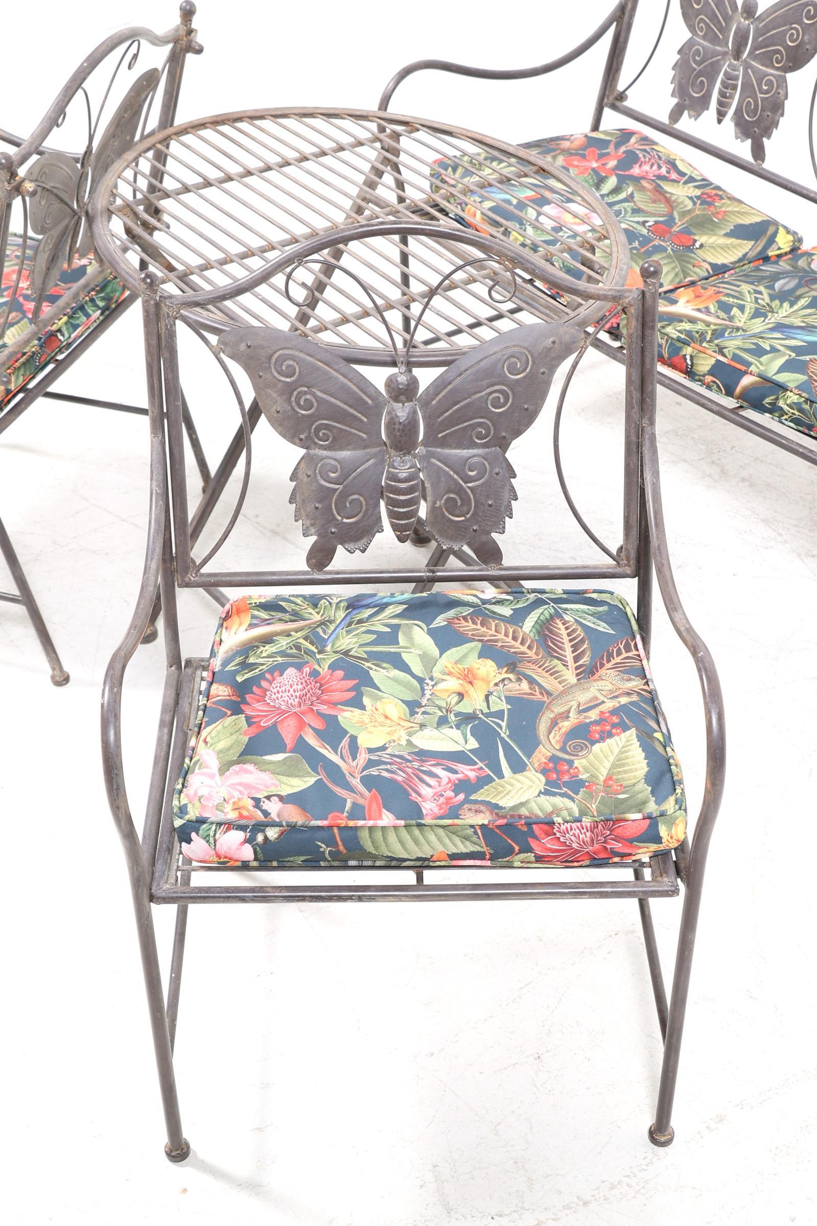 4-delige metalen kinder tuinset bestaande uit een bankje, 2 stoelen en tafel, en met kussen met daarop vogels en bloemen