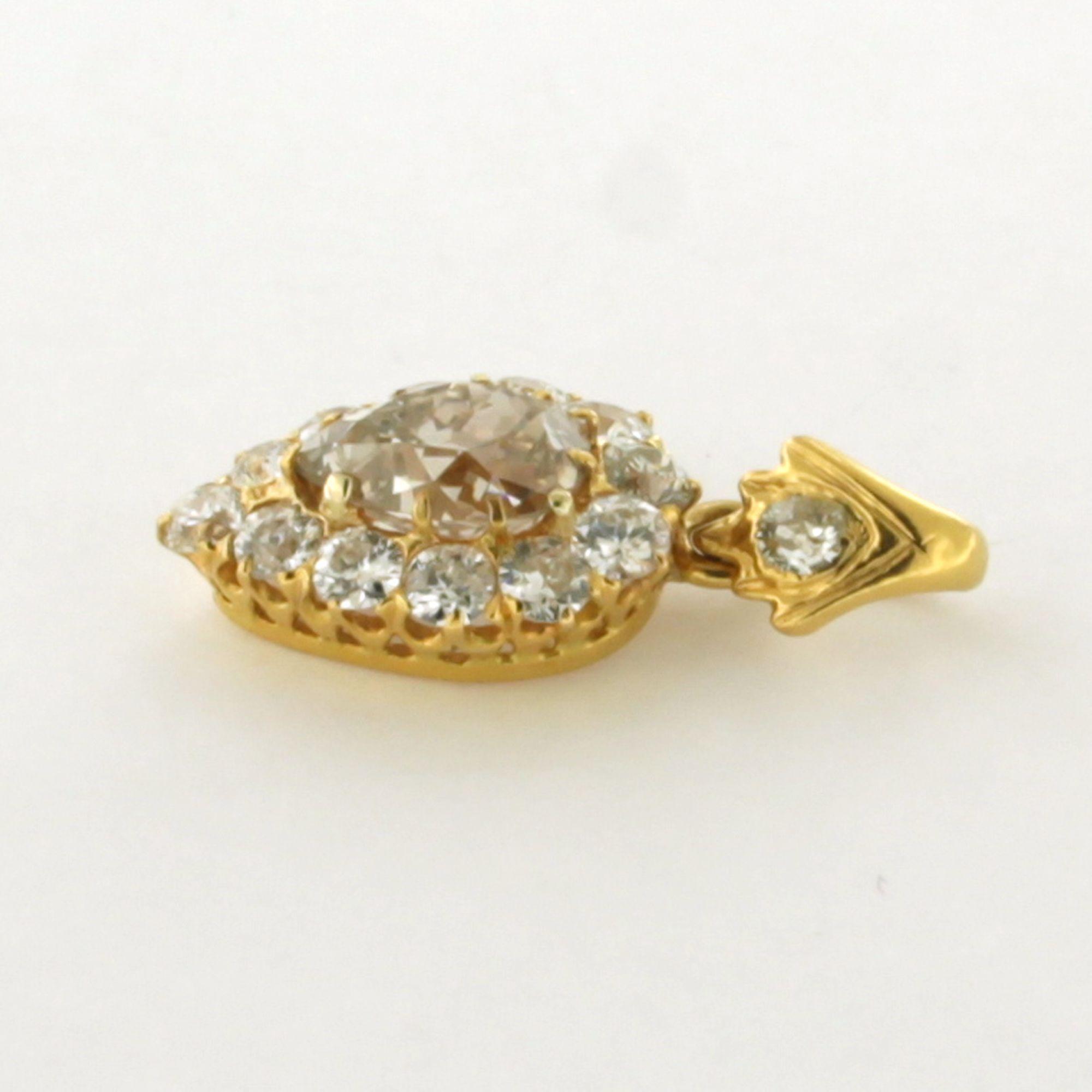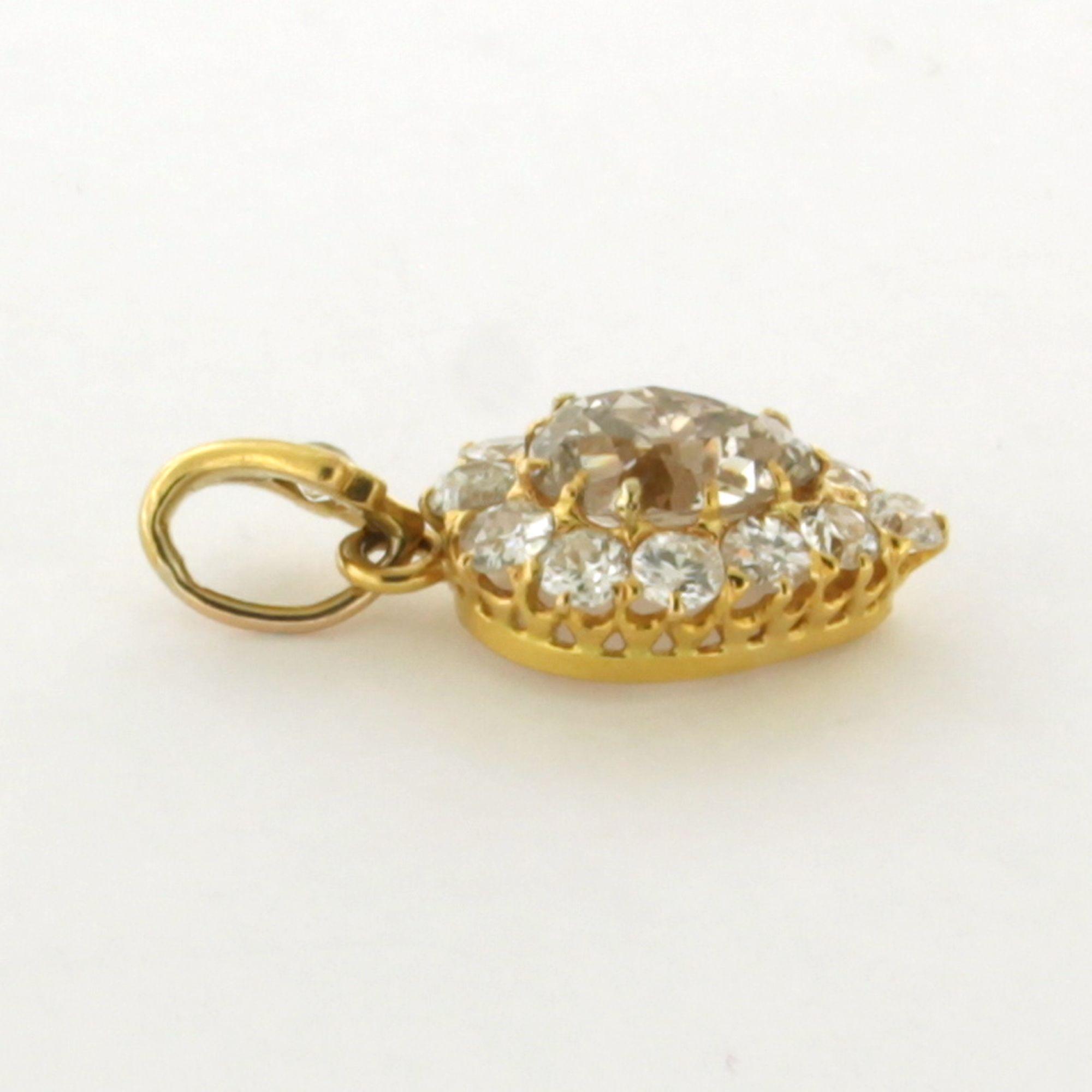 14 Kt. geelgouden hanger bezet met druppelvormige diamant tot. 1,51ct - W-X - SI2 en erom heen Bolsjewiek geslepen diamanten tot. 1,00ct