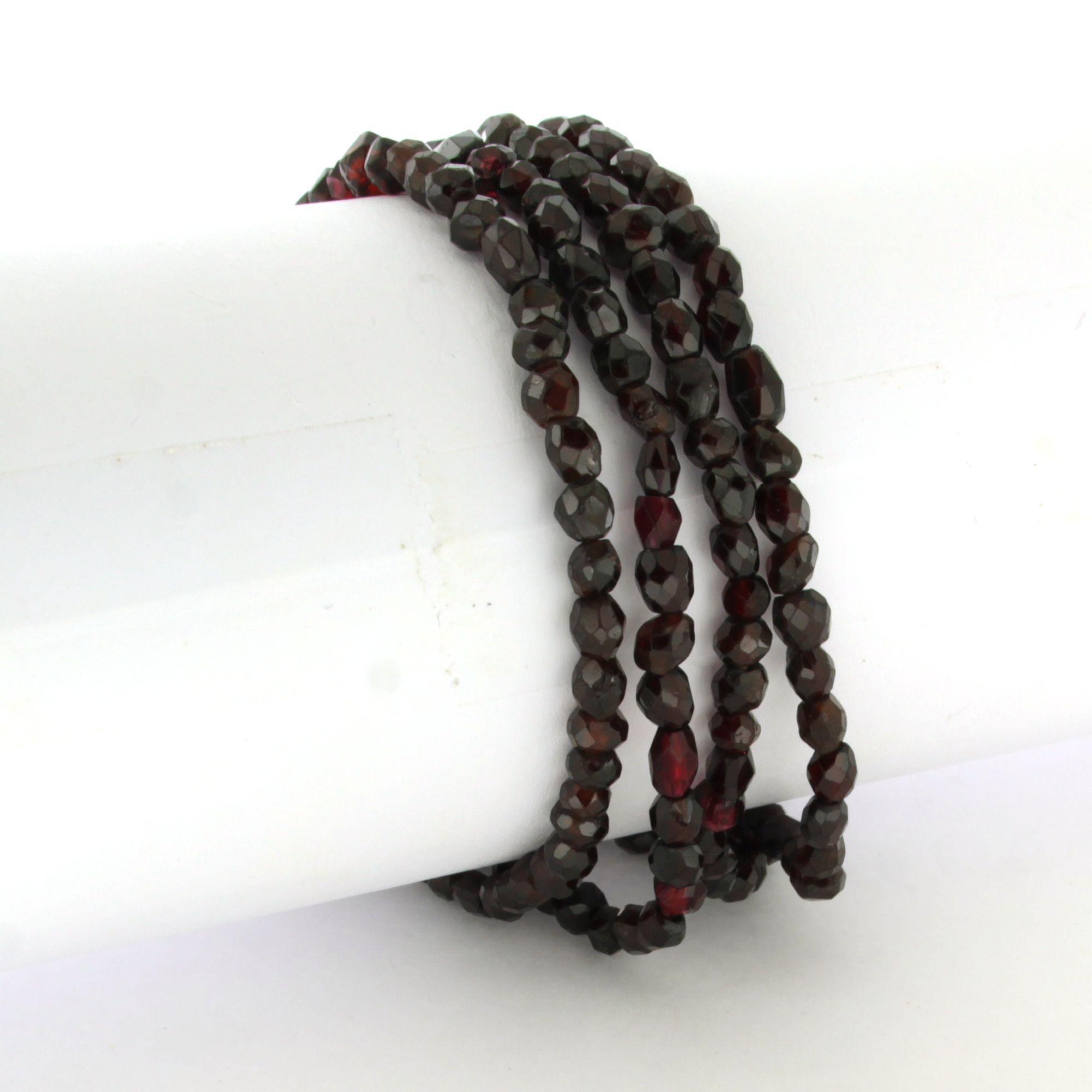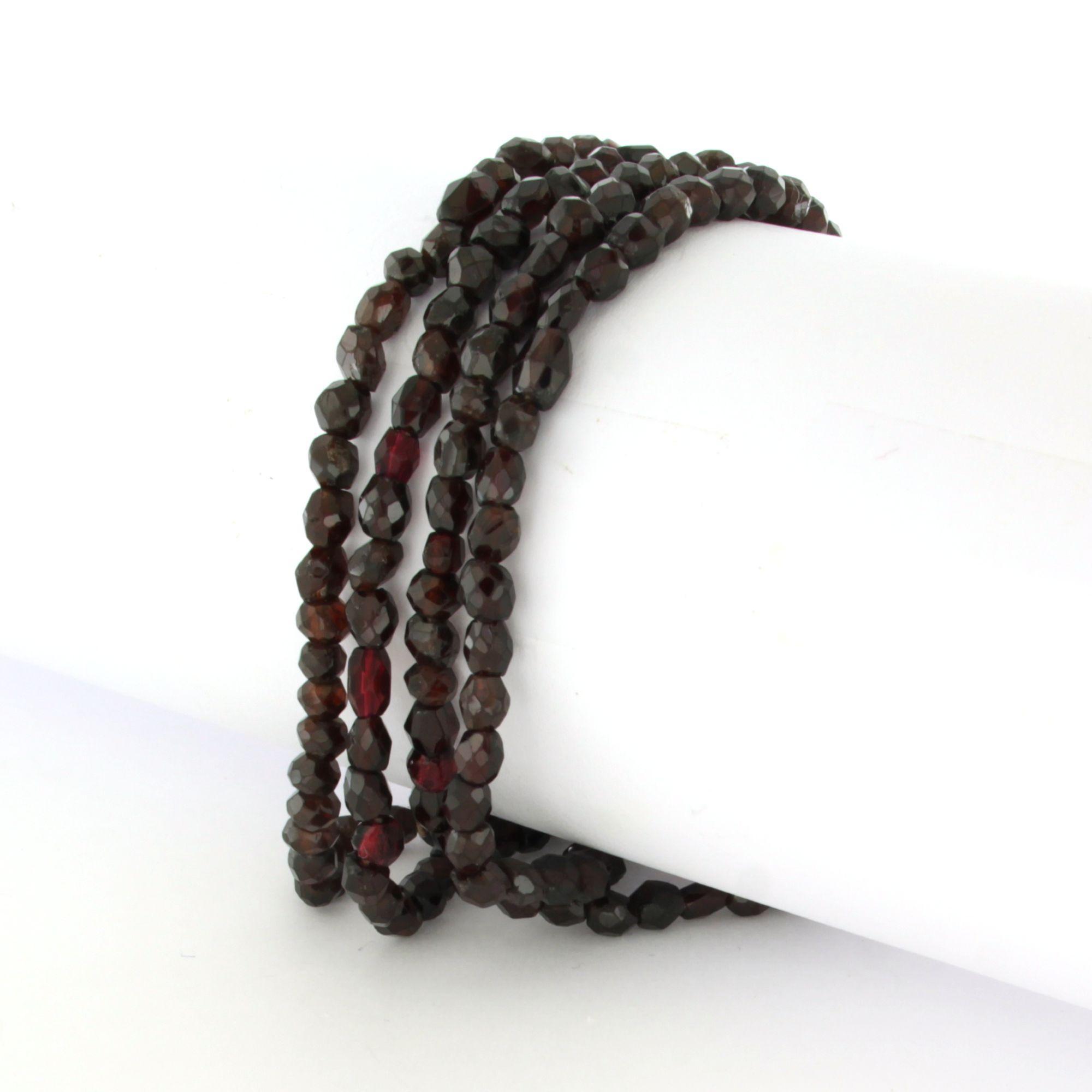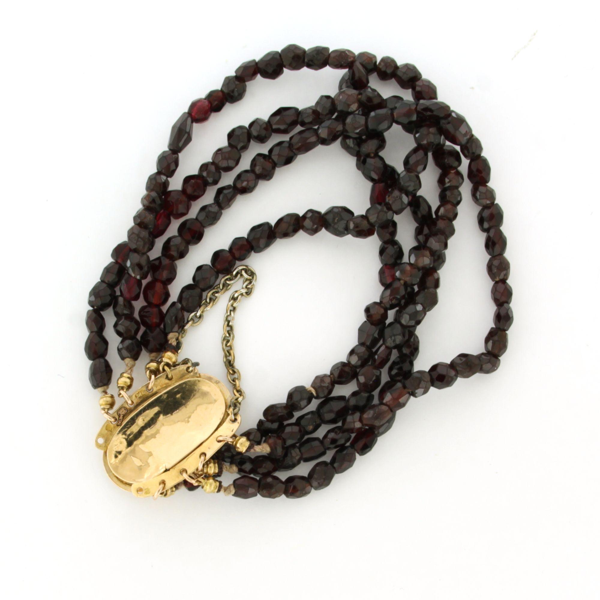 14 Kt. gouden slot aan een vierrijen granaatcollier - lengte circa 20 cm, met veiligheidskettinkje