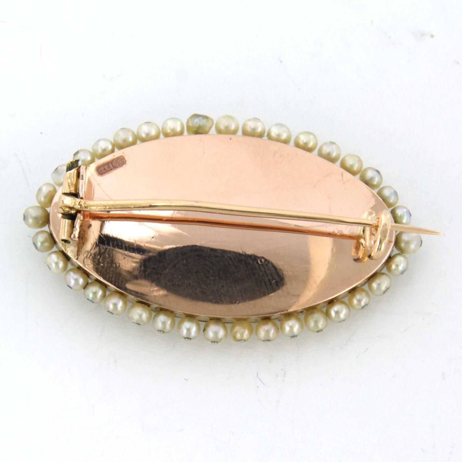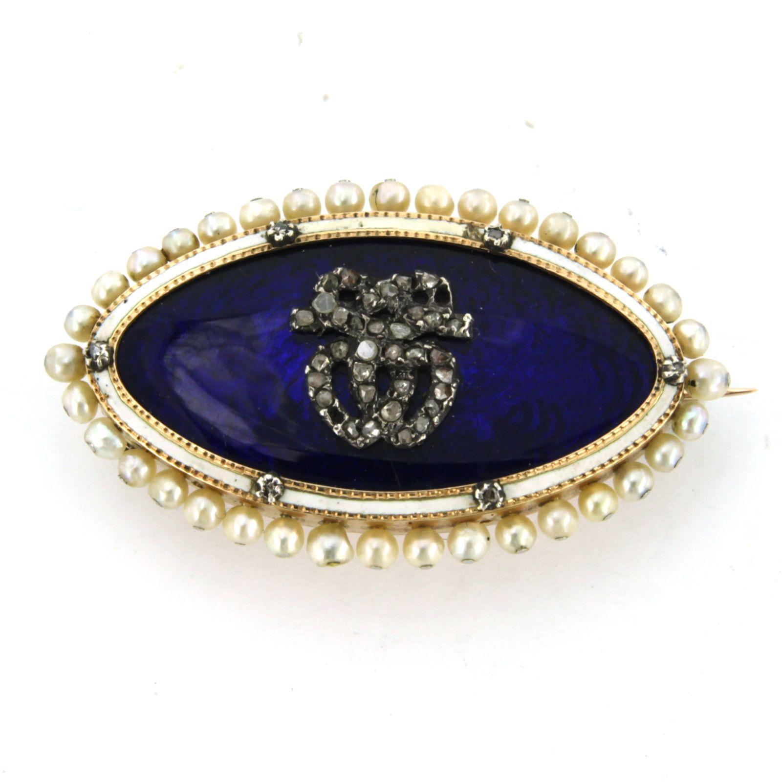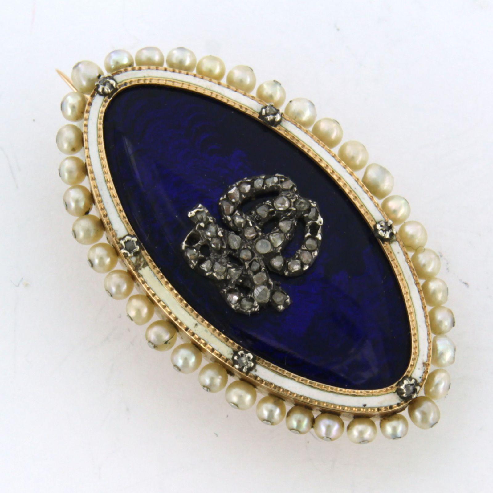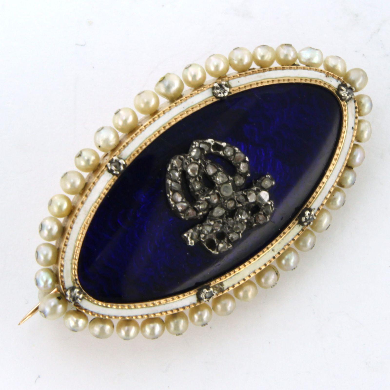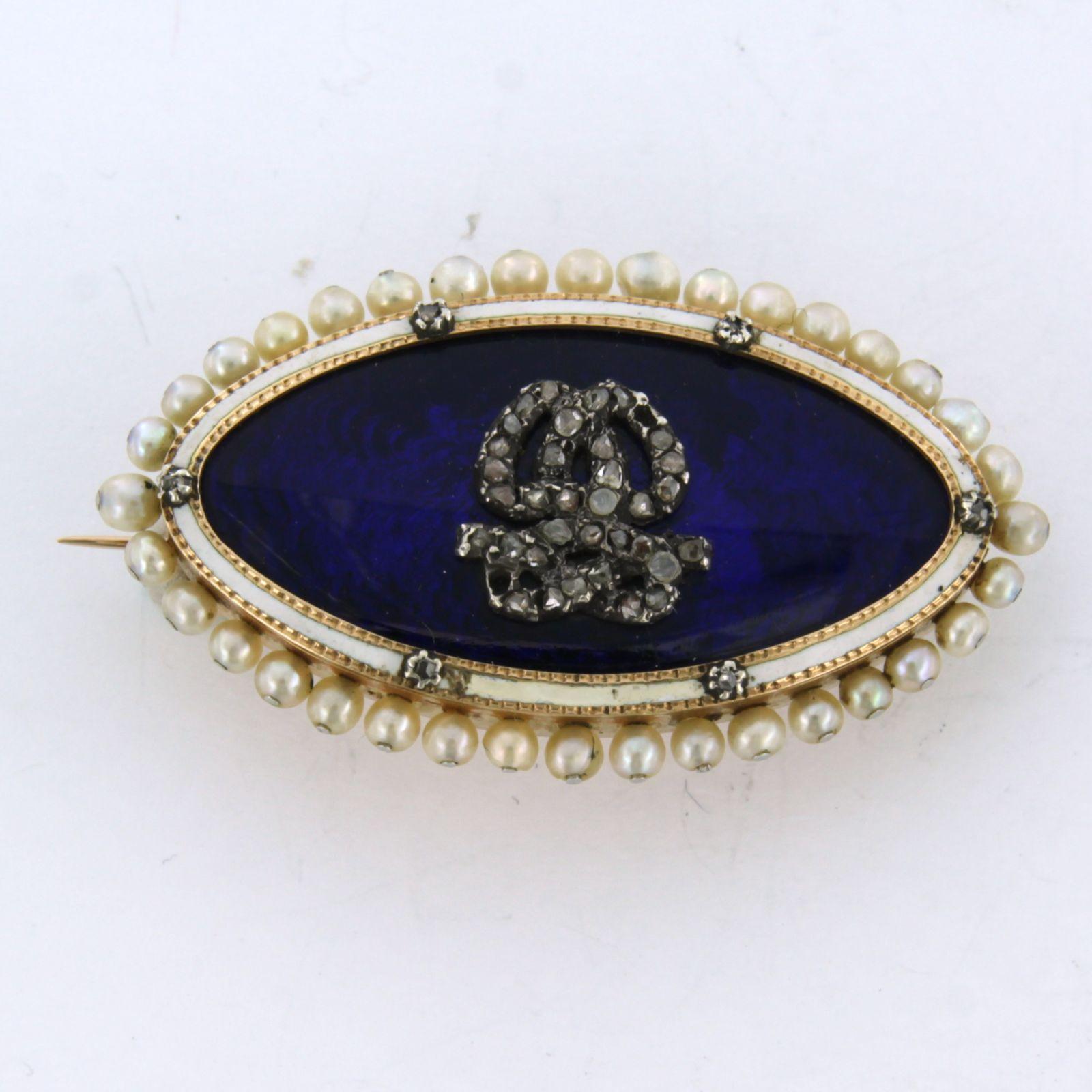 14 Kt. gouden broche versierd met blauwe emaille en bezet met parels en diamant0.10ct