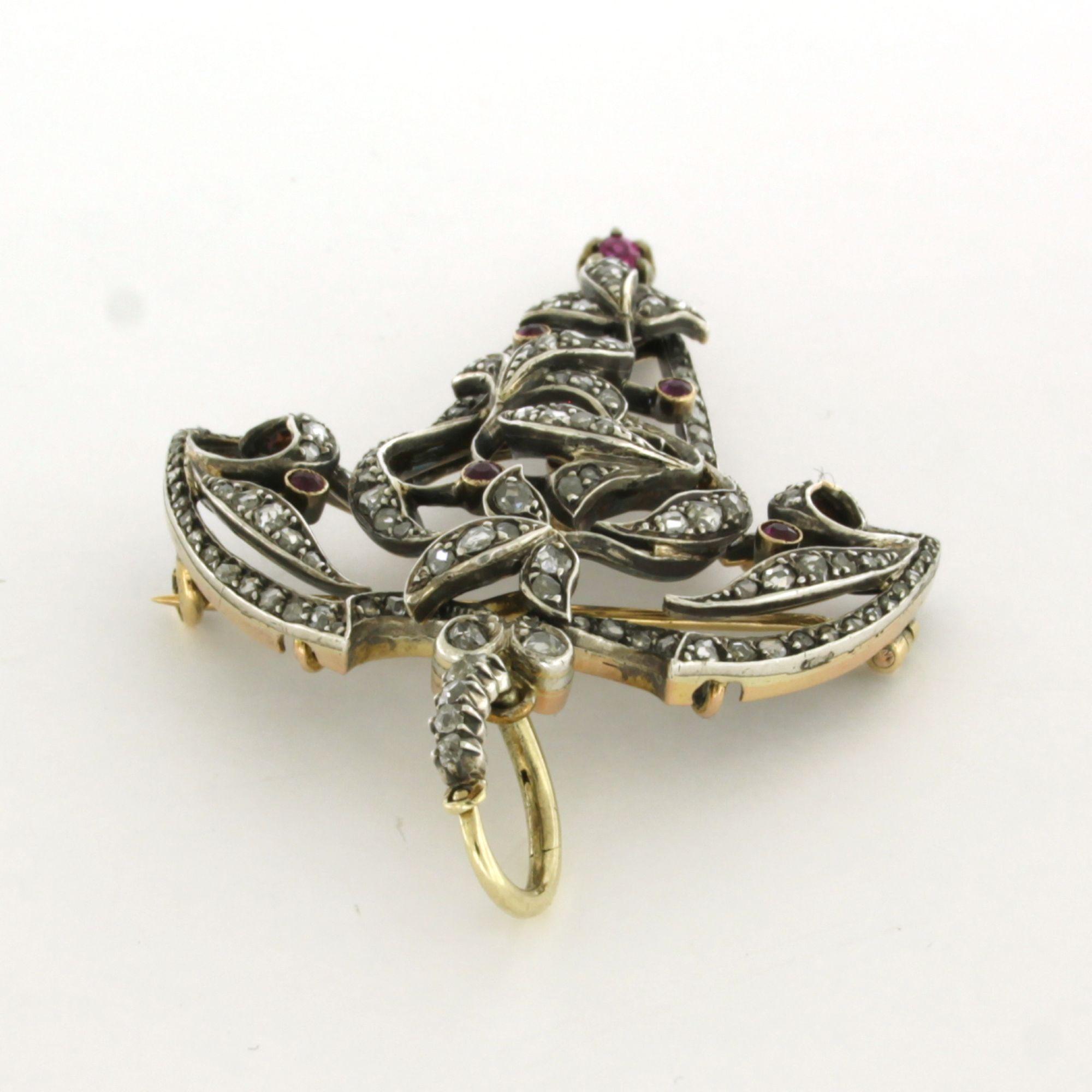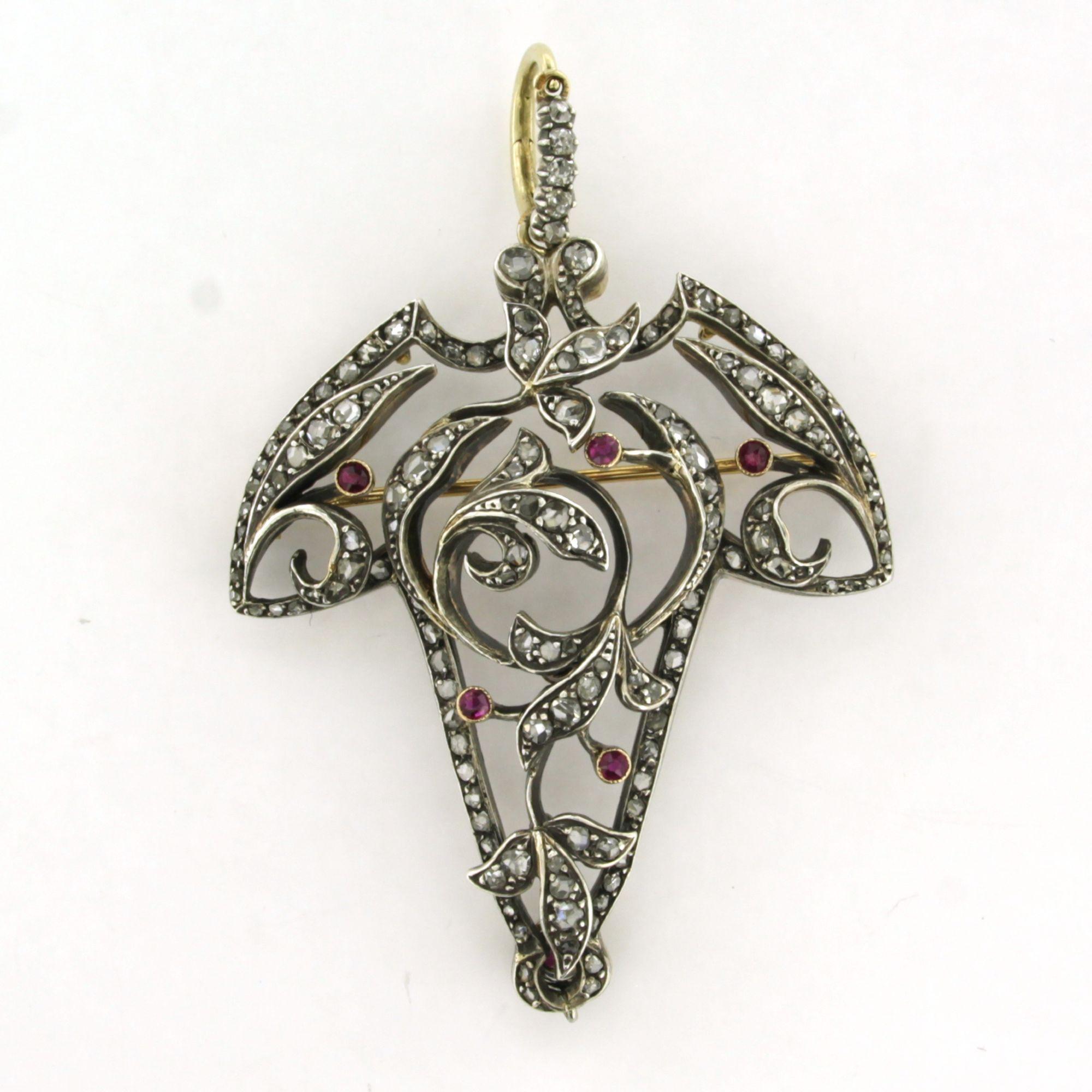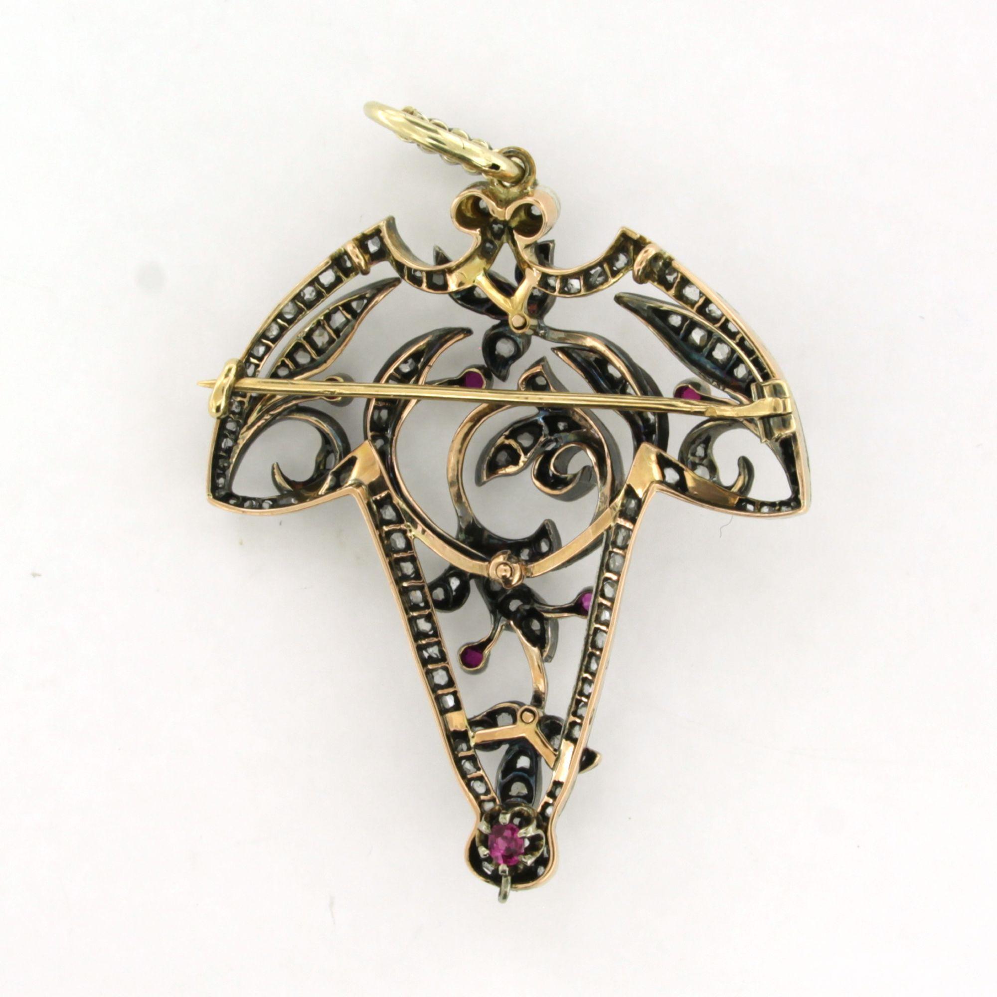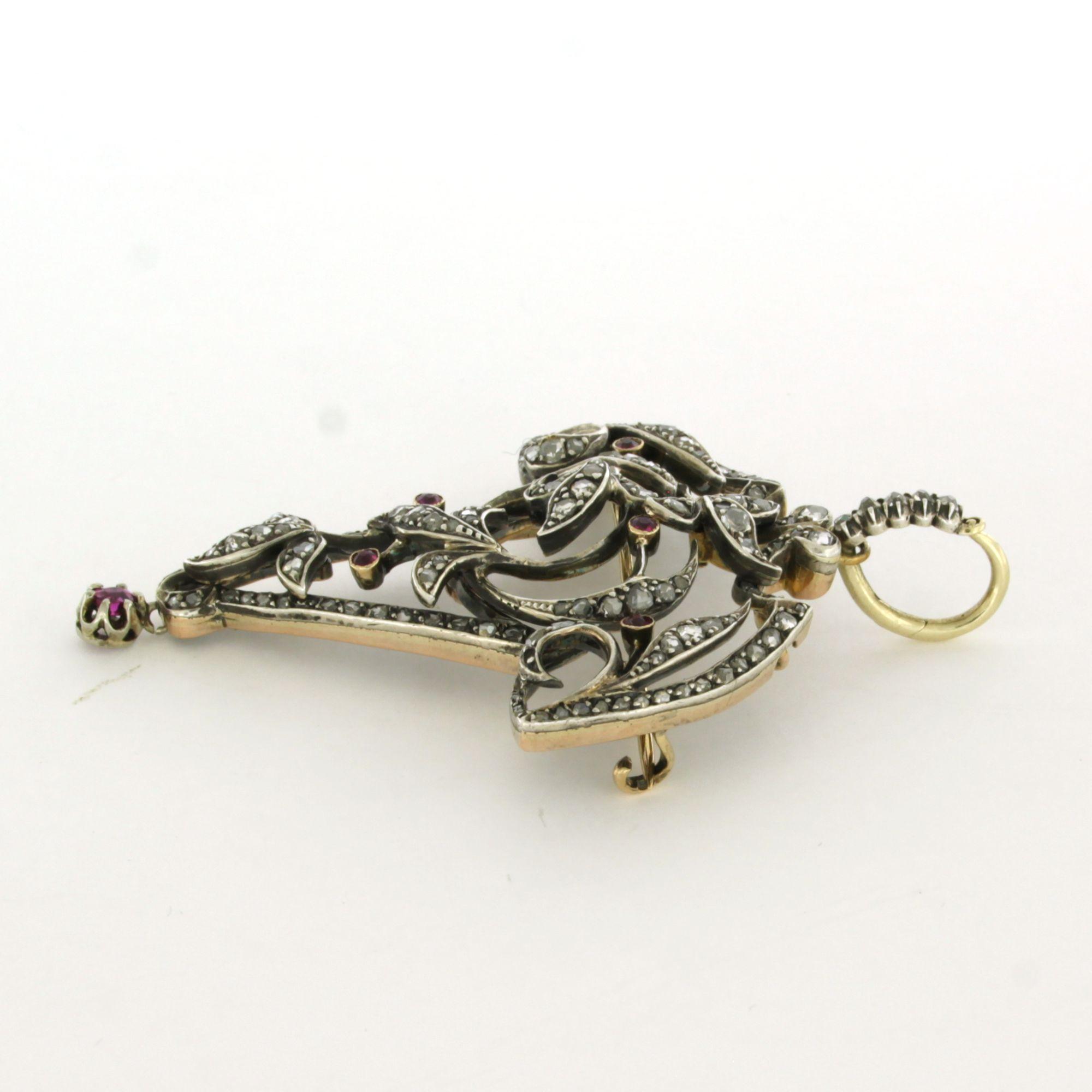 18 Kt. geelgouden met zilveren broche/hanger bezet met robijn en roos diamanten tot. 1,00ct