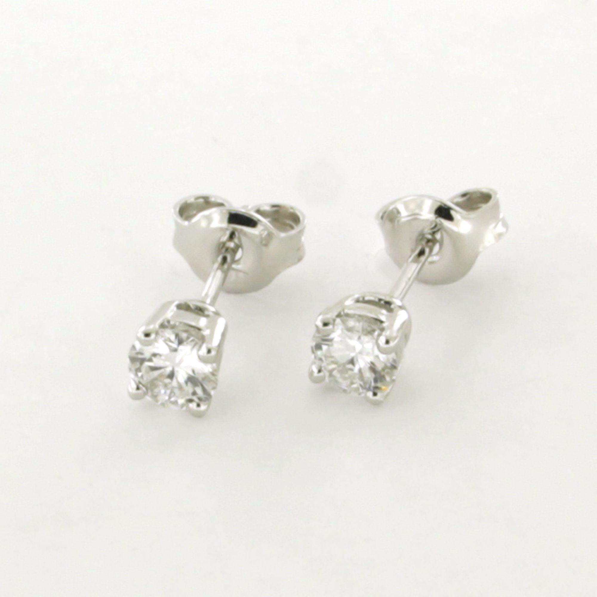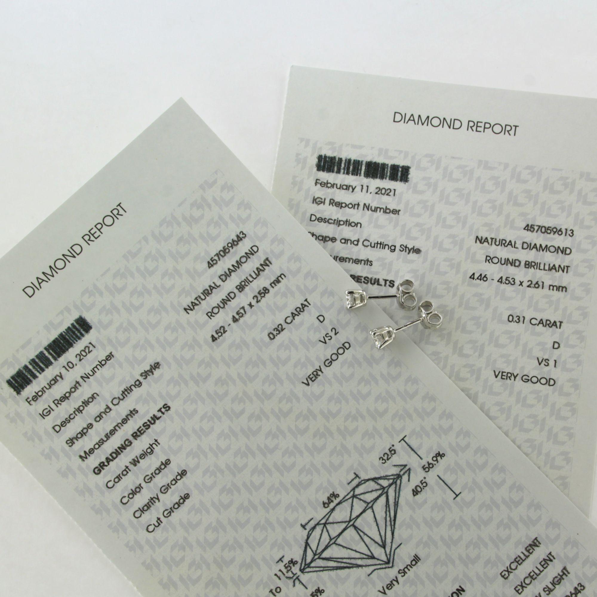 14 Kt. witgouden solitair oorknoppen bezet met briljant geslepen diamanten 0.32ct D-VS2 en 0.31ct D-VS1, de diamanten zijn door IGI onderzocht, diamond report 457059613 en 457059643