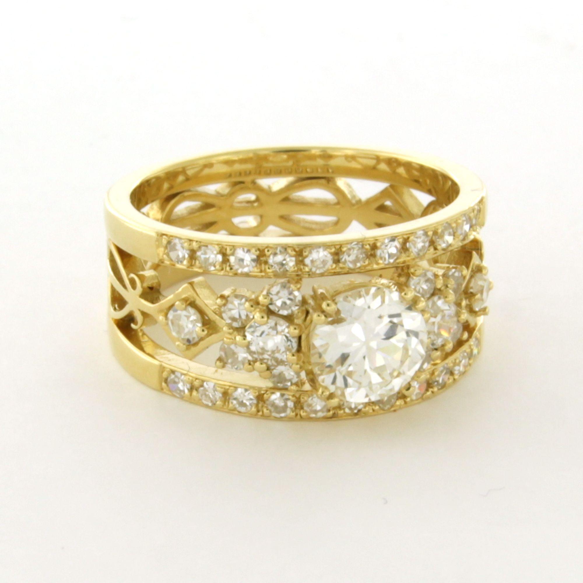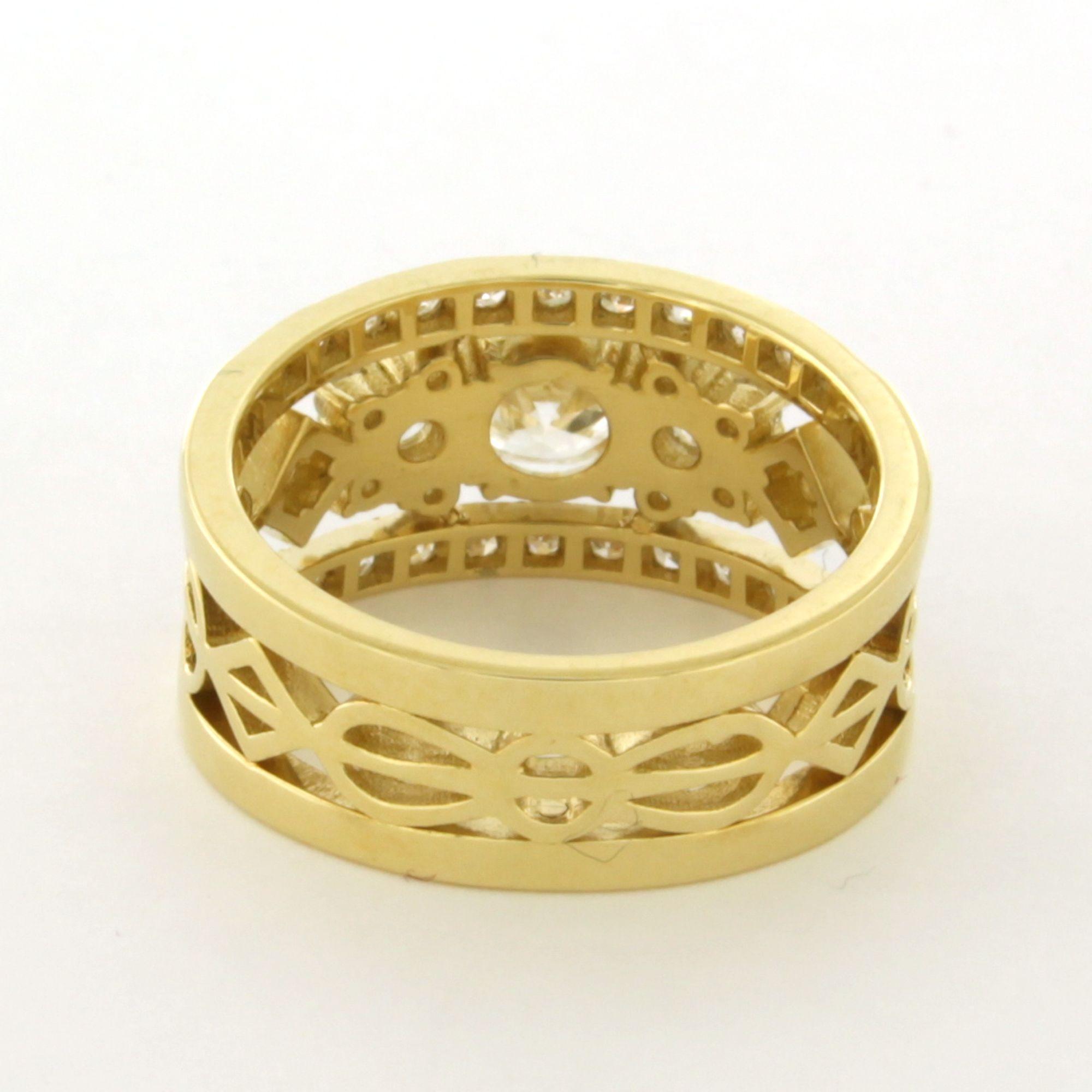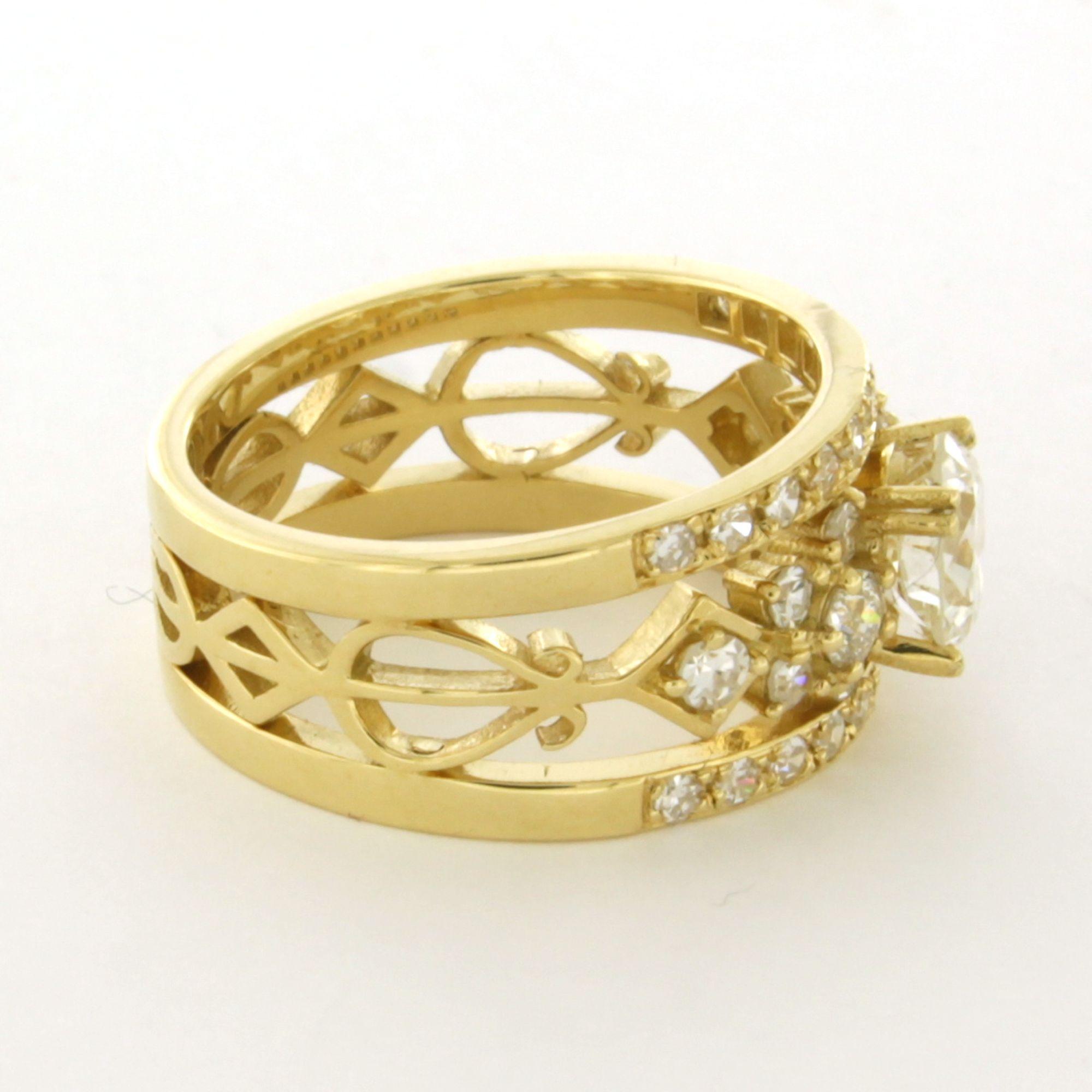 18 Kt. geelgouden bandring met harpmotief bezet met centraal een briljant geslepen diamant 0.94ct en kleinere briljant geslepen diamanten totaal 0.74 ct - ringmaat 17.75(56)
