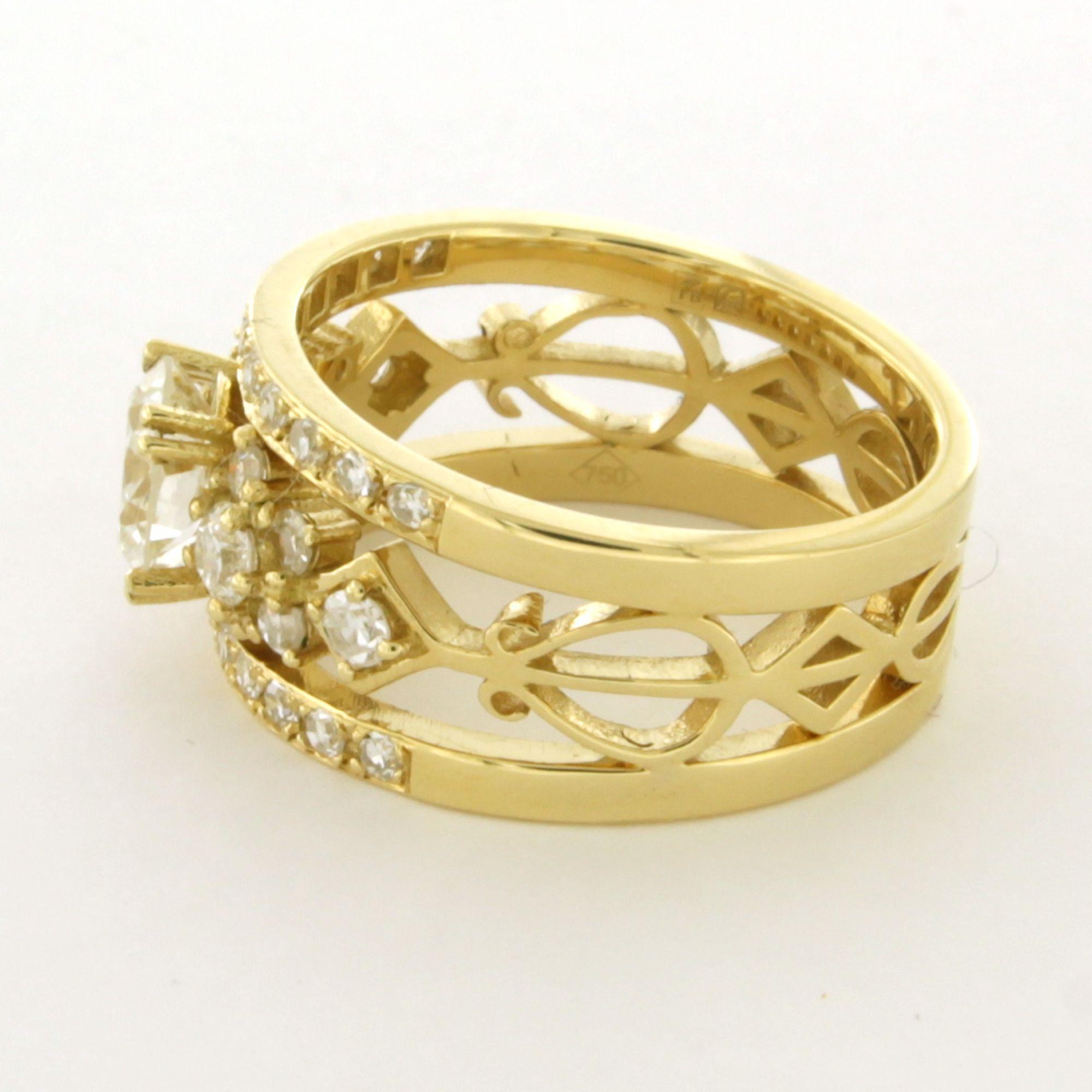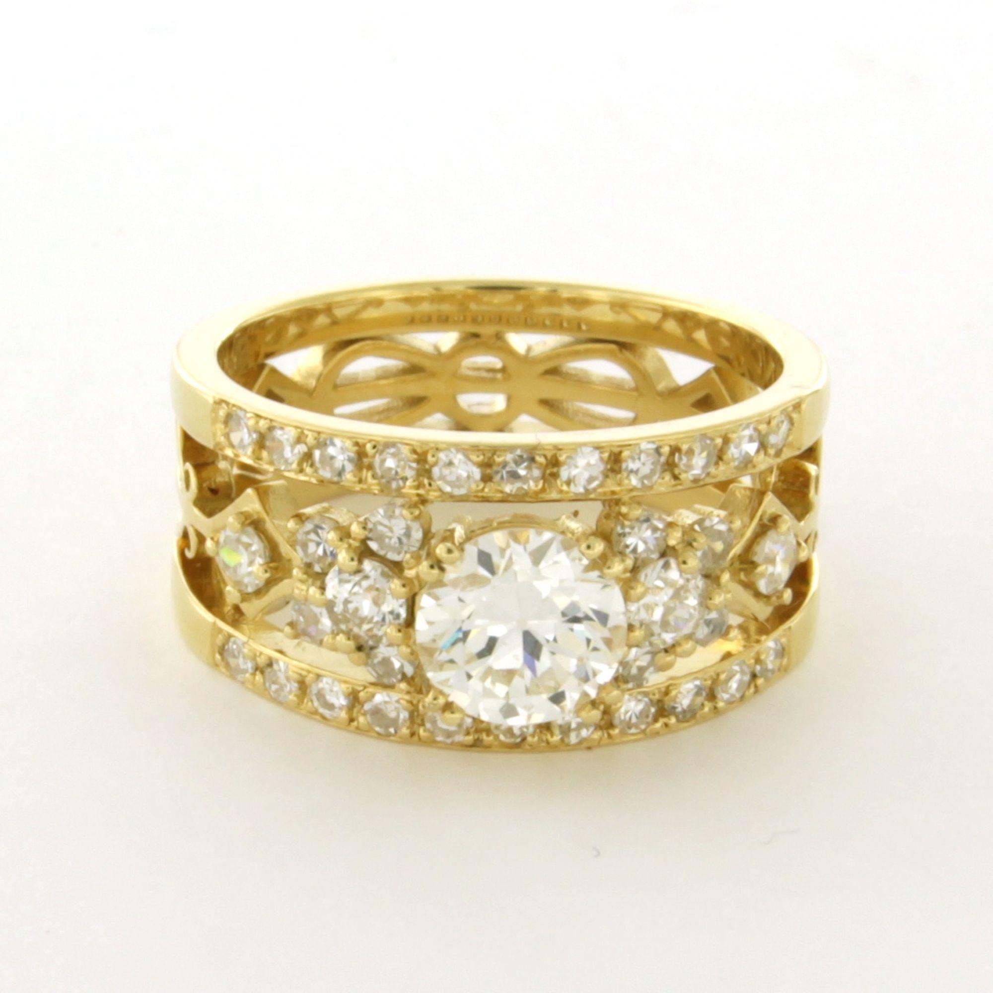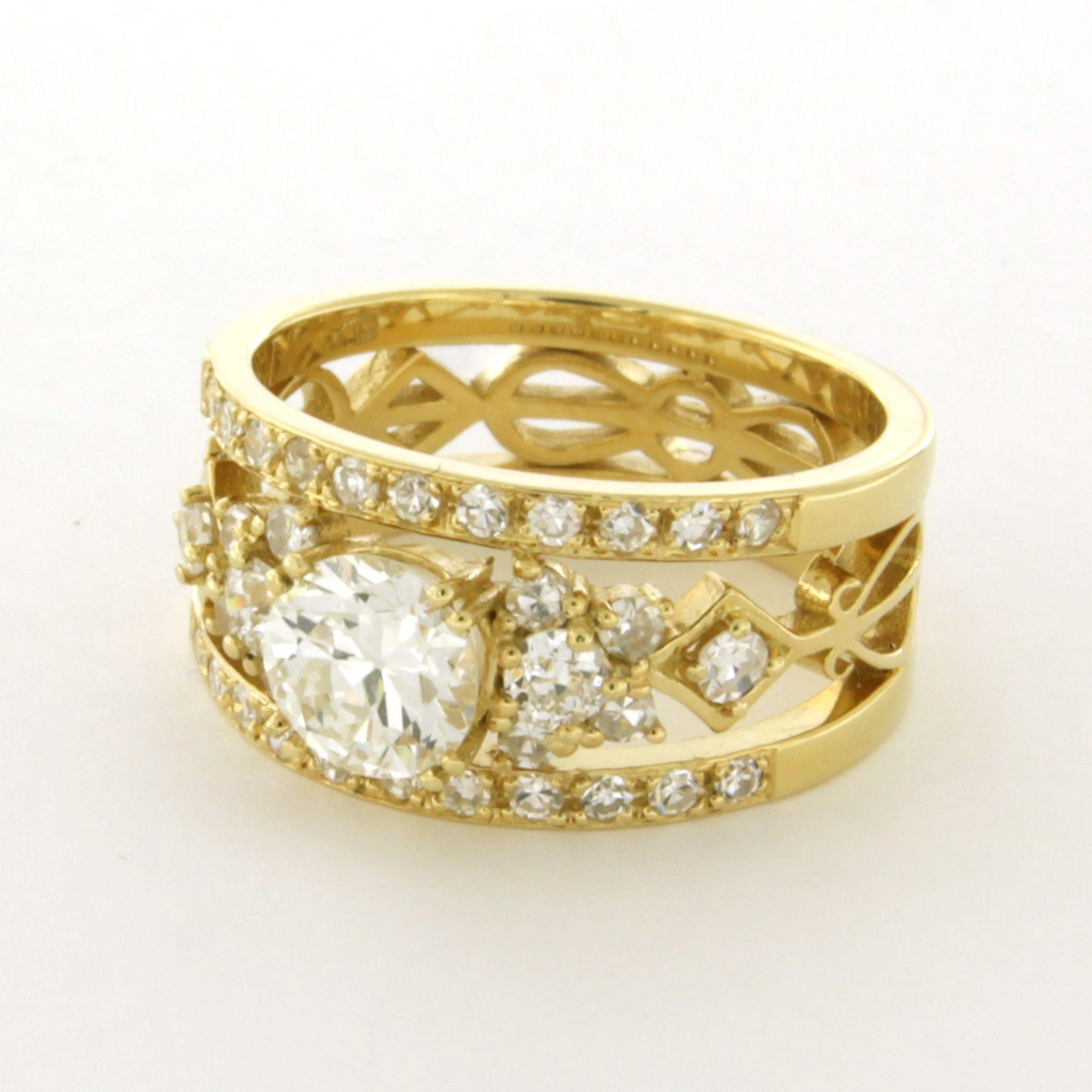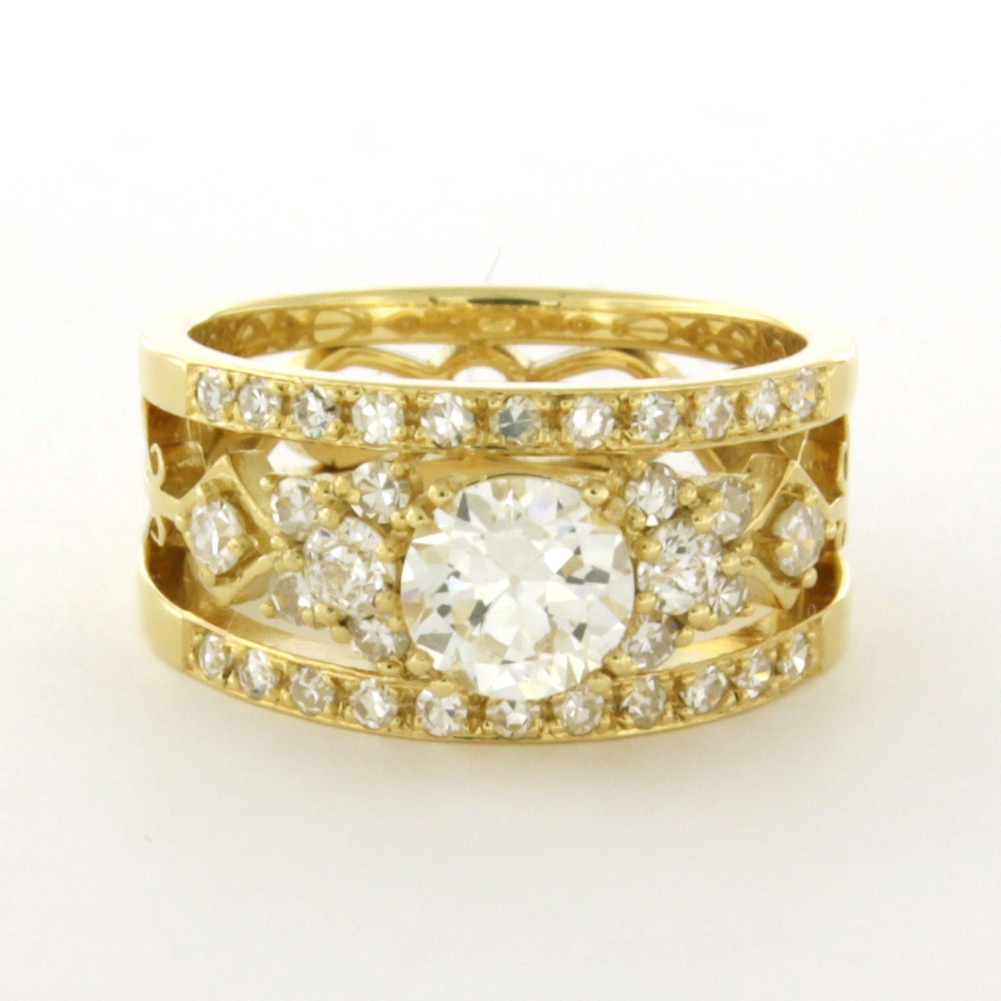 18 Kt. geelgouden bandring met harpmotief bezet met centraal een briljant geslepen diamant 0.94ct en kleinere briljant geslepen diamanten totaal 0.74 ct - ringmaat 17.75(56)