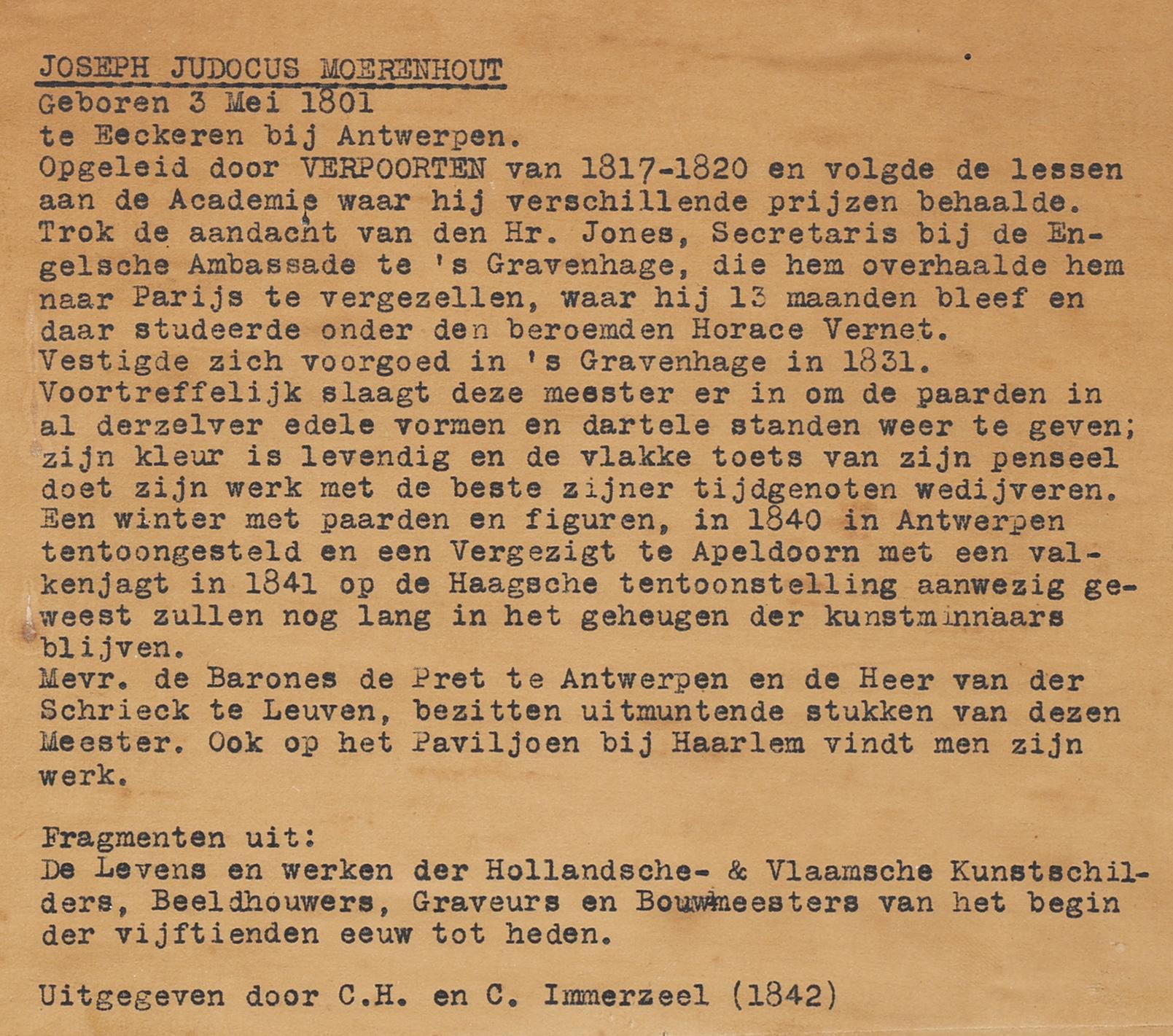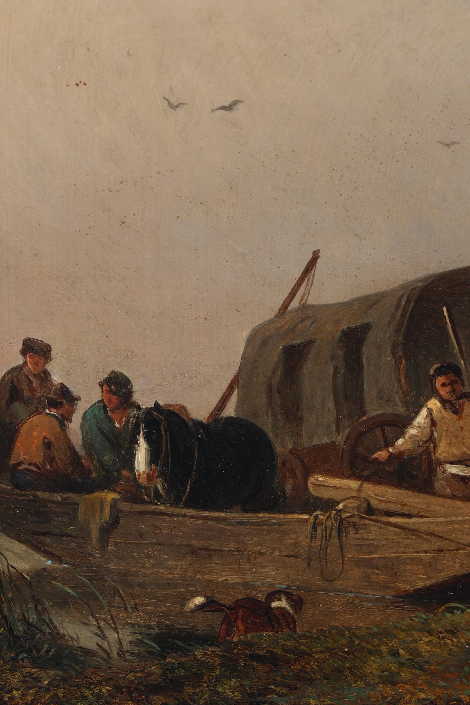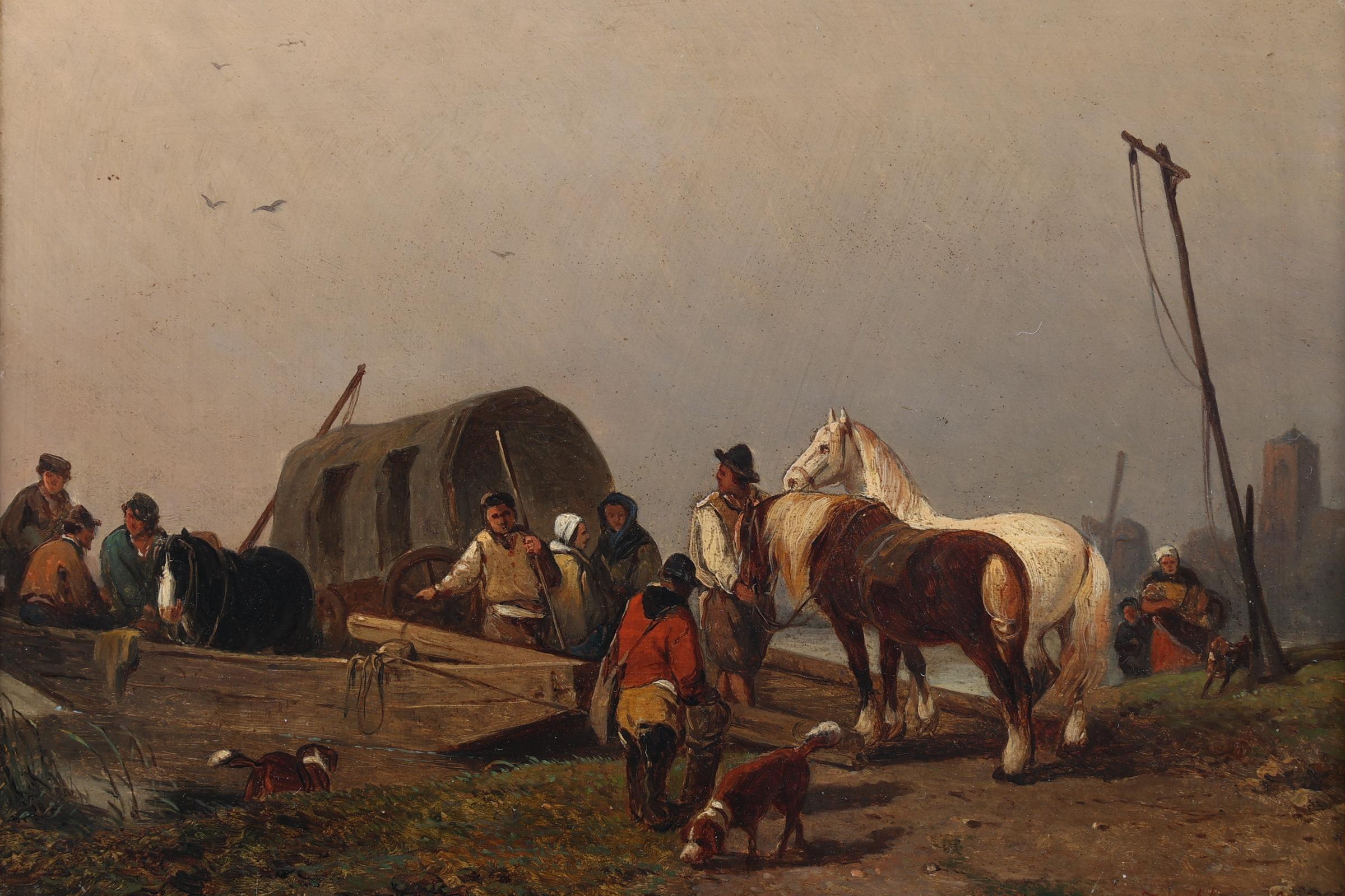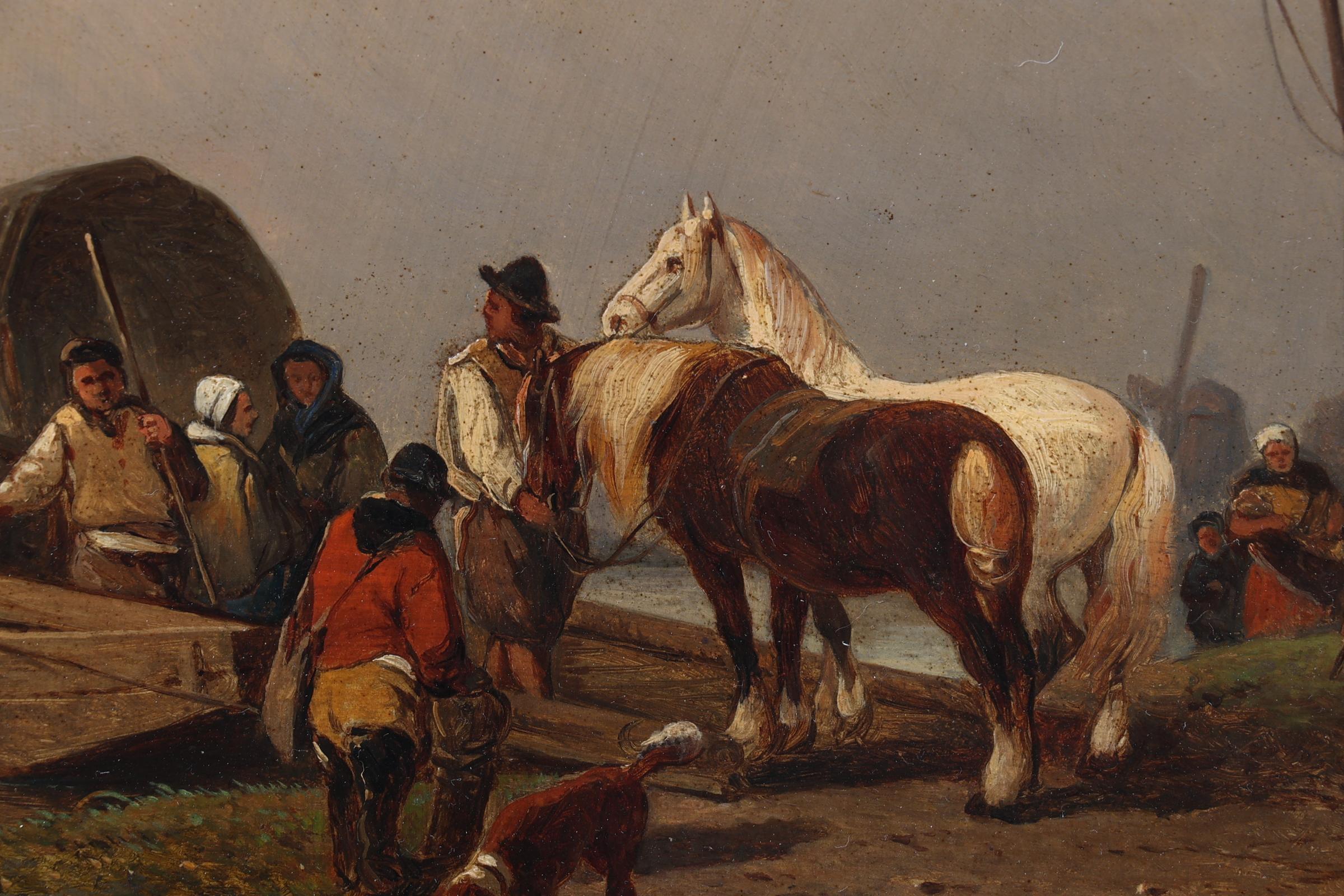 Jozef Jodocus Moerenhout (1801-1875), Personen met paarden langs het water, olieverf op paneel, 23 x 30 cm.