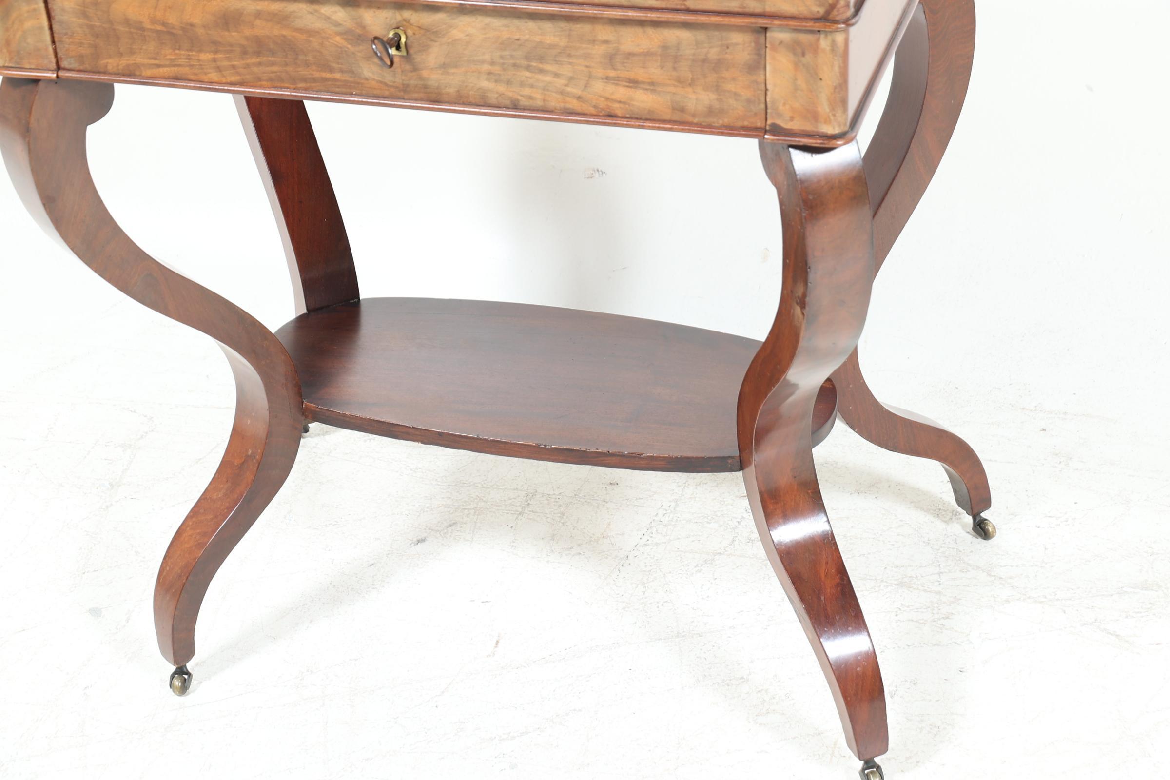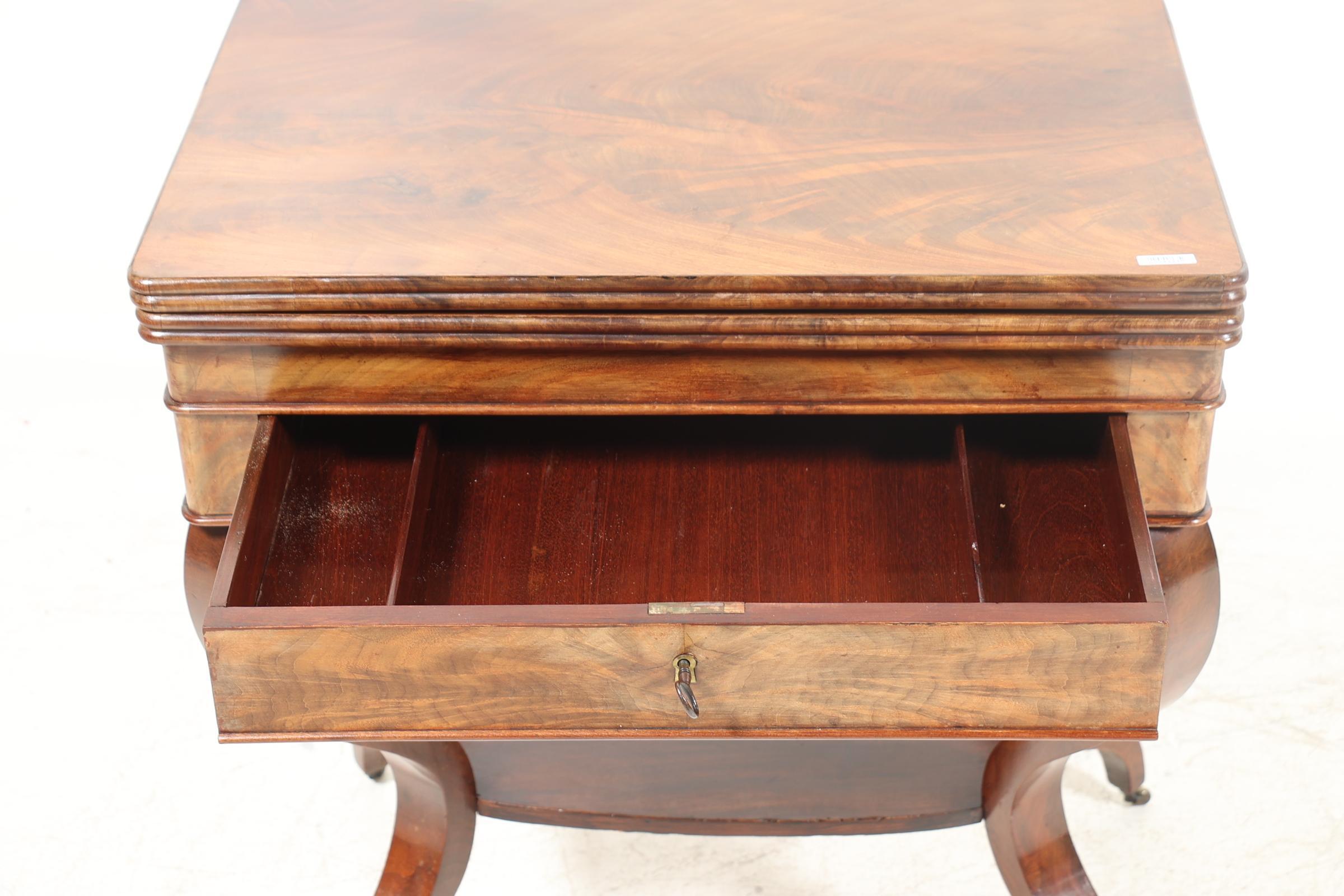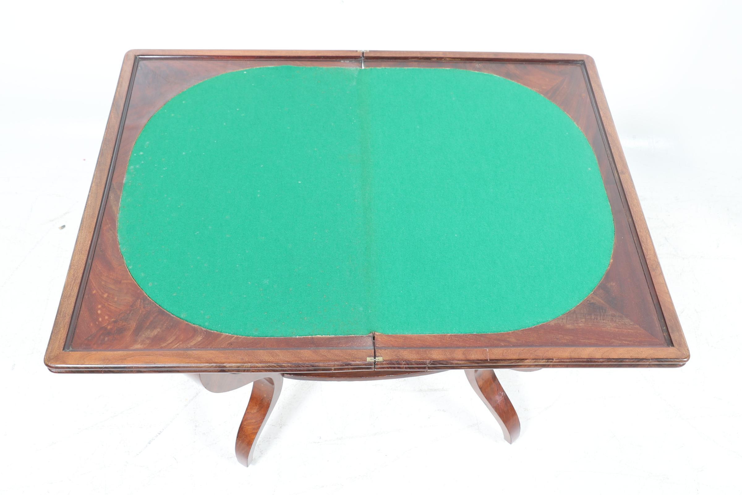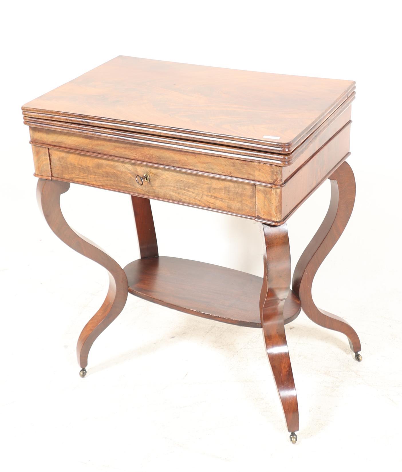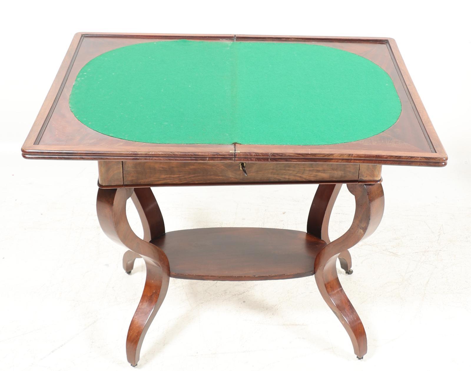 Antieke mahoniehouten speeltafel met groen vilten blad en lade, h.75 x b.65 x d.42 cm.