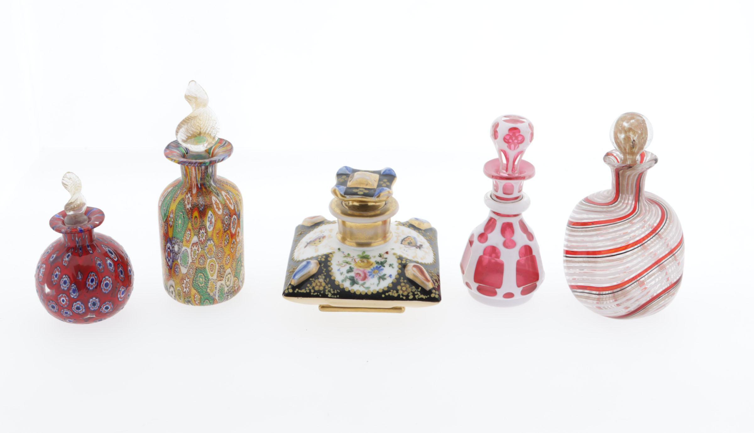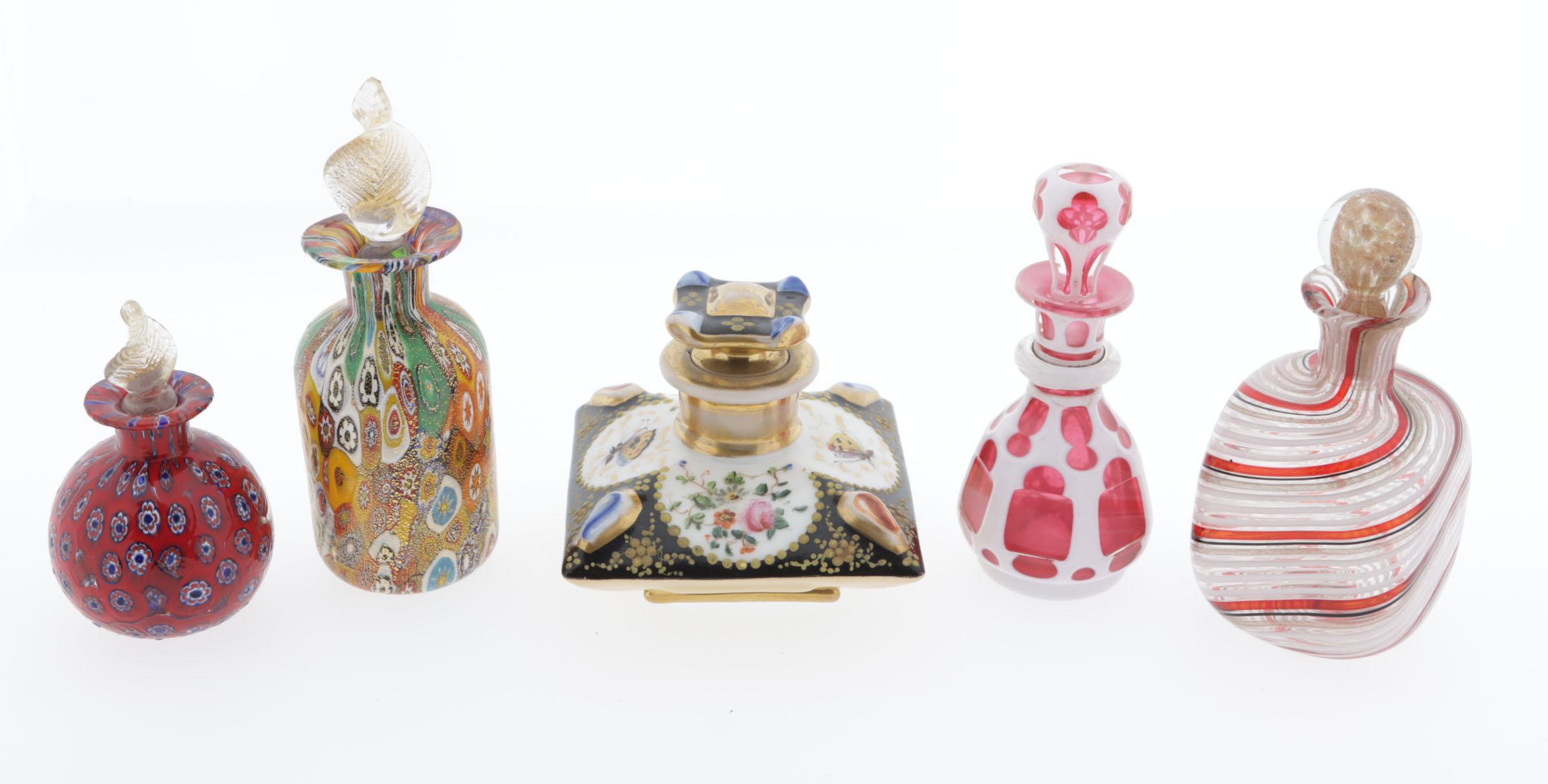 groep van 5 parfumflessen, waaronder: 1 vierkante toilettafel flacon, email beschilderd met bloemen en vlinders, dop en hals goud beschilderd, half 19e eeuw, Frans, hoogte 7 cm, 1 rood/witte ueberfang parfumfles, biedermeier, 1830, hoogte 11 cm, 1 rood rond Murano Millefiori flesje, hoogte 8 cm, 1 meerkleurig Murano Millefiori flesje, jaren 80, hoogte 12 cm, 1 afgerond vierkantig Murano glas flesje met rode, witte, zwarte en gouden swirl strepen, hoogte 11 cm, mid century