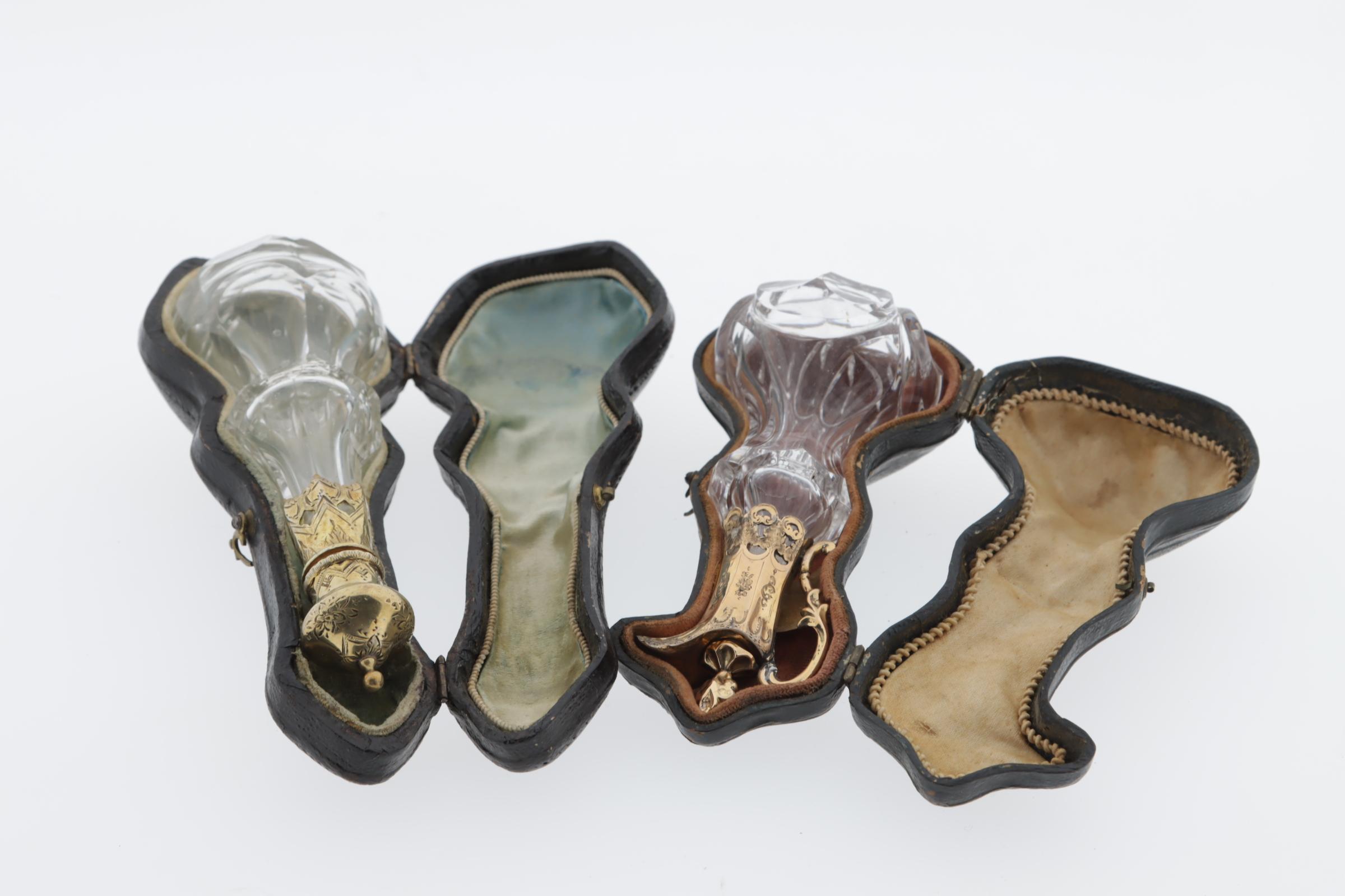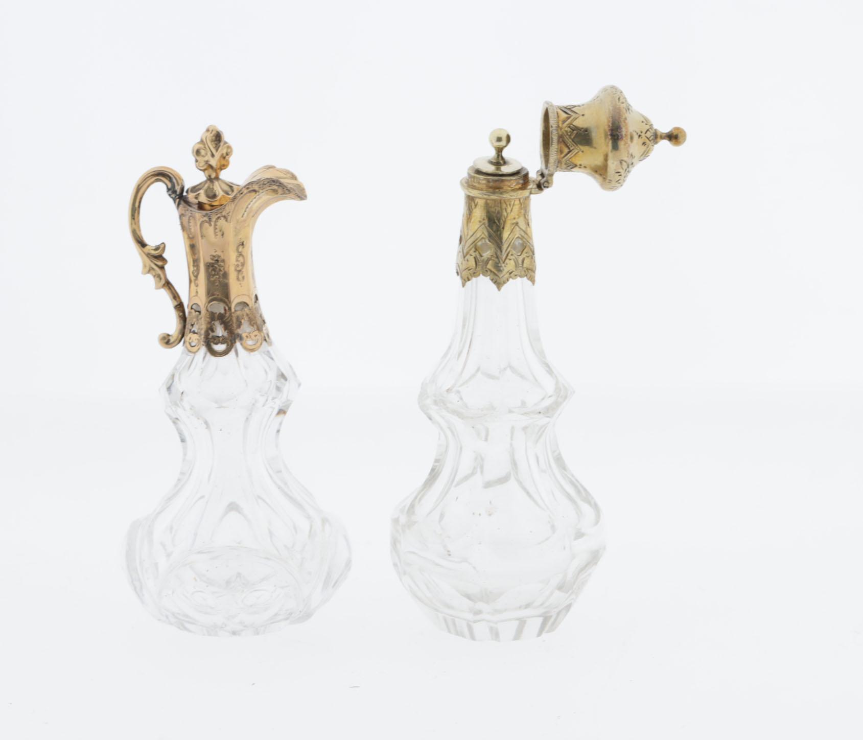 2 kristallen parfumflessen in leren foudralen, 1 in de vorm van een kannetje, gouden montuur en -stopje, 19e eeuw, hoogte 10 cm, 1 kristallen fles met verguld zilveren montuur, scharnierende dop met binnenstopje, Frans, hoogte 12 cm