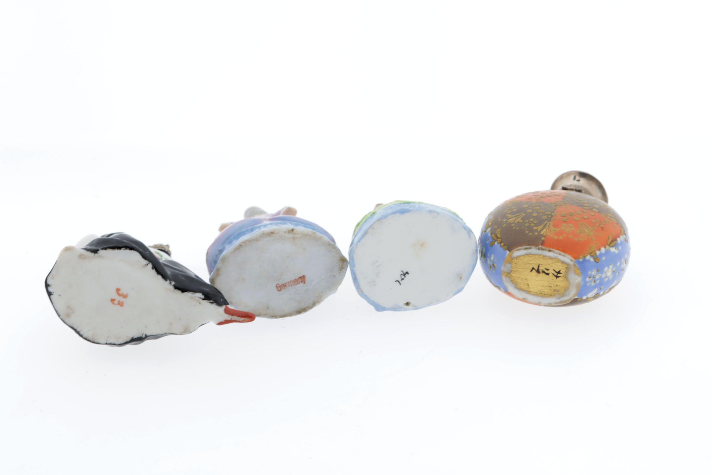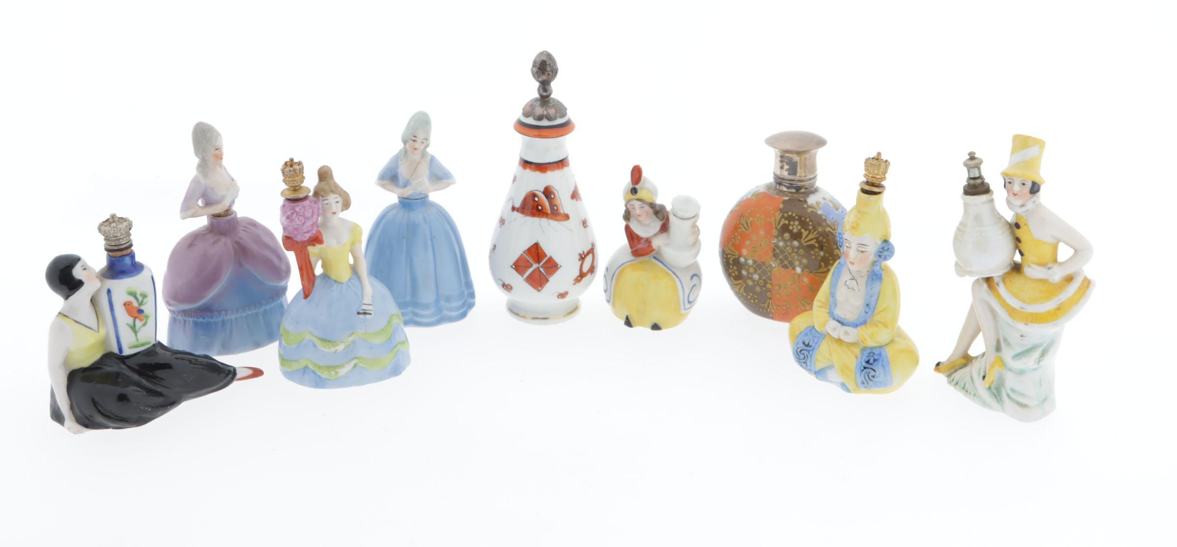 9 porceleinen parfumflessen, waaronder 3 vrouwtjes in rococo kleding, begin 20e eeuw, Duits, hoogte 9 cm, 1 zittende carnavalsdame met hoge hoed die fles omarmt, gemerkt Germany 15757, rond 1900, hoogte 10,5 cm, 1 flesje met krijgermotief en zilveren dop, Nederlands gekeurd, 2e helft 19e eeuw, hoogte 11,5 cm, 1 japans Satsuma porseleinen flesje met zilveren scharnierende dop, hoogte 8 cm, 1 zittend vrouwtje met flesje op schoot, kroonkurkje, hoogte 7 cm, 1 zittend mannetje, geel/blauw, Sitzendorf 23850, kroonkurk, hoogte 9 cm, 1 flesje van zittend vrouwtje met tulband en pot in hand, hoogte 7 cm