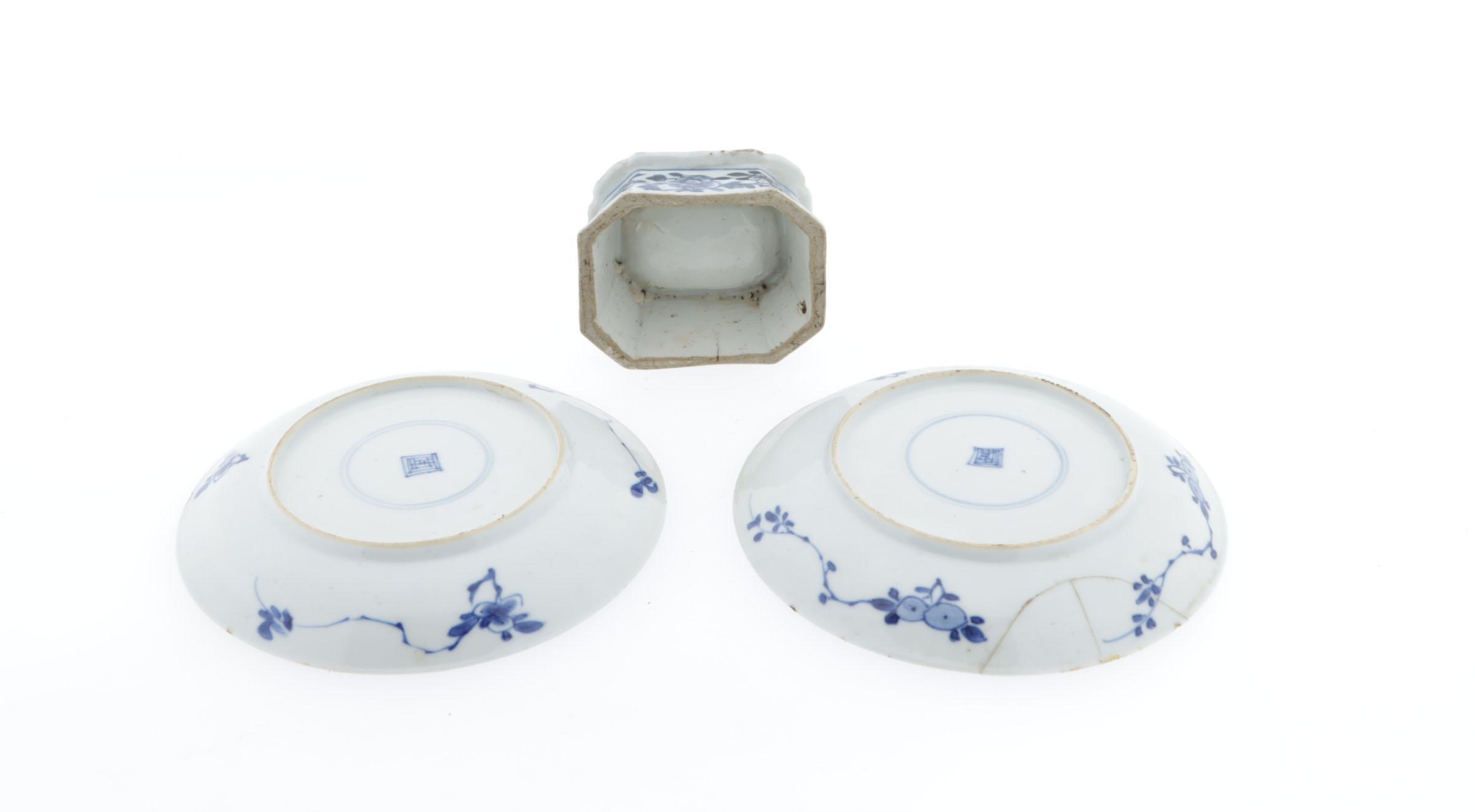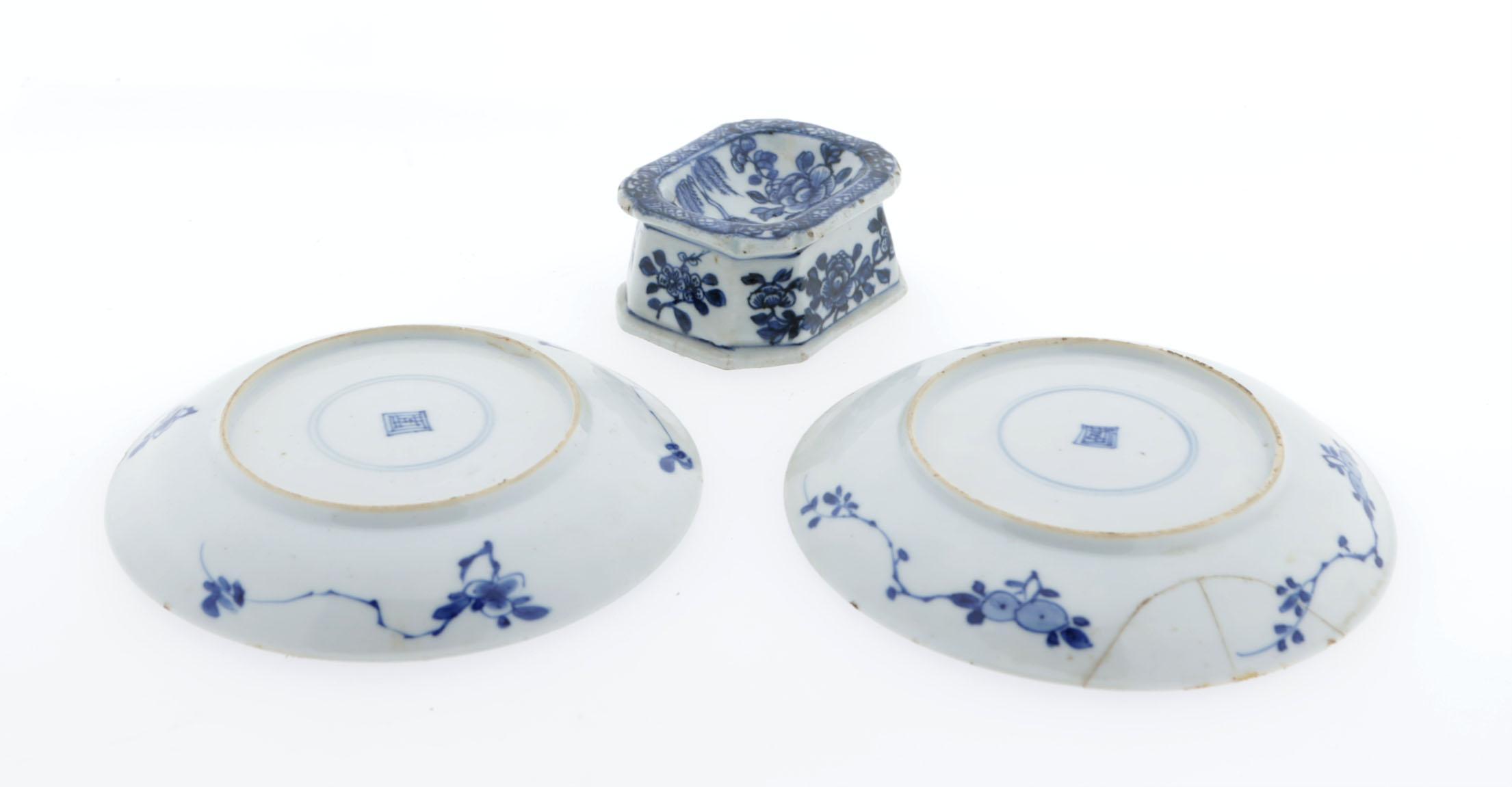 2 chinese porseleinen bordjes ( Kangxi?) 1 bordje is gelijmd, andere is in tact, doorsnede 15 cm, 1 chinees porseleinen zoutvat, 18e eeuw, gedecoreerd met bloemen en treurwilgen, 8 x 4 cm