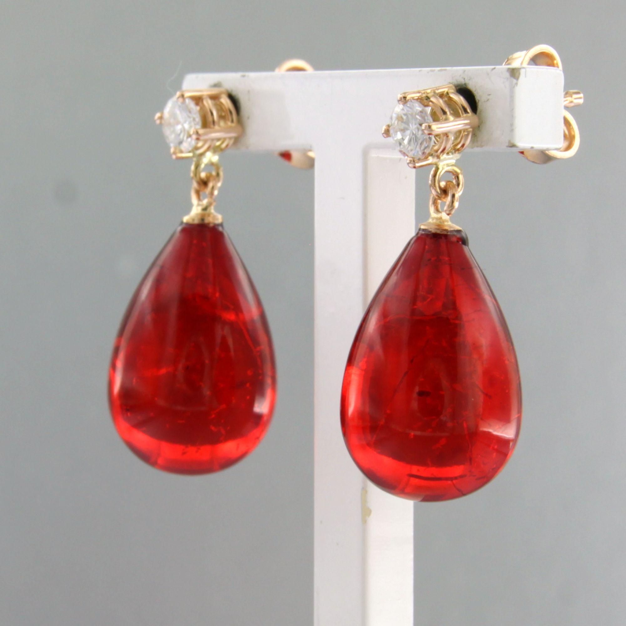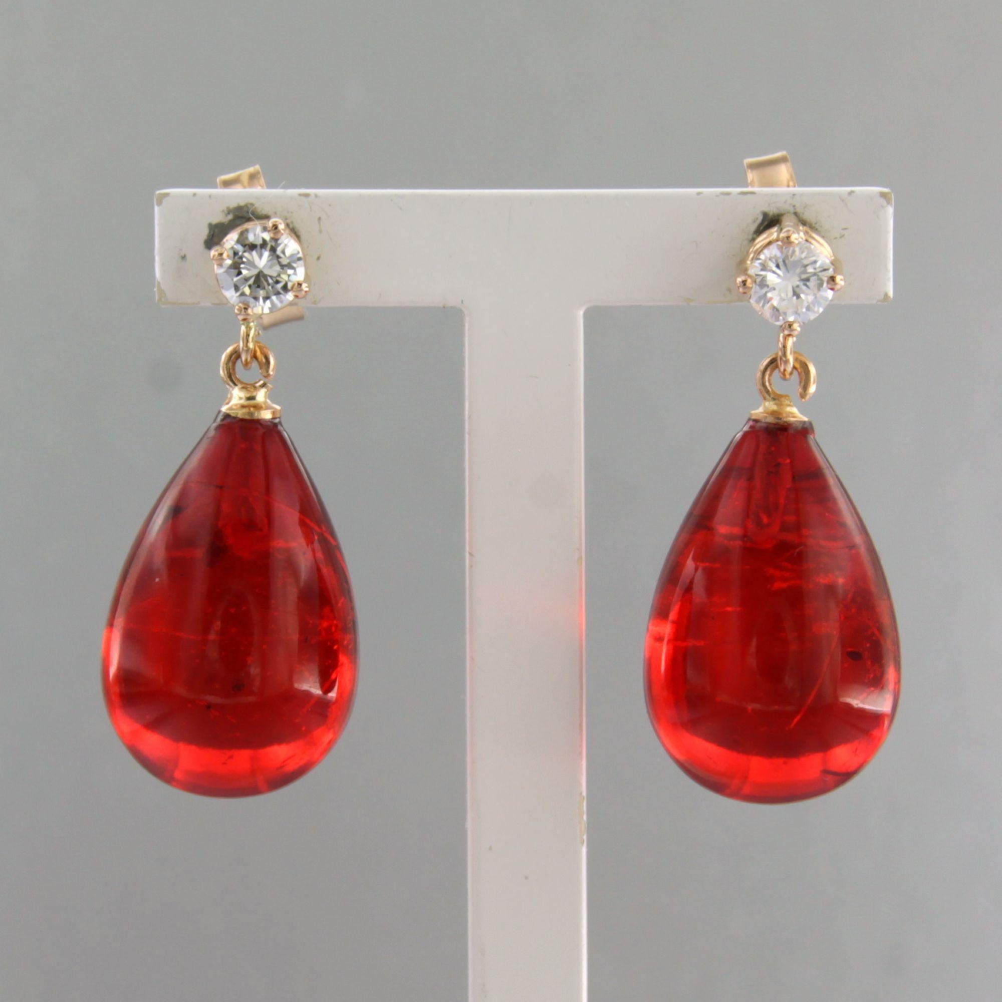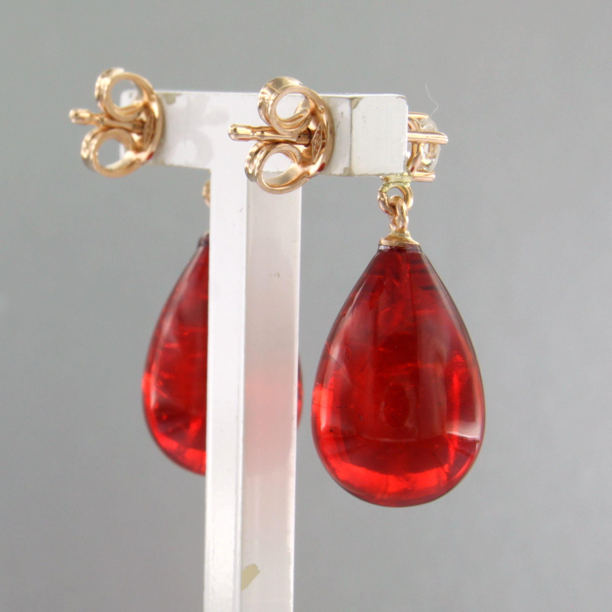18 Kt. roodgouden oorhangers bezet met rode amber en briljant geslepen diamant 0.18ct