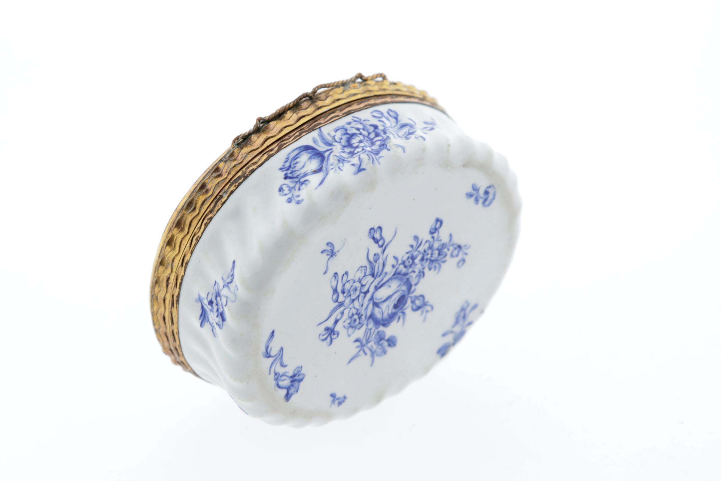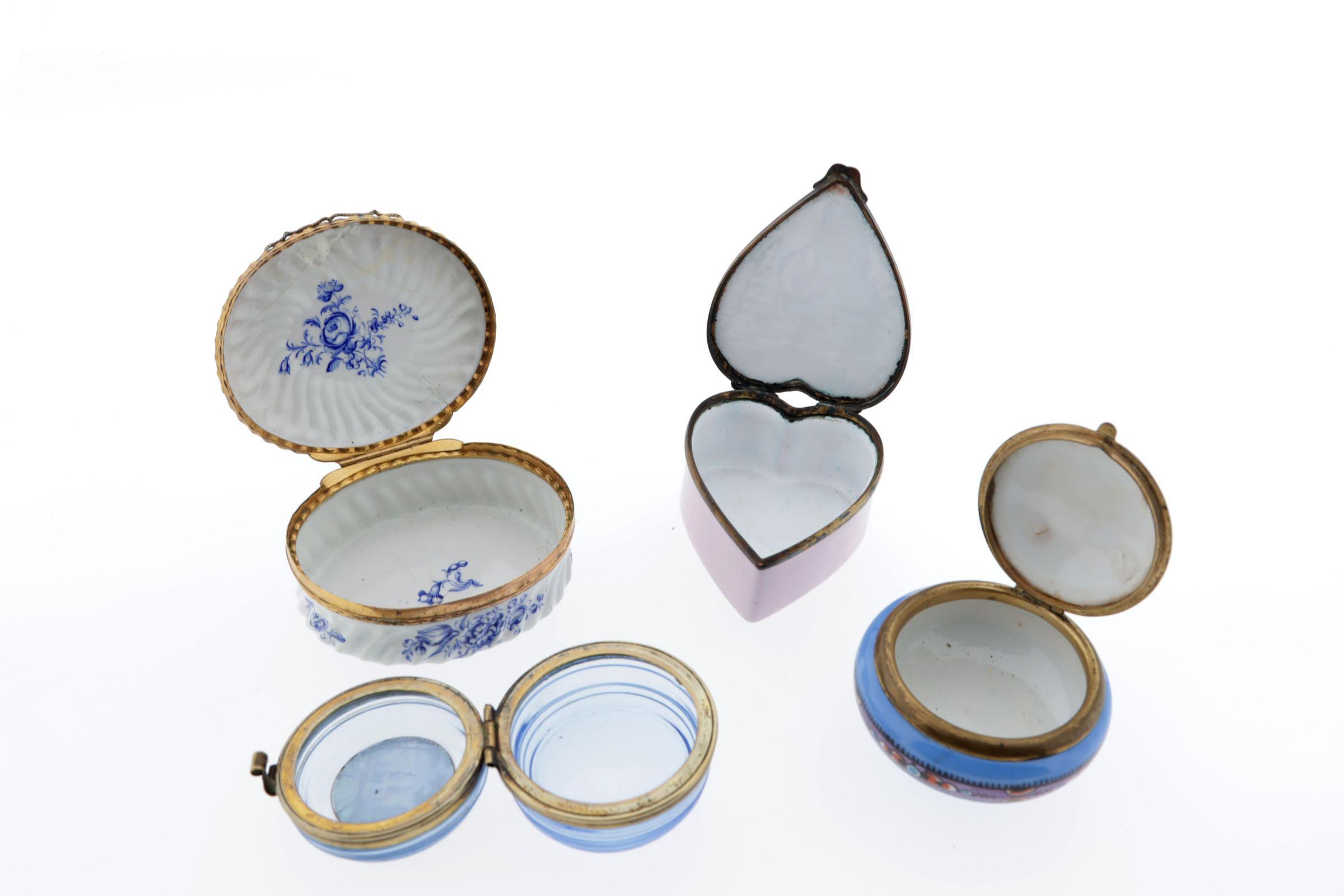 4 snuifdoosjes, waaronder: 1 porseleinen ovale snuifdoos met goudkleurig montuur, koningsblauwe bloemmotieven, o.a. tulp op witte ondergrond, Duits, 18e eeuw, 3 x 7,5 x 6 cm, 1 hartvormige roze email-op-koper snuifdoos met driemaster, met bloemguirlandes en tekst "success to the fleet" op deksel, Bilston emaille, 19e eeuw, hoogte 3 cm, lengte 6,9 cm, 1 rond blauw glazen doosje, metalen montuur met afbeelding geëmailleerd op deksel van man en vrouw te paard en hondje, doorsnede 4 cm, 1 rond porseleinen doosje in blauw met paars/oranje/wit decoratie, metalen montuur, doorsnede 6 cm