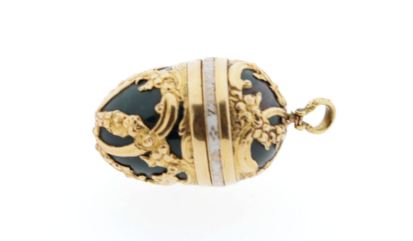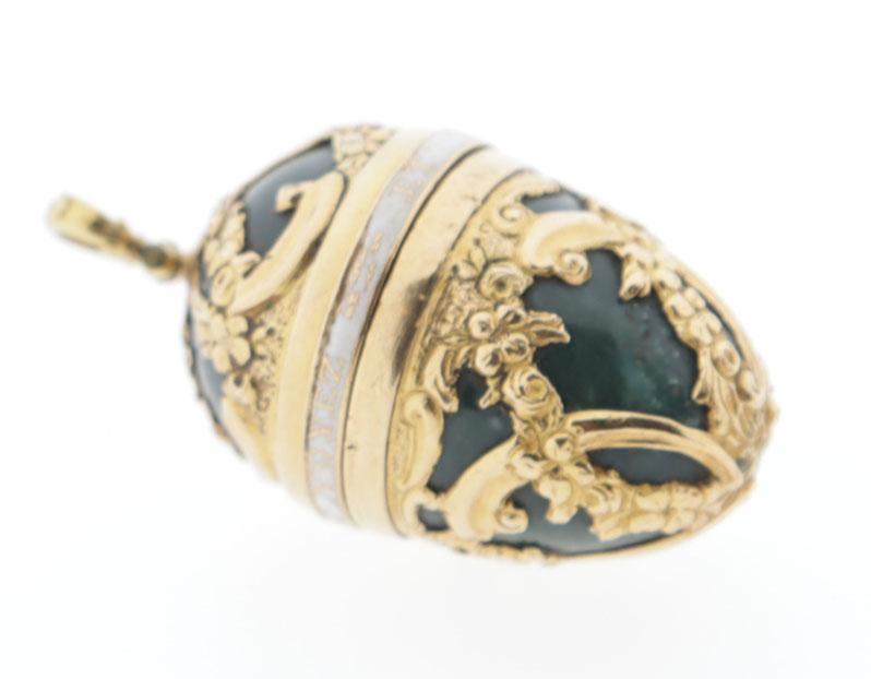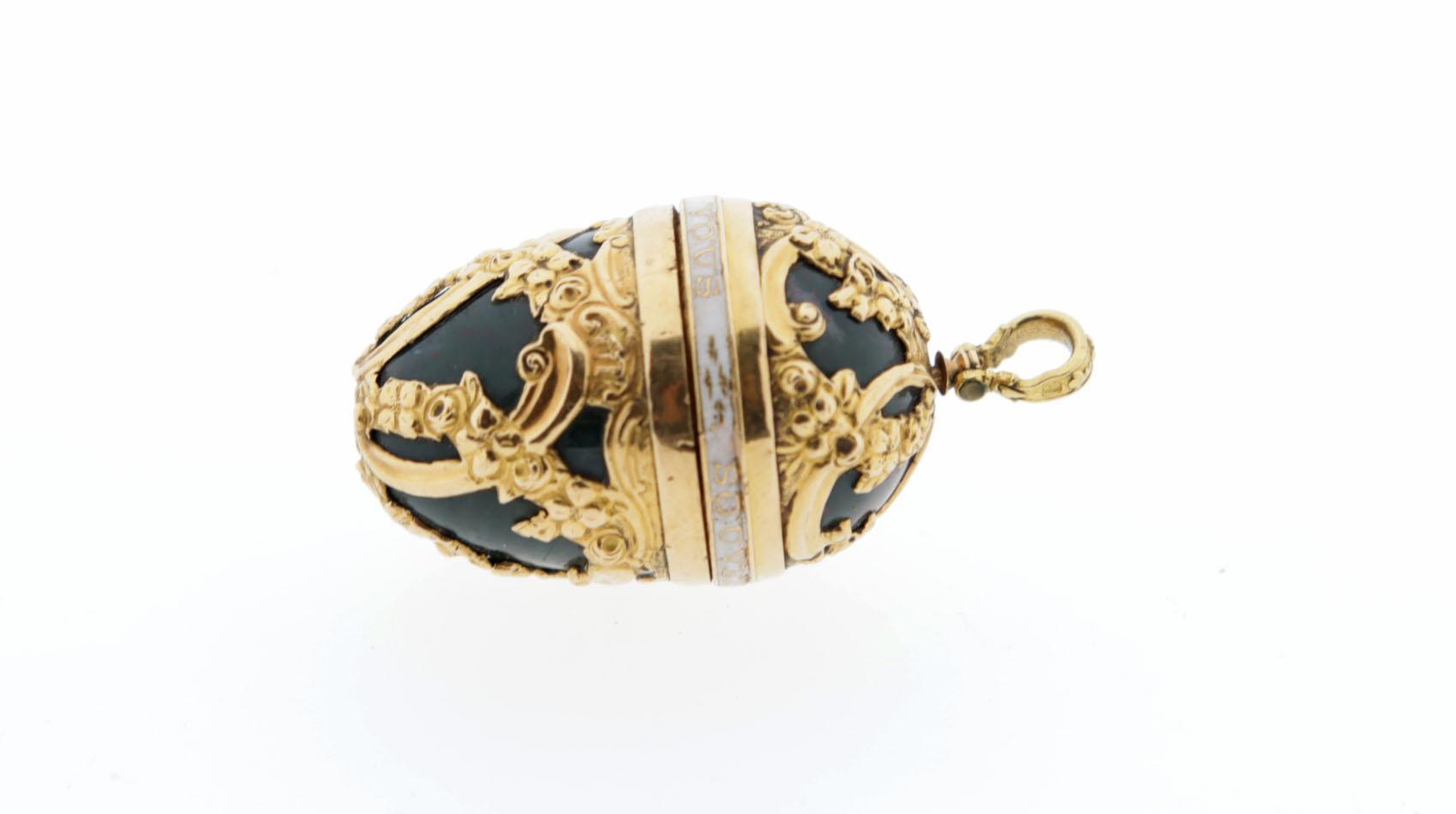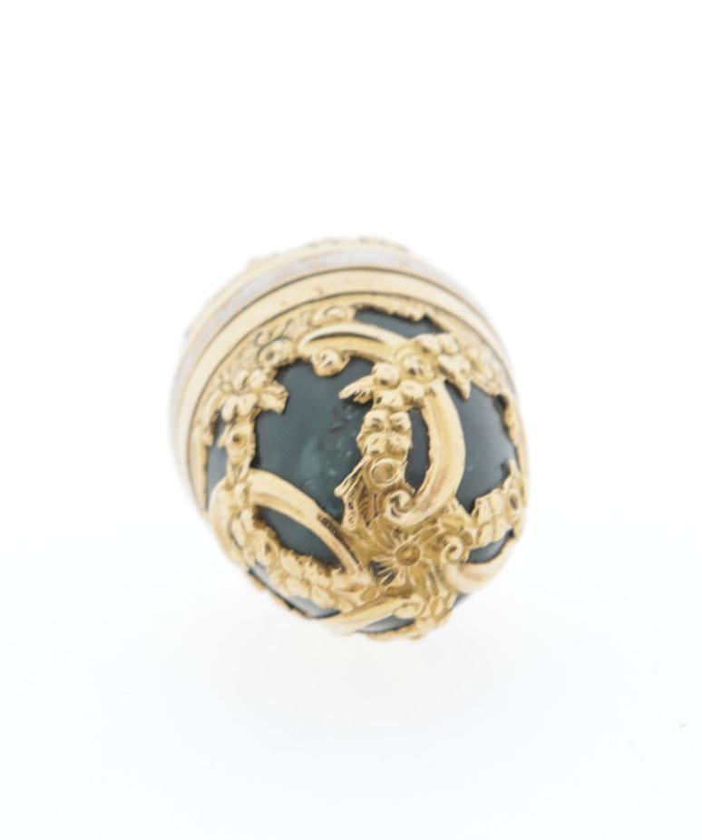 ei-vormige pommander met draagoogje, groene jaspis met gouden montuur met Louis XV krullen, op schroefdraad een witte emaille rand met tekst: "voyez et vous souvenez" (kijk en onthoud), Engeland, 2e helft 18e eeuw, hoogte 3,5 cm x 2,5 cm