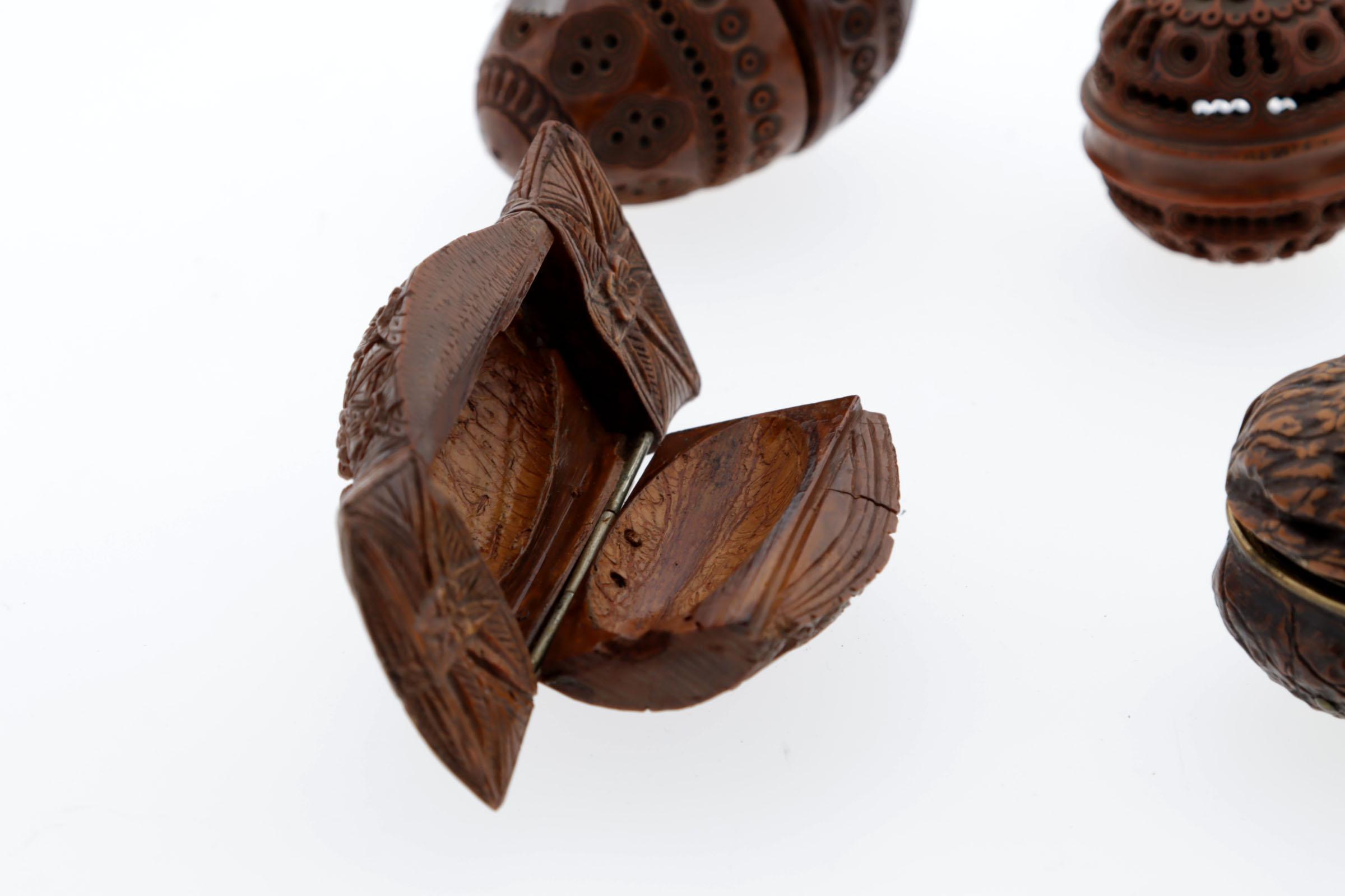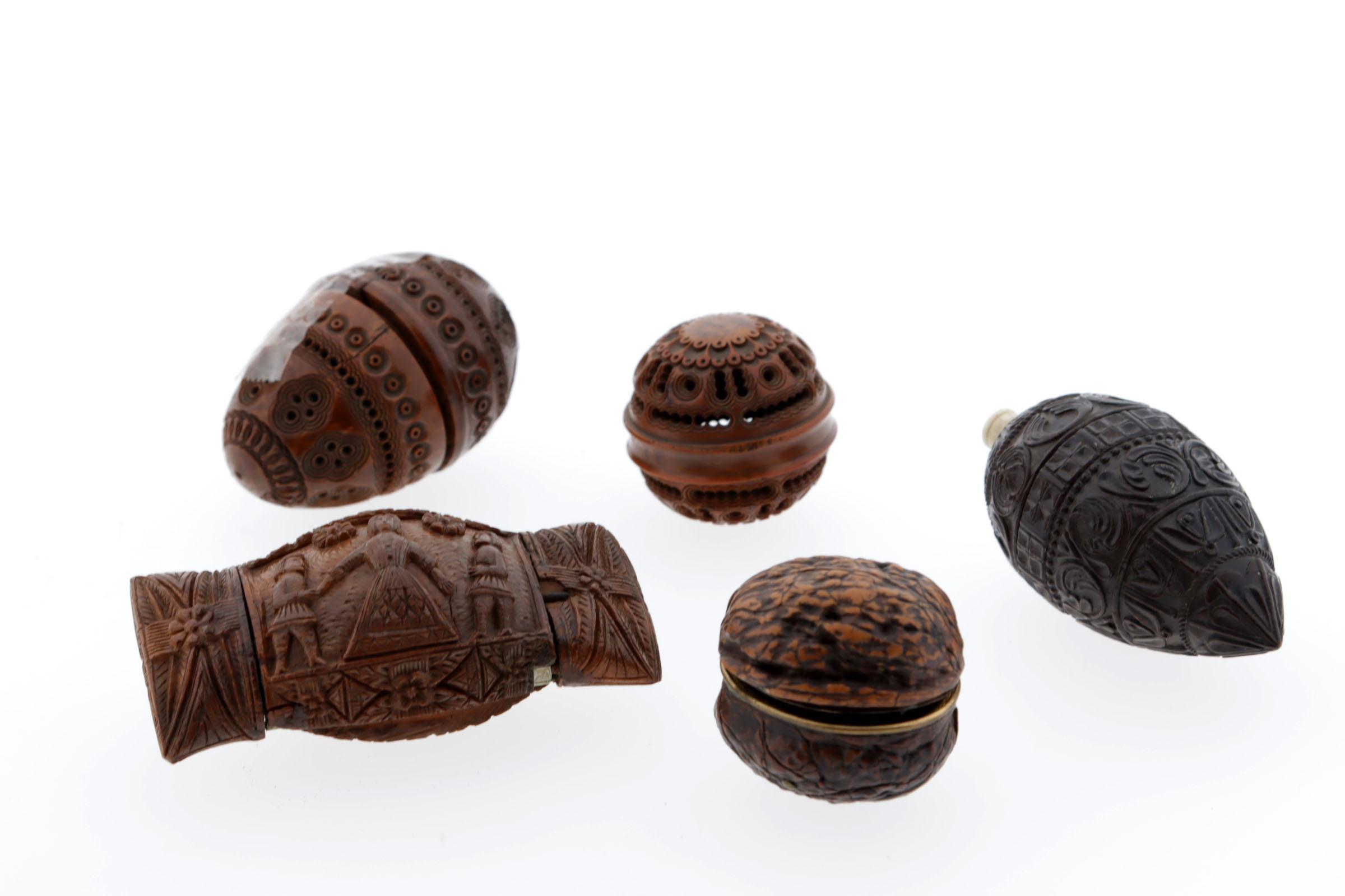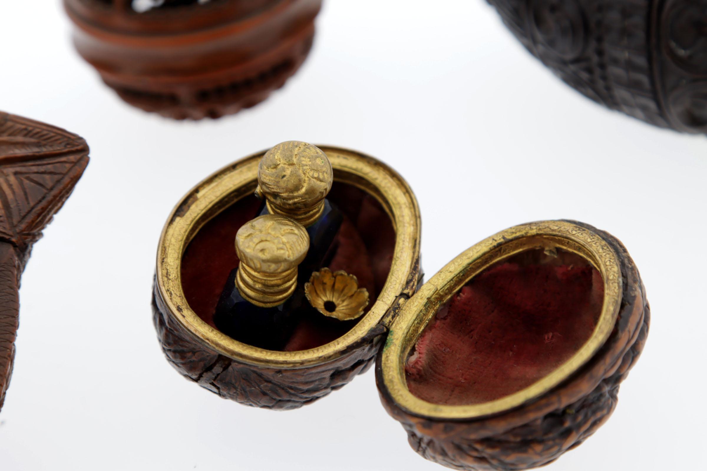 5 snuifdozen, waaronder: 1 coquille reuk-ei, schroefdraad halverwege, donkerbruin, rondom bewerkt, 19e eeuw, Frans, hoogte 7 cm (breuk), 1 ronde snuifdoos van coquille, begin 19e eeuw, Frans, hoogte 4 cm, 1 uit corozo hout gesneden snuifdoos, tabatière, aan bovenkant 2 paren, aan achterkant een vrouw met aan beide kanten een man, aan zijkanten bloemmotieven, begin 19e eeuw, 9,7 cm, Frans, 1 openscharnierende walnoot waarin 2 kleine blauwe flaconnetjes, met koperkleurige scharnierende monturen, noot met rood fluweel afgewerkt, hoogte flacons 3 en 2,8 cm, klein koperkleurig trechtertje, hoogte noot 4,2 cm, Frans, begin 19e eeuw, 1 coquille fles, druppelvormig, benen dopje, begin 19e eeuw, 9 cm