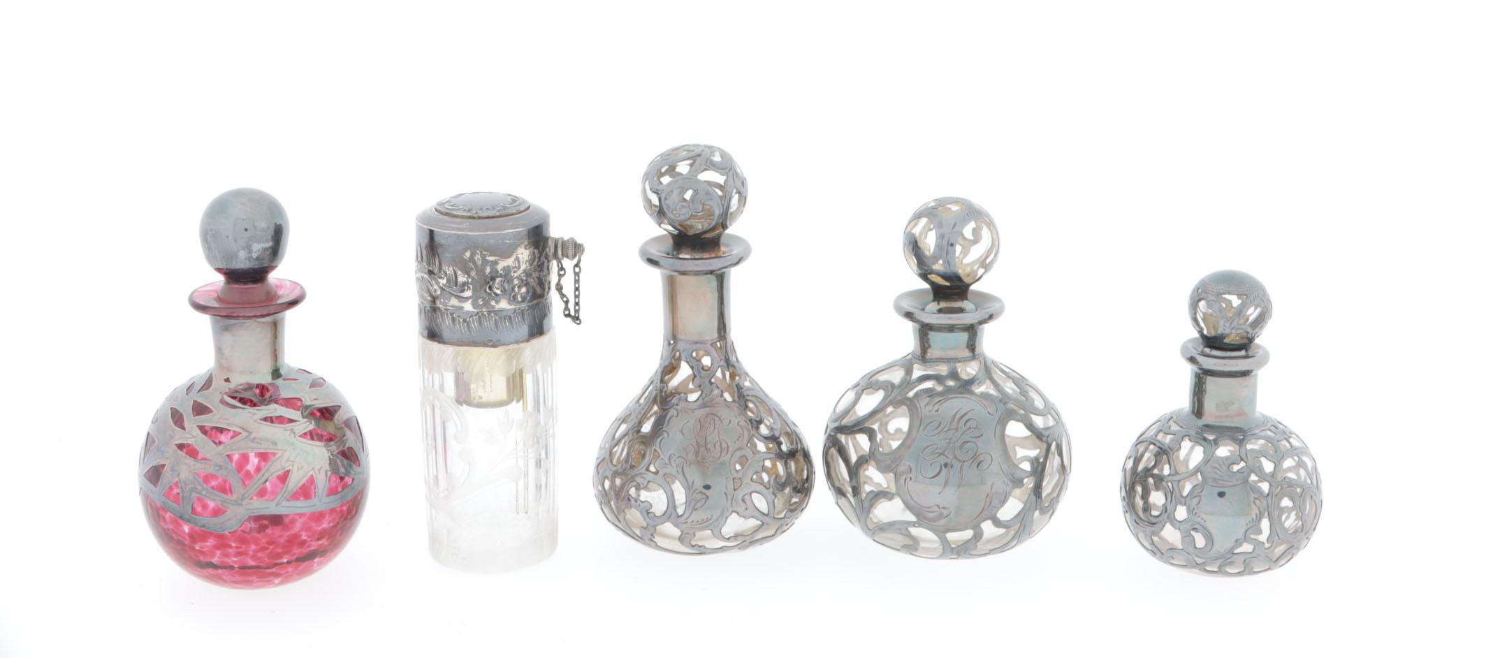 serie van 5 parfumflacons, waaronder: 4 ronde toilettafel flessen met zilveren beslag, 1 ervan is rood, USA rond 1900, hoogte 7,5-9-9,5-10,5 cm, 1 cylindervormige, gegraveerde kristallen parfumverstuiver met zilveren schroefdop, Frans, rond 1900, hoogte 9,5 cm
