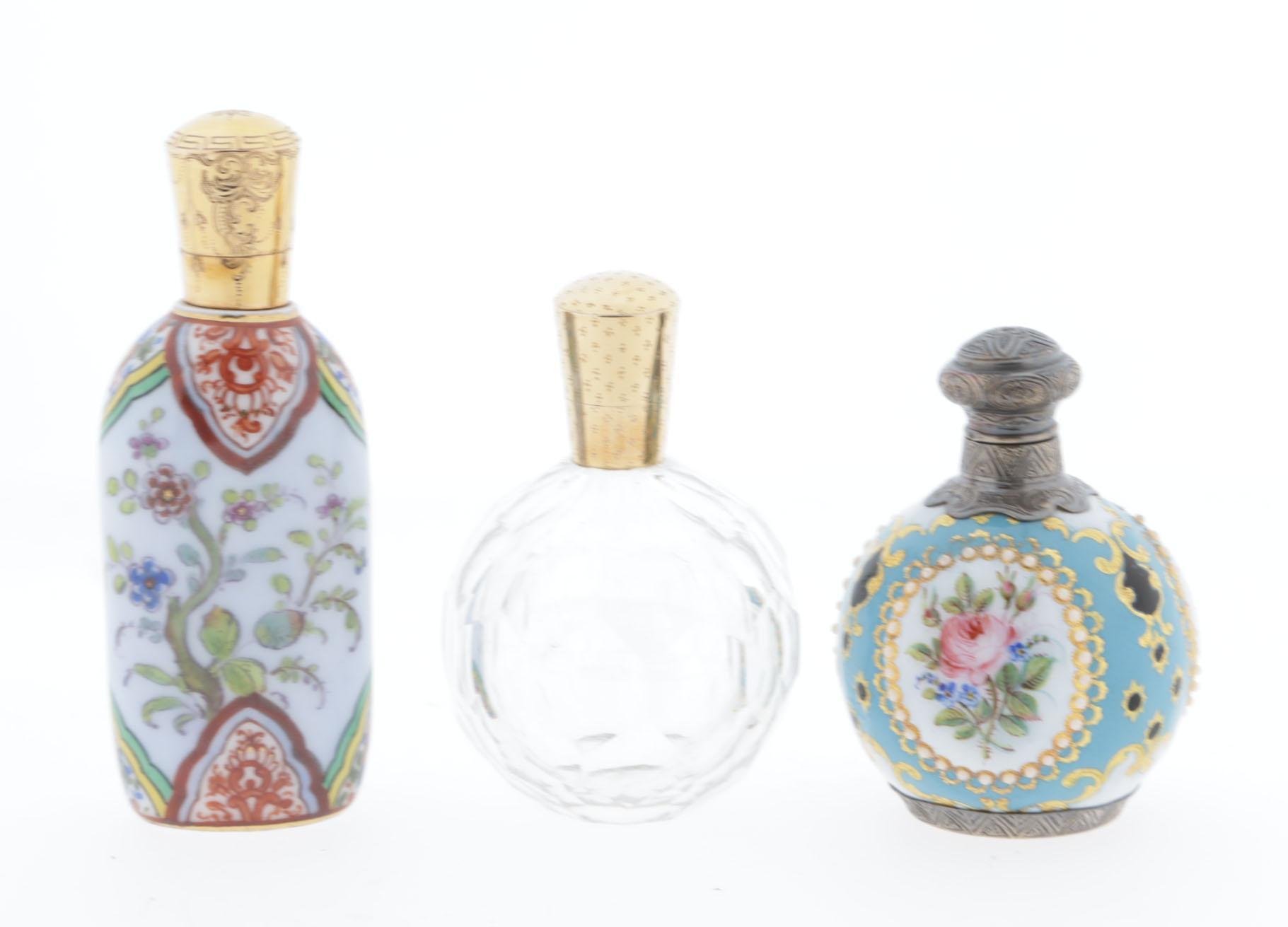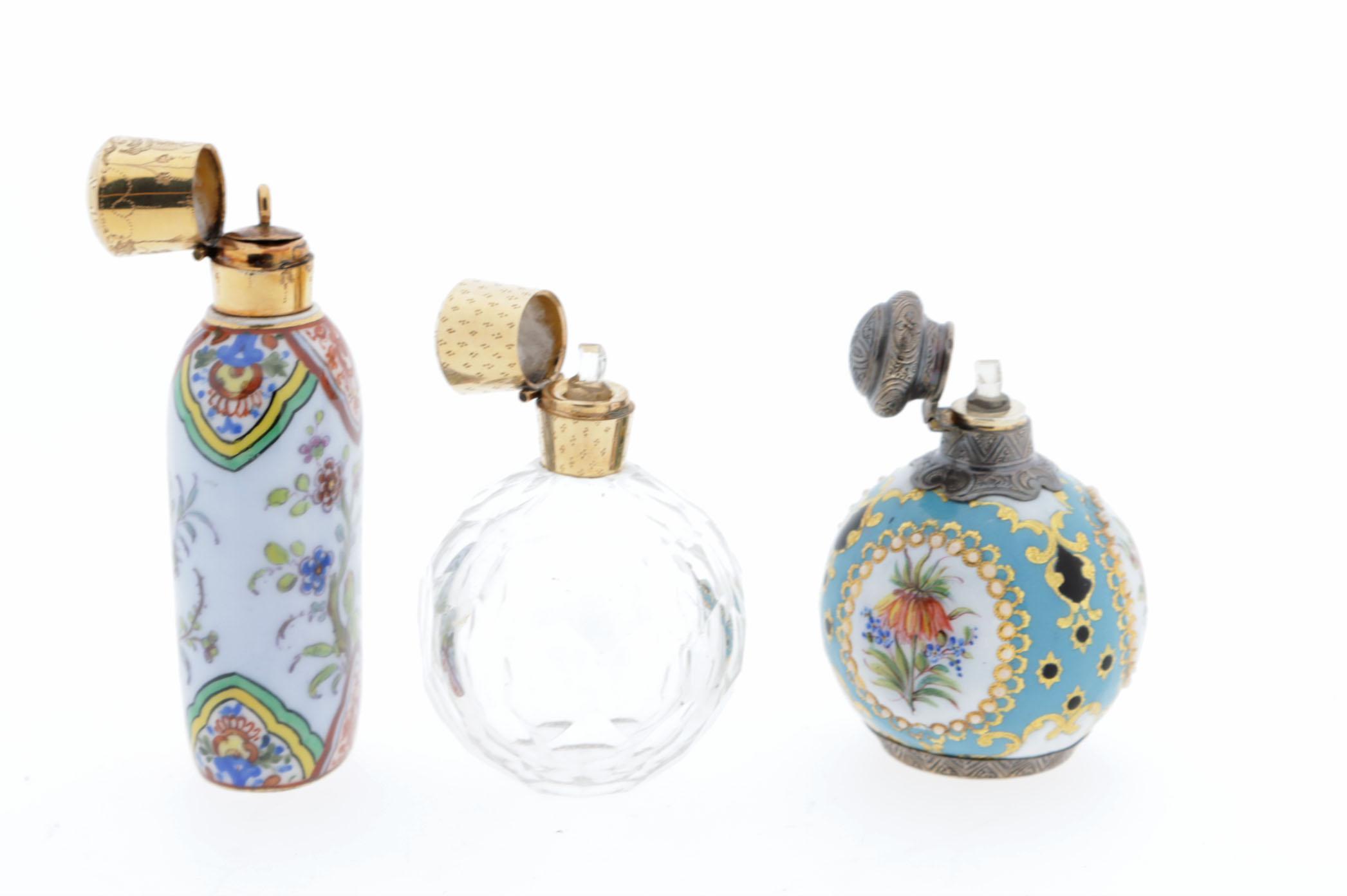 3 parfumflacons, waaronder: 1 ronde Sèvres fles, geëmailleerd, 3 medaillons met bloemvoorstellingen, zilveren montuur en scharnierende dop, binnenstopje, hoogte 6,5 cm, 1 gefacetteerd kristallen bol rond flesje met gouden scharnierende dop, binnendopje, hoogte7 cm, 1 staand porseleinen met emaille handbeschilderd flesje voorzien van gedetailleerde florale patronen, gouden scharnierende dop, onderop een blauw teken 'D', hoogte 9 cm