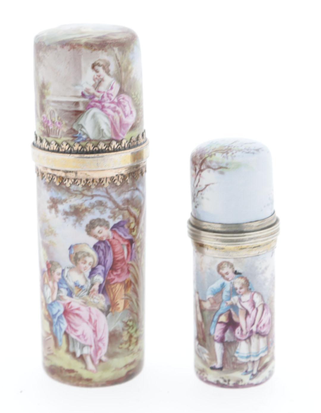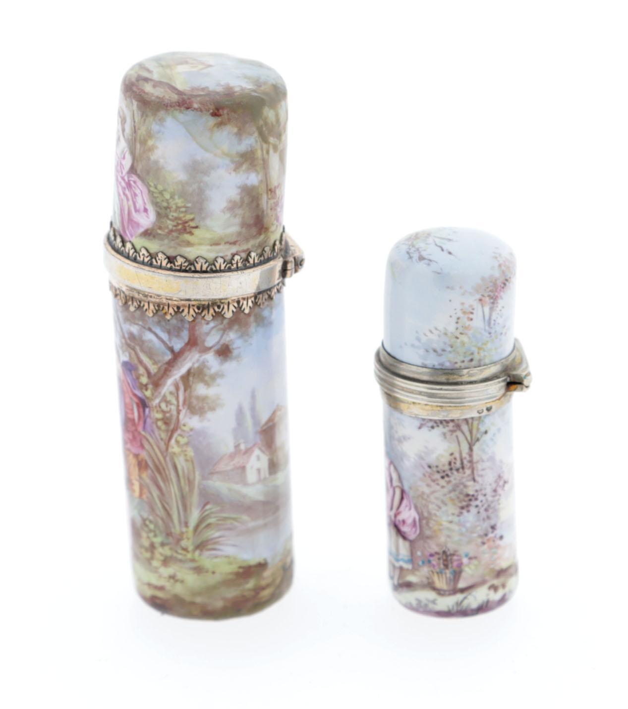 2 emaille parfumflacons: 1 kokervormig met romantisch paartje in landschap, scharnierend verguld zilveren montuur, binnenstopje, Frans keur, half 19e eeuw, hoogte 8,2 cm, 1 emaille op zilver flacon, kokervormig, voorstelling romantisch paar in landschap met 2 witte duiven, glazen binnenstopje, 1850, hoogte 5,7 cm