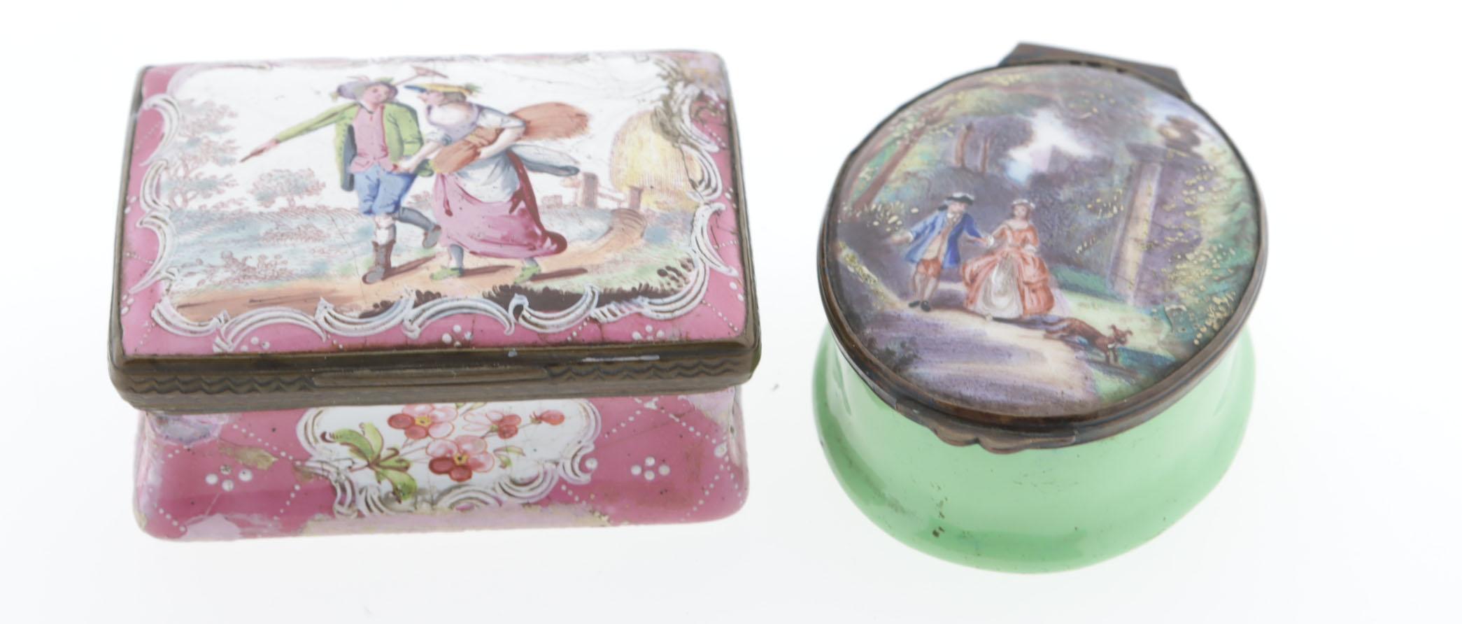 2 snuifdoosjes, 1 rechthoekig Bilston emaille doosje met bronzen montuur, deksel heeft een afbeelding van een boeren paartje in een landschap met een hooiberg op de achtergrond, bloemen op de 4 (beschadigde) zijkanten, hoofdkleur zogenaamd "roze Pompadour", Engels, laat 18e eeuw, 3,3x5,2x6,3 cm, 1 ovaal groen email-op-koper snuifdoos met rococo paar met hondje op deksel, wit emaille aan binnenzijde, 18e eeuw, Bilston ( Staffordshire), hoogte 3 cm, lengte 6,8 cm