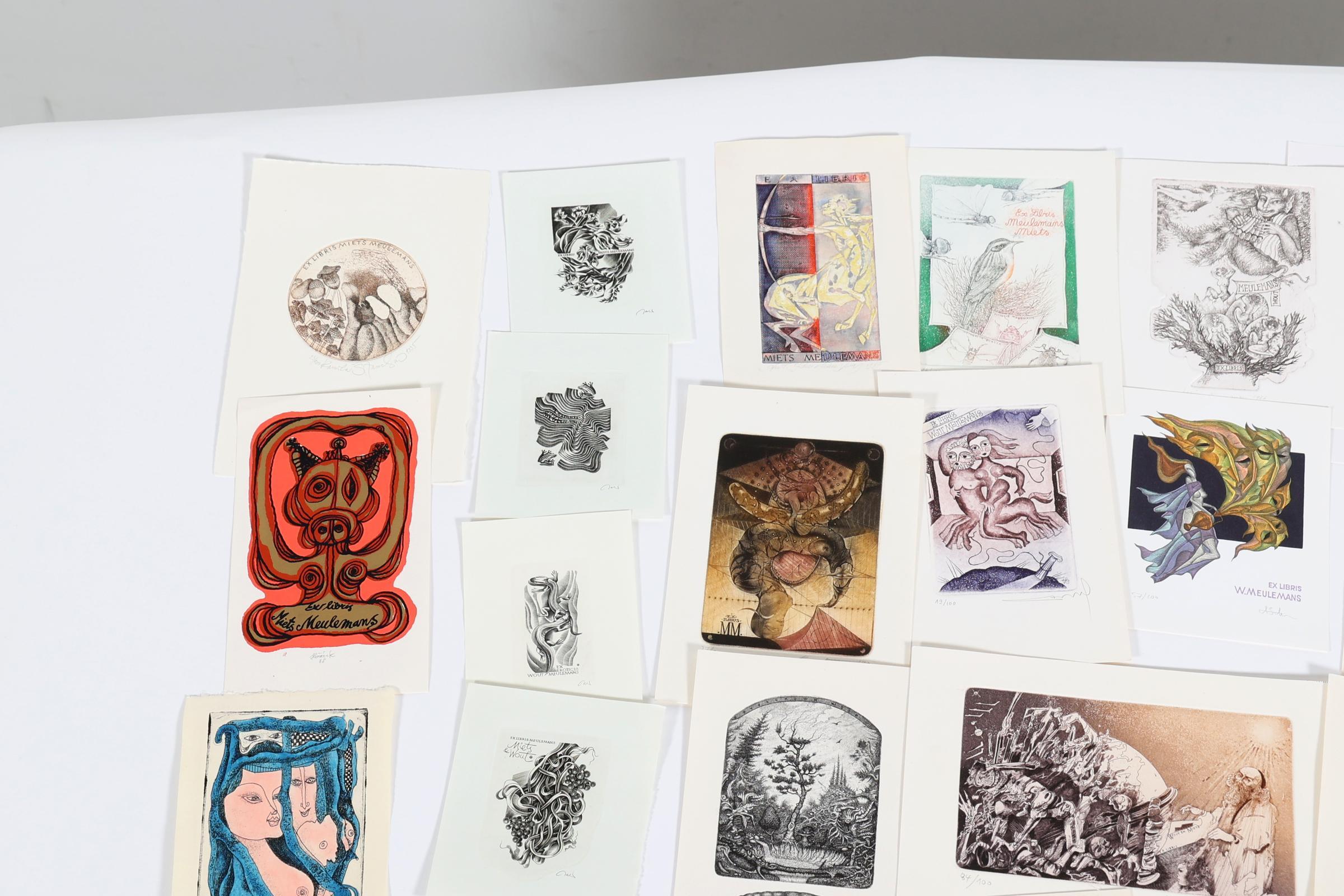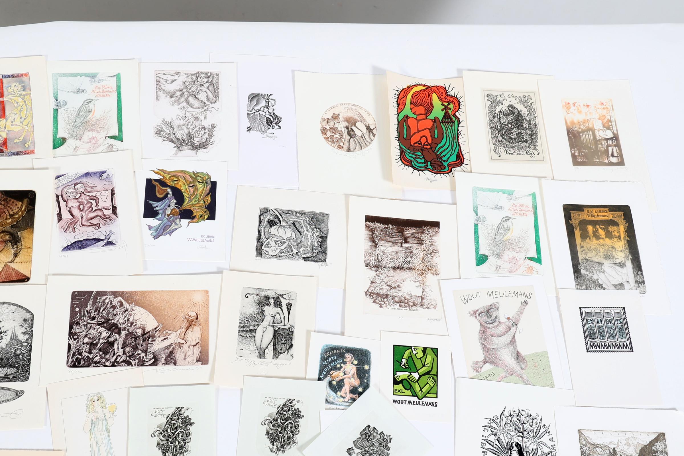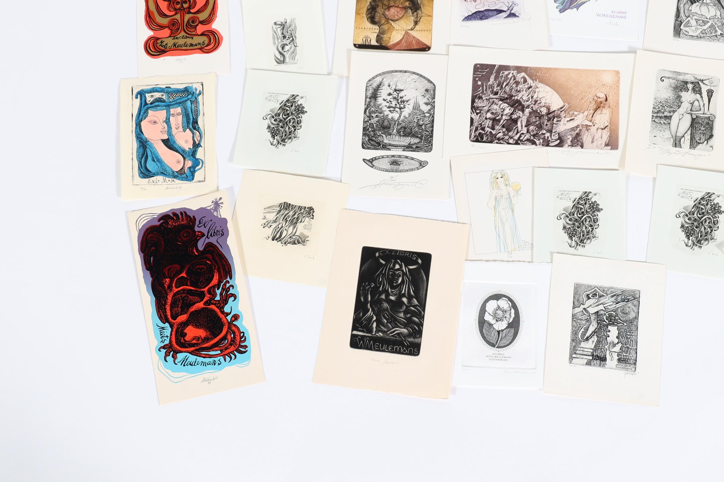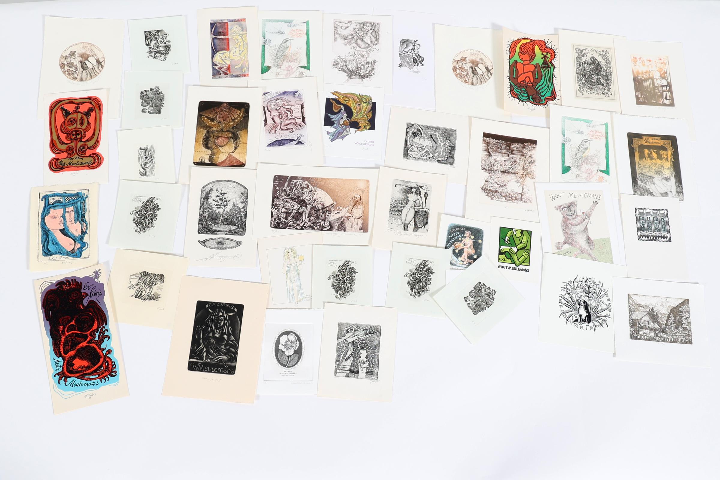 collectie van 40 exlibris op naam van Meulemans, diverse technieken, gesigneerd, (o.a. Kmieliauskas, Demel, Strik, Nesterchuk, Jakubowski, Augustovic, Jepkes, Stanclova)