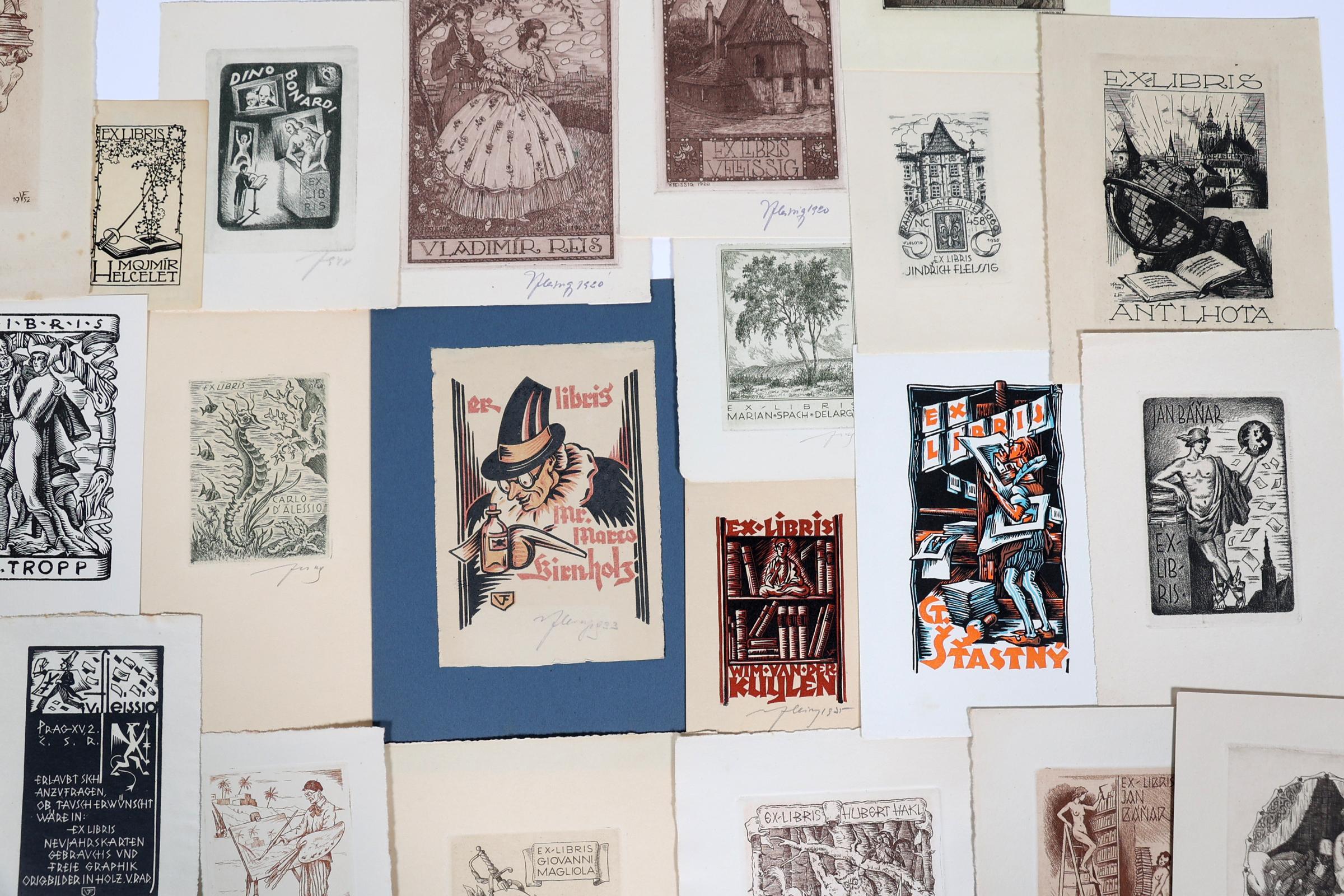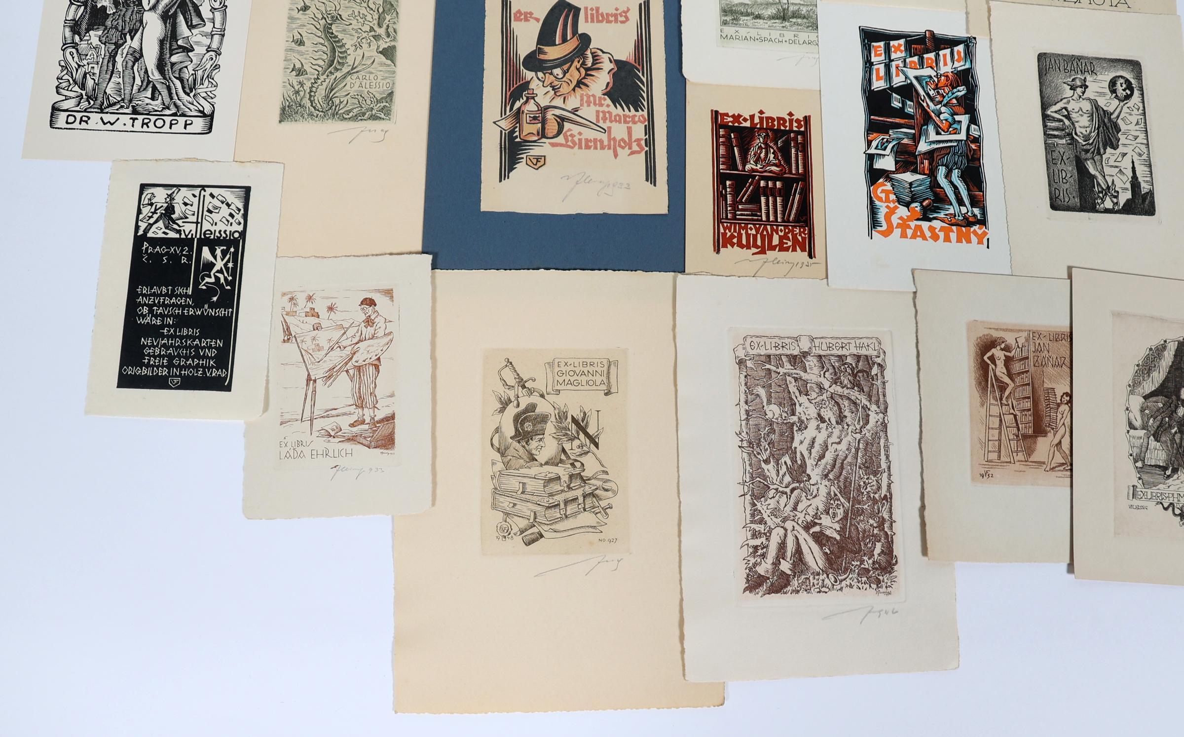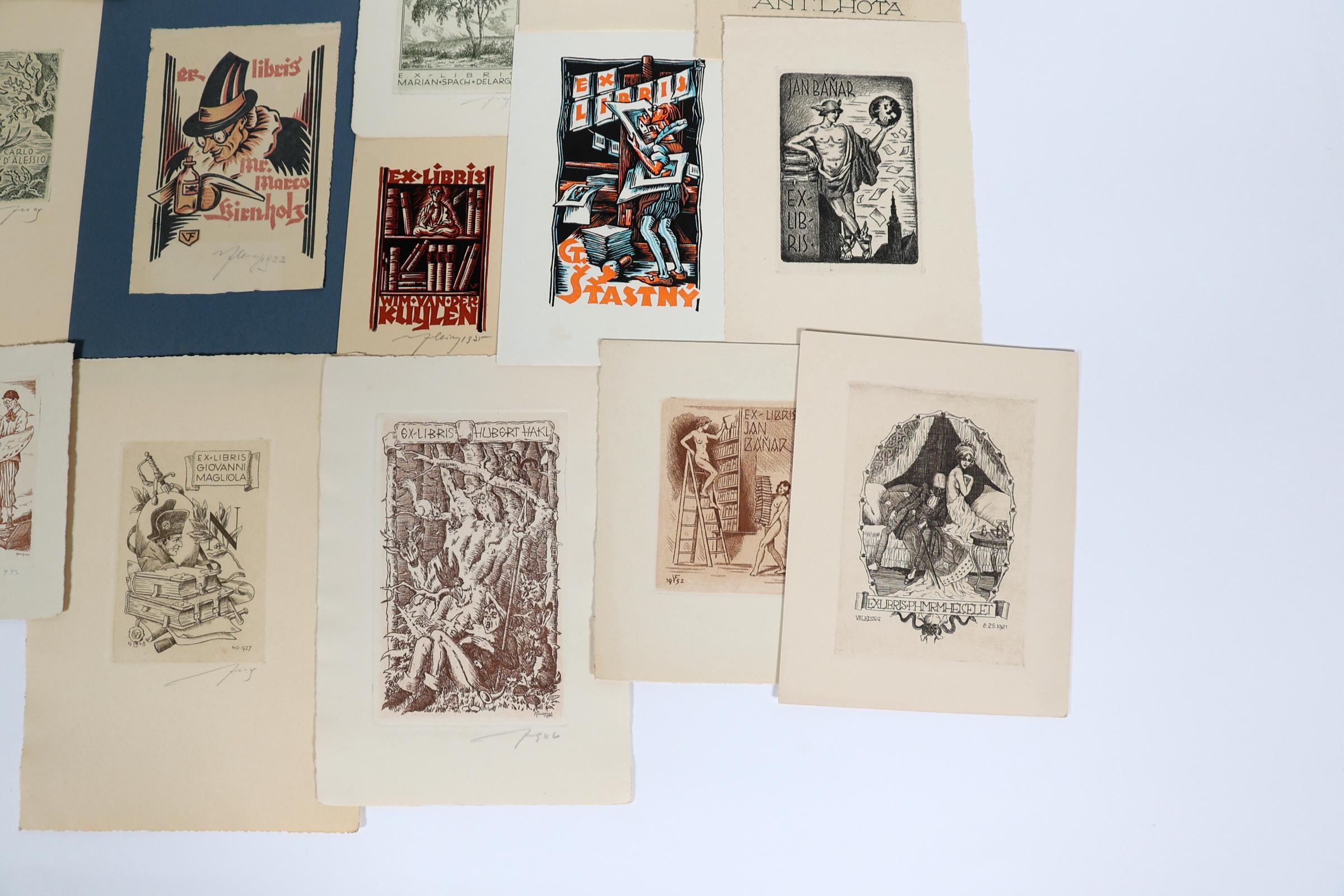 Fleissig, V., 22 exlibris (10 x diverse techn - vooral C3 - gesigneerd,8 x C3 - niet gesigneerd, 4 x cliché / X3), deels opgeplakt (geweest)