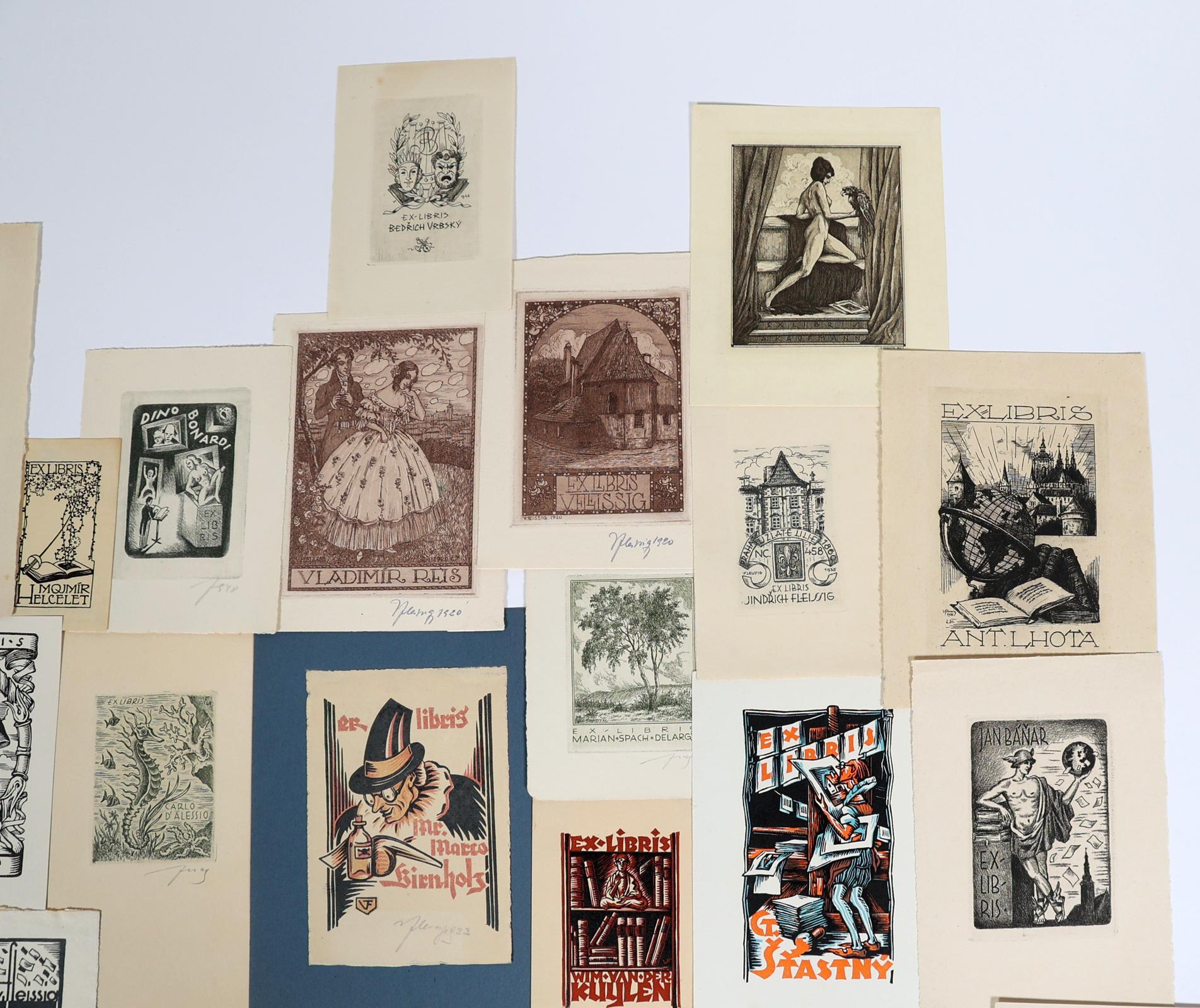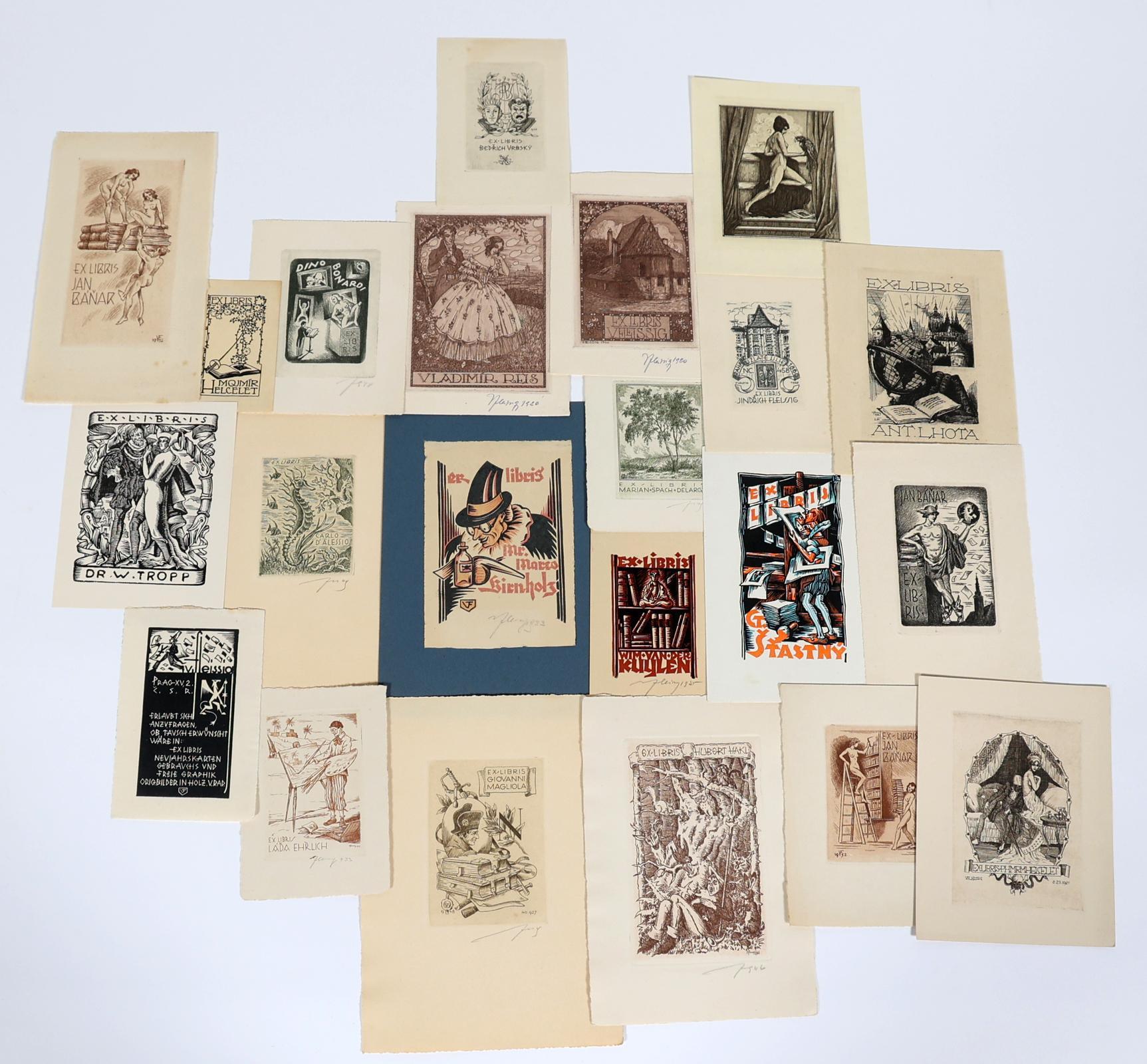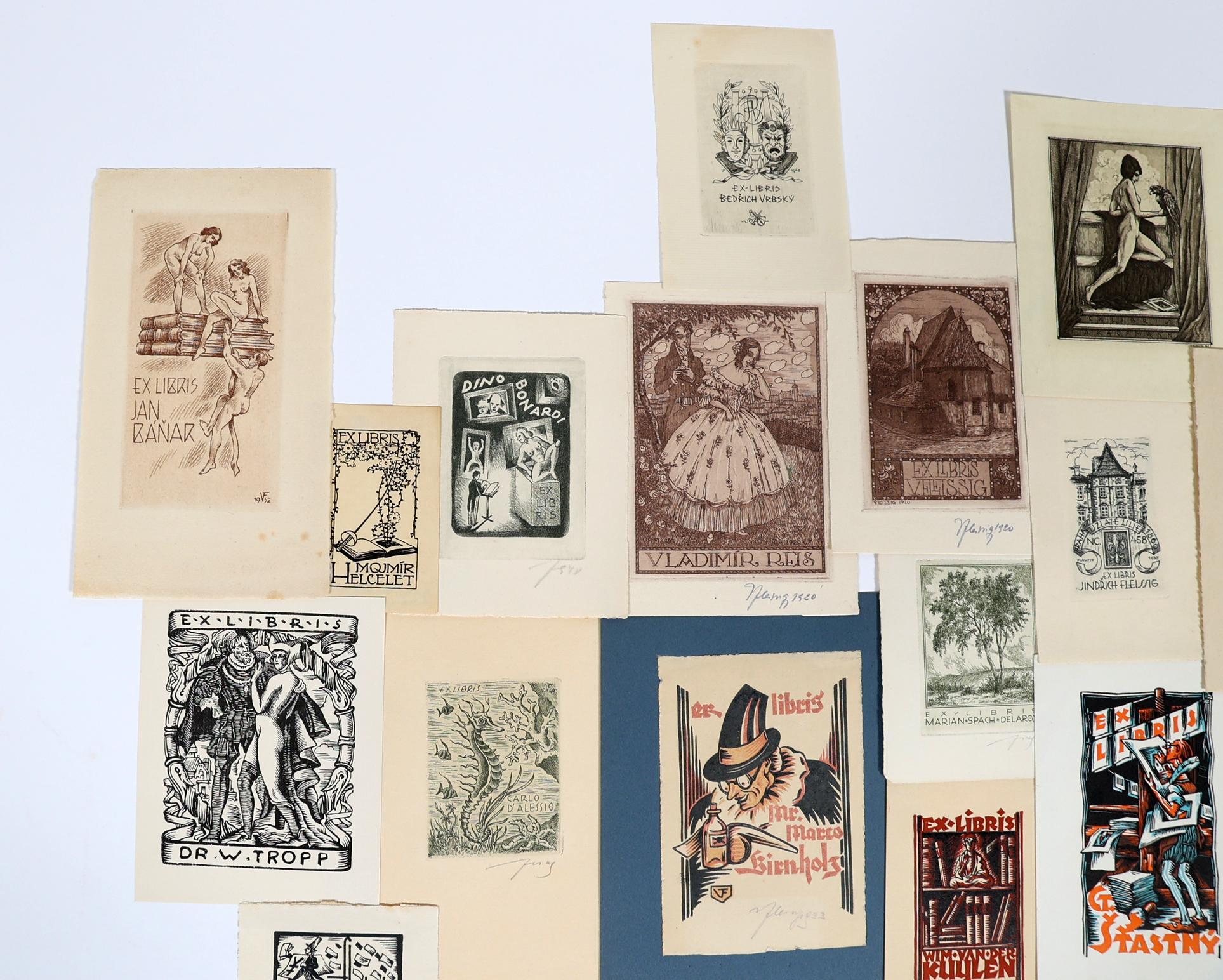 Fleissig, V., 22 exlibris (10 x diverse techn - vooral C3 - gesigneerd,8 x C3 - niet gesigneerd, 4 x cliché / X3), deels opgeplakt (geweest)
