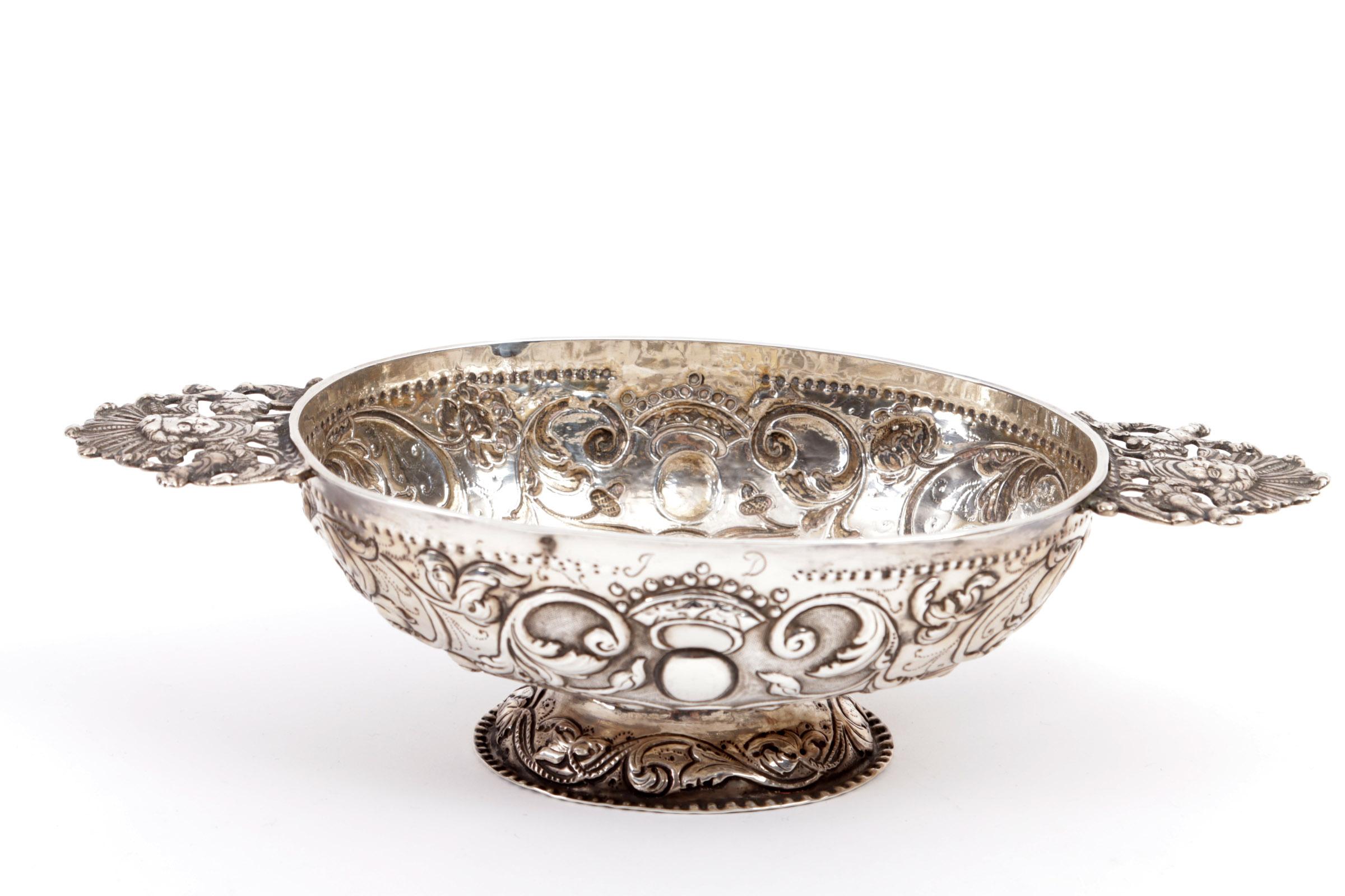 Antieke rijkbewerkte zilveren brandewijnkom, 18e eeuw
