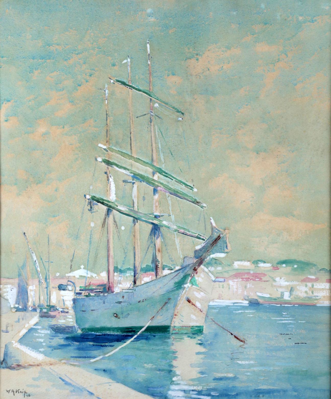 Willem Alexander Knip, Amsterdam 1883\-1967 Blaricum, Afgemeerde driemaster, aquarel, gedateerd 1926, 60 x 45 cm\.