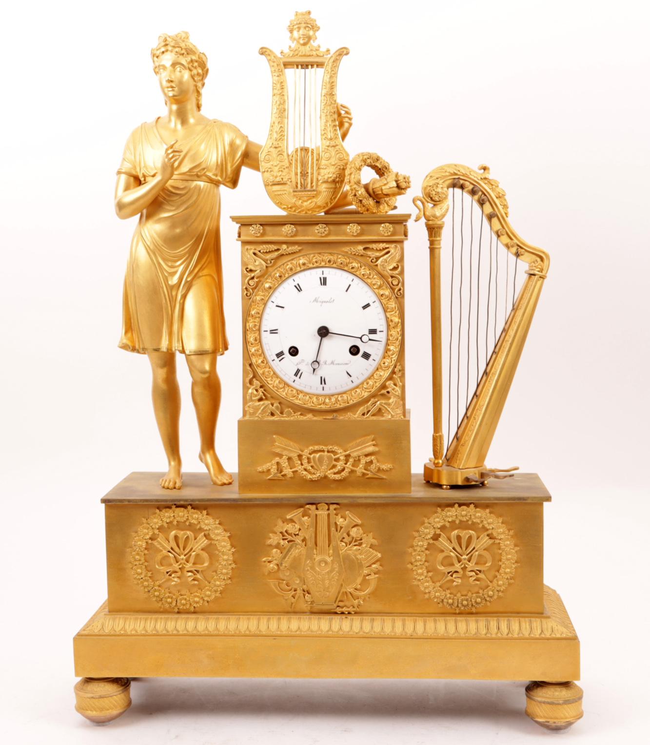 Miqnolet, vuurvergulde Frans bronzen Empire pendule met naast het uurwerk een harpiste, h\.52 x b\.36 x d\.12 cm\.