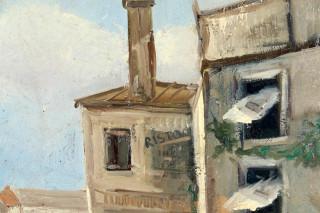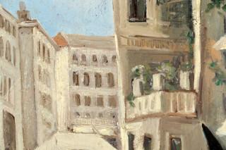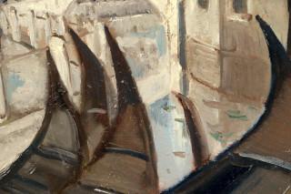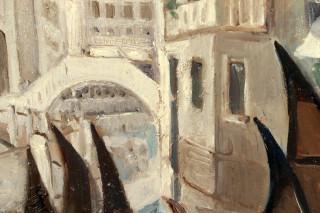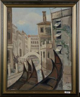 F.J. Drost, Gezicht in Venetië met gondels, olieverf op doek, gedateerd 1958, 40 x 50 cm.