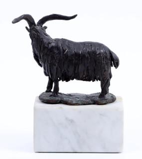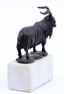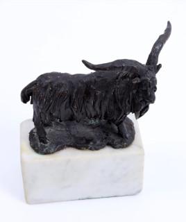 Yvonne Ypma, Den Haag 1945, bronzen sculptuur van een bok rustend op wit marmeren voetstuk, h.14 cm.
