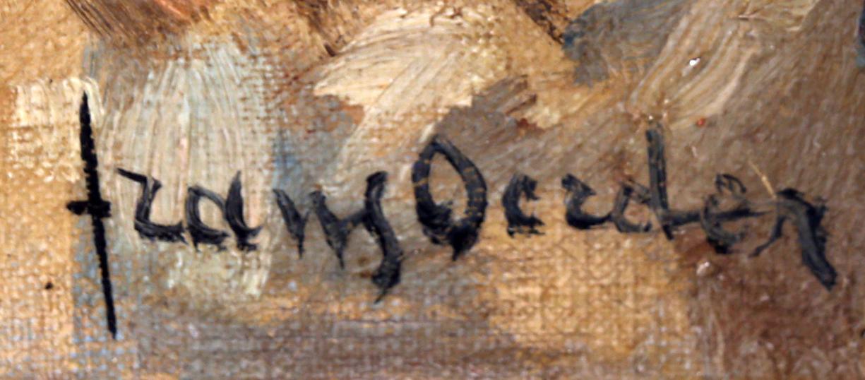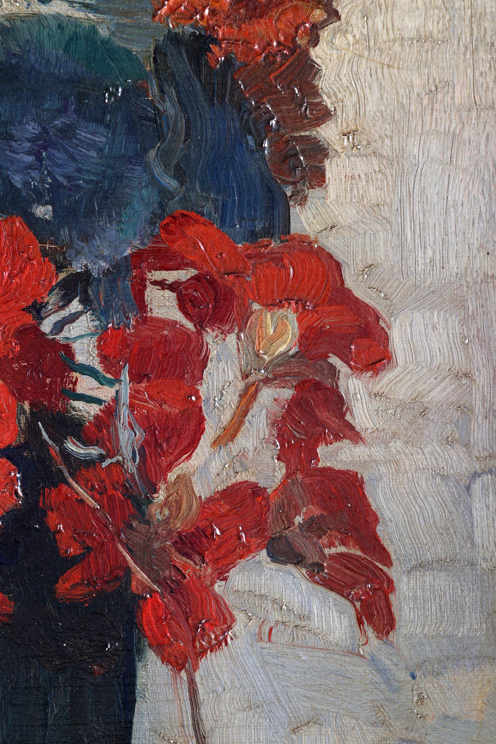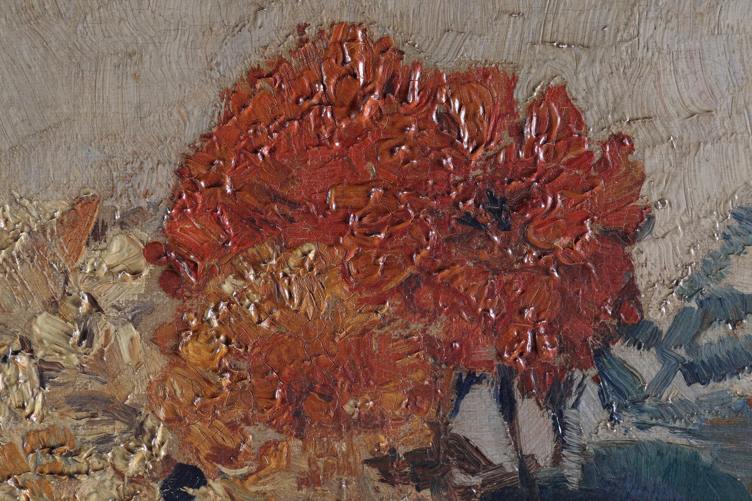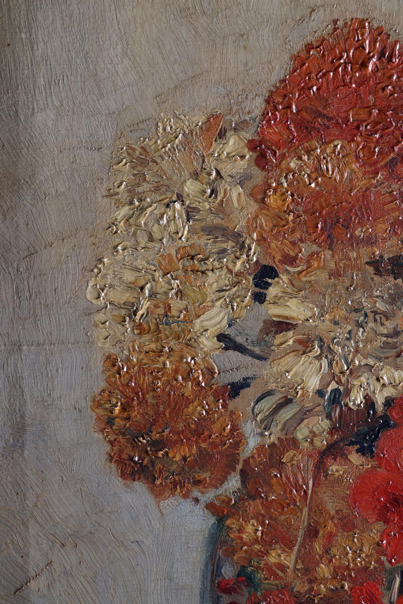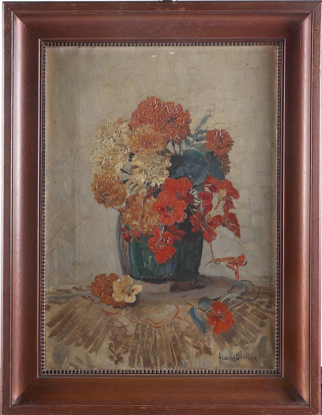 Frans David Oerder (1867-1944), Stilleven met boeket Afrikanen en Indische kers op tafelkleed, geschilderd in Berlicum Noord Brabant, januari 1919, olieverf op doek, provenance particuliere collectie