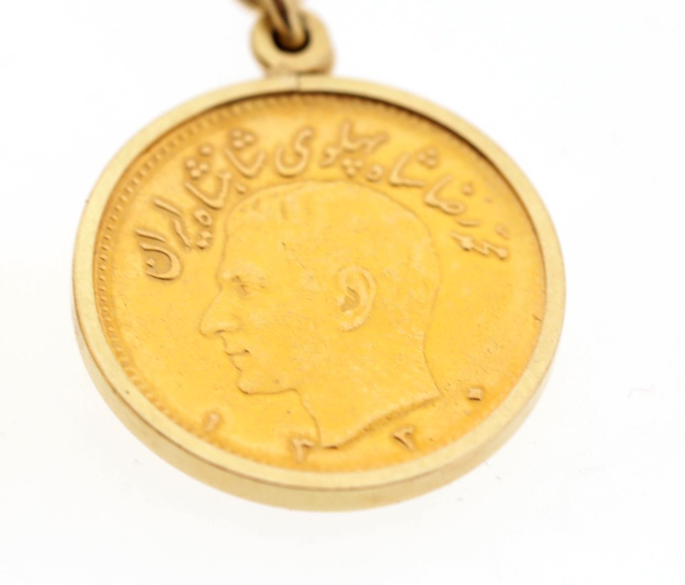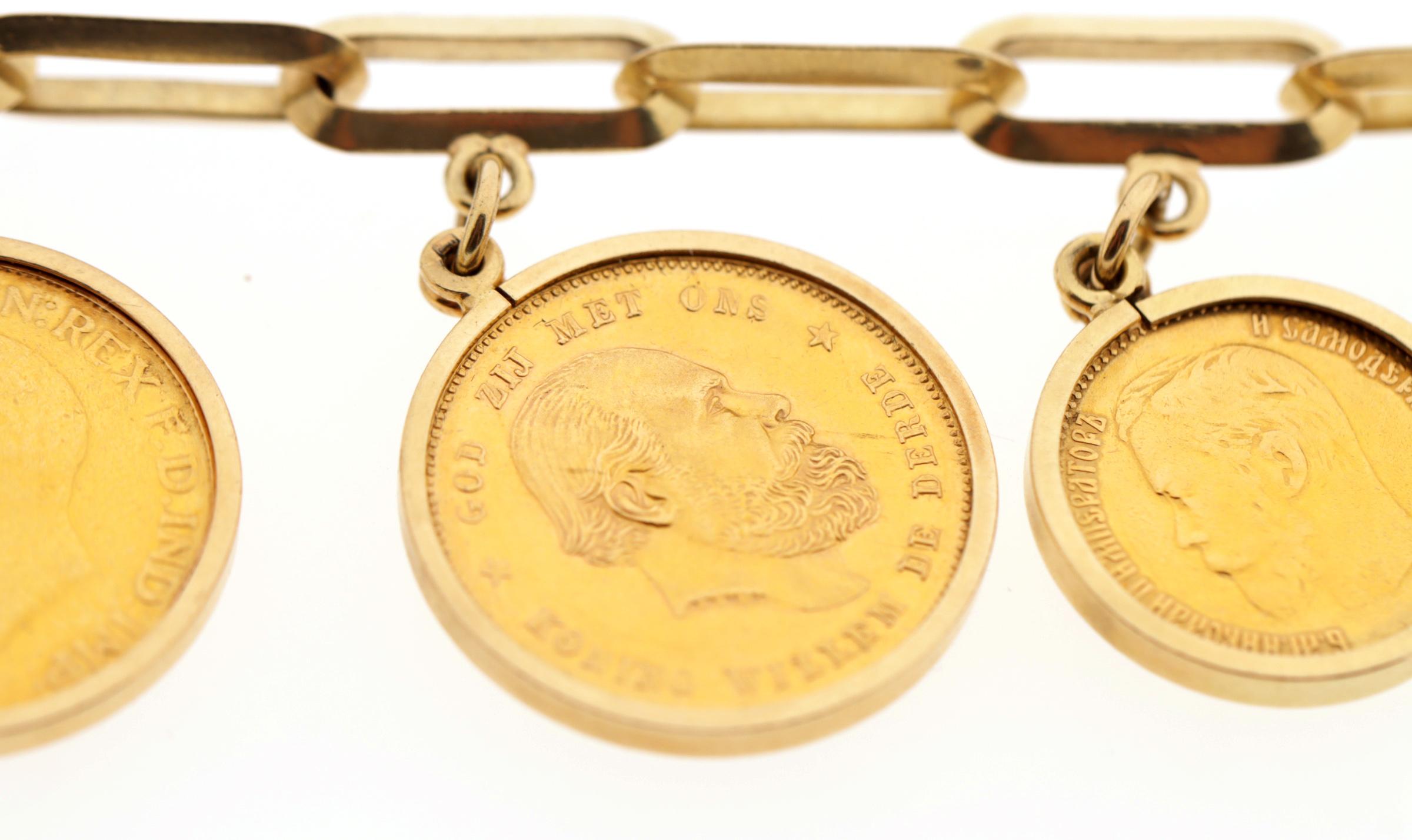 14 Kt. gouden schakelarmband met diverse fijngouden munten, etc., totaal 71,2 gram