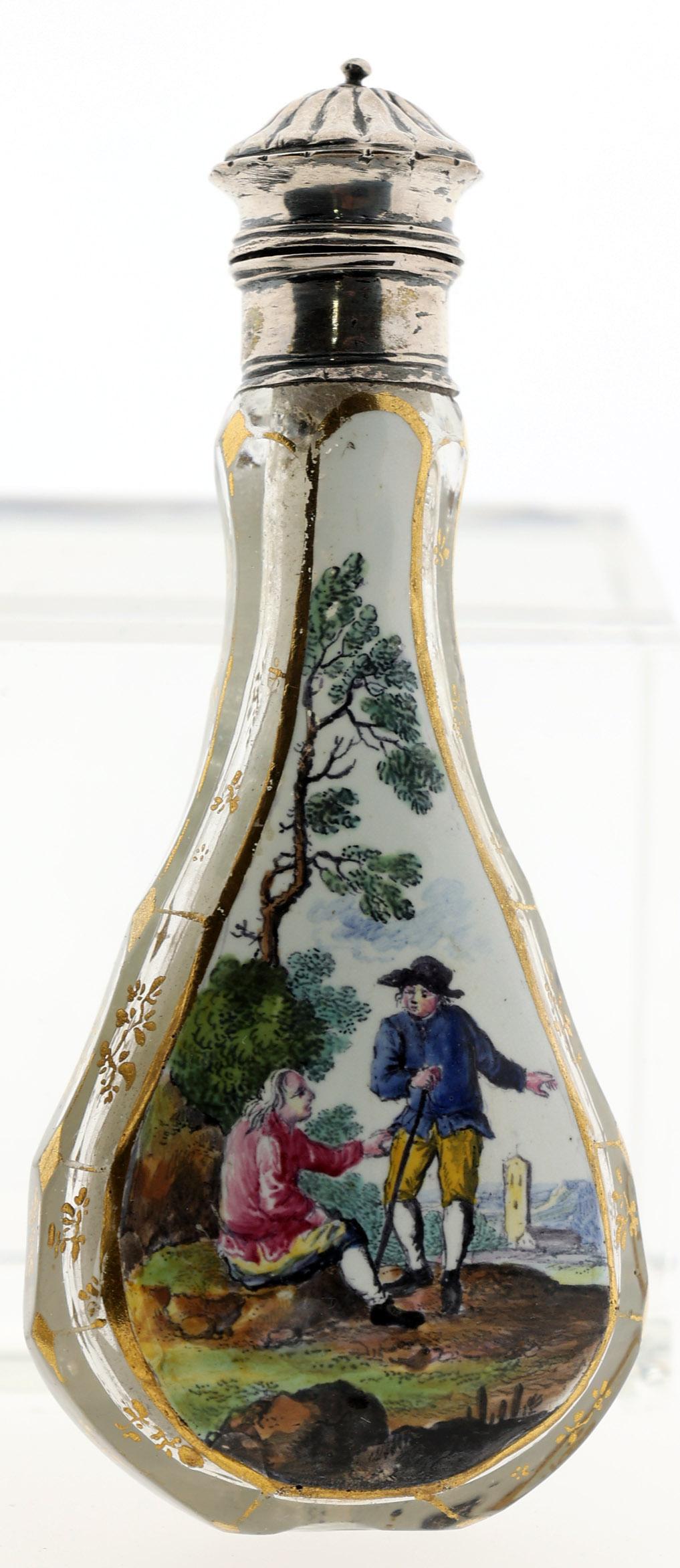 Koop van Franse emaille odeurflacon met vissende personen bij vijver met zilveren omranding Frankrijk 1875, h.6,5 cm. en kristallen flacon met geëmailleerde met personen in landschap gedecoreerde voor en achterzijde en met goud geaccentueerd met zilveren dop, Duitsland, vroeg 18e eeuw, h.10 cm.
