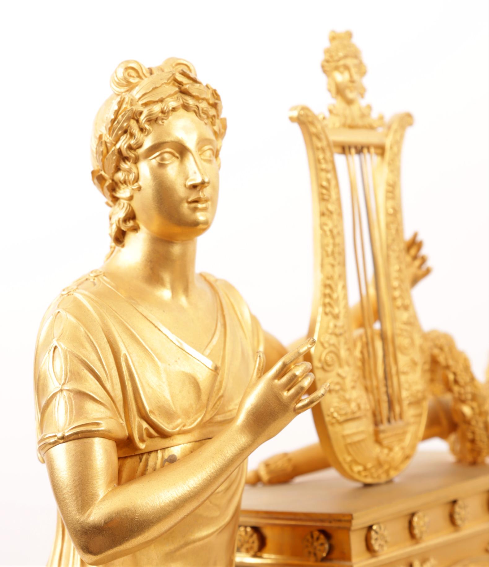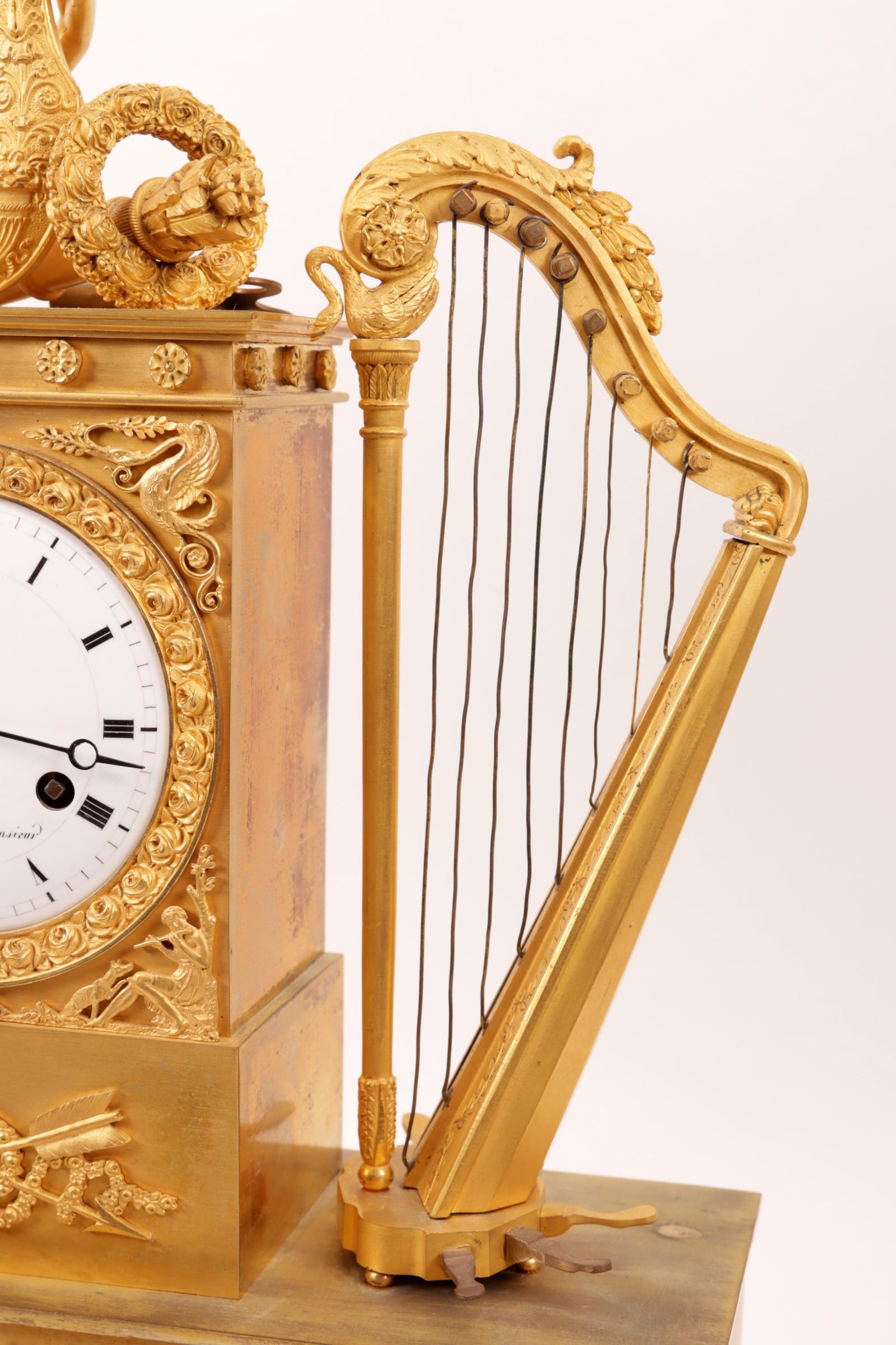 Miqnolet, vuurvergulde Frans bronzen Empire pendule met naast het uurwerk een harpiste, h.52 x b.36 x d.12 cm.