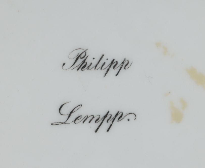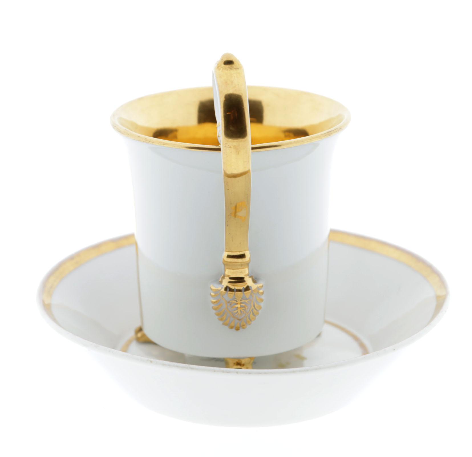 KPM Duitsland, met landhuis in landschap gedecoreerde Biedermeier kop en schotel rustend op klauwpootjes