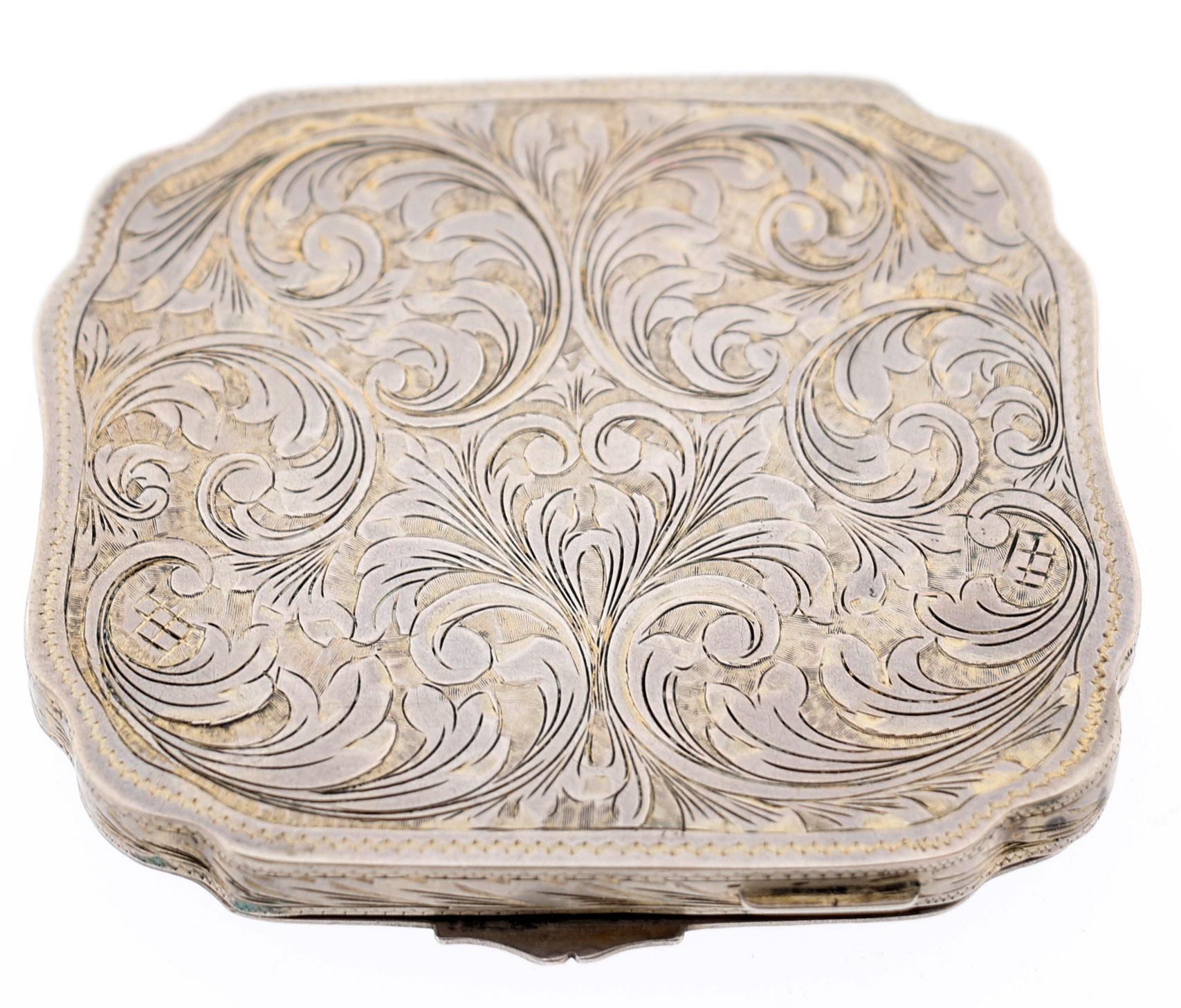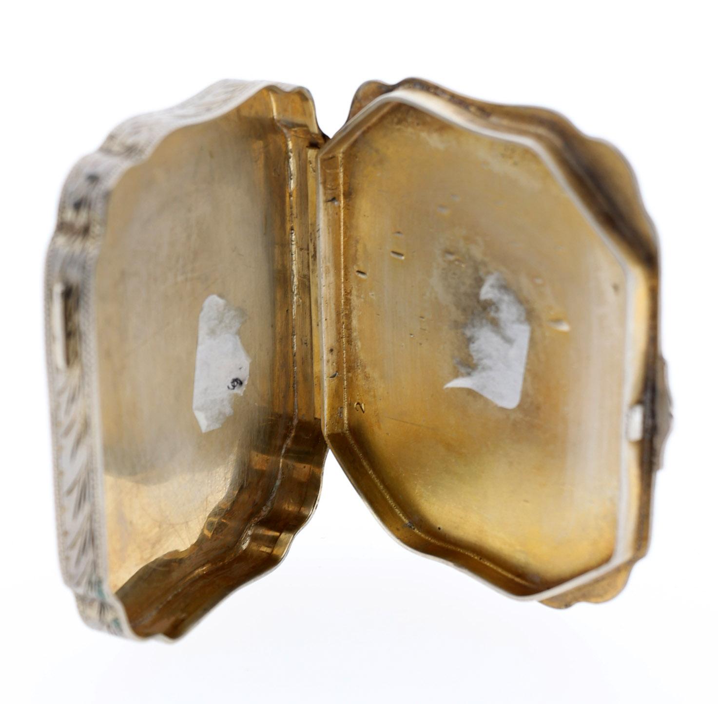 Platte emaille met zilveren snuifdoos gedecoreerde met romantisch paar in landschap, Italiaans, 19e eeuw, 8,2 x 7 cm., 3e gehalte zilver