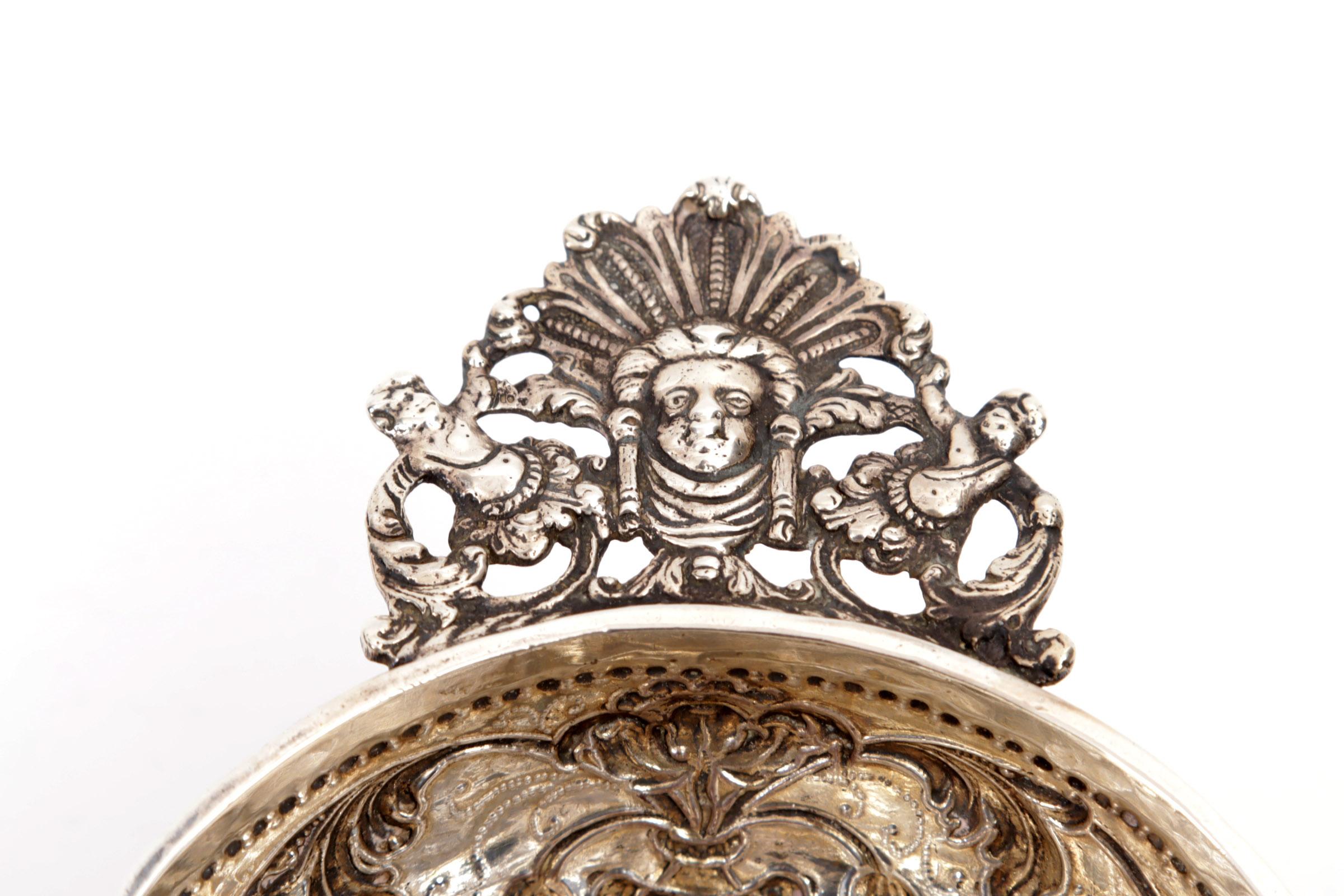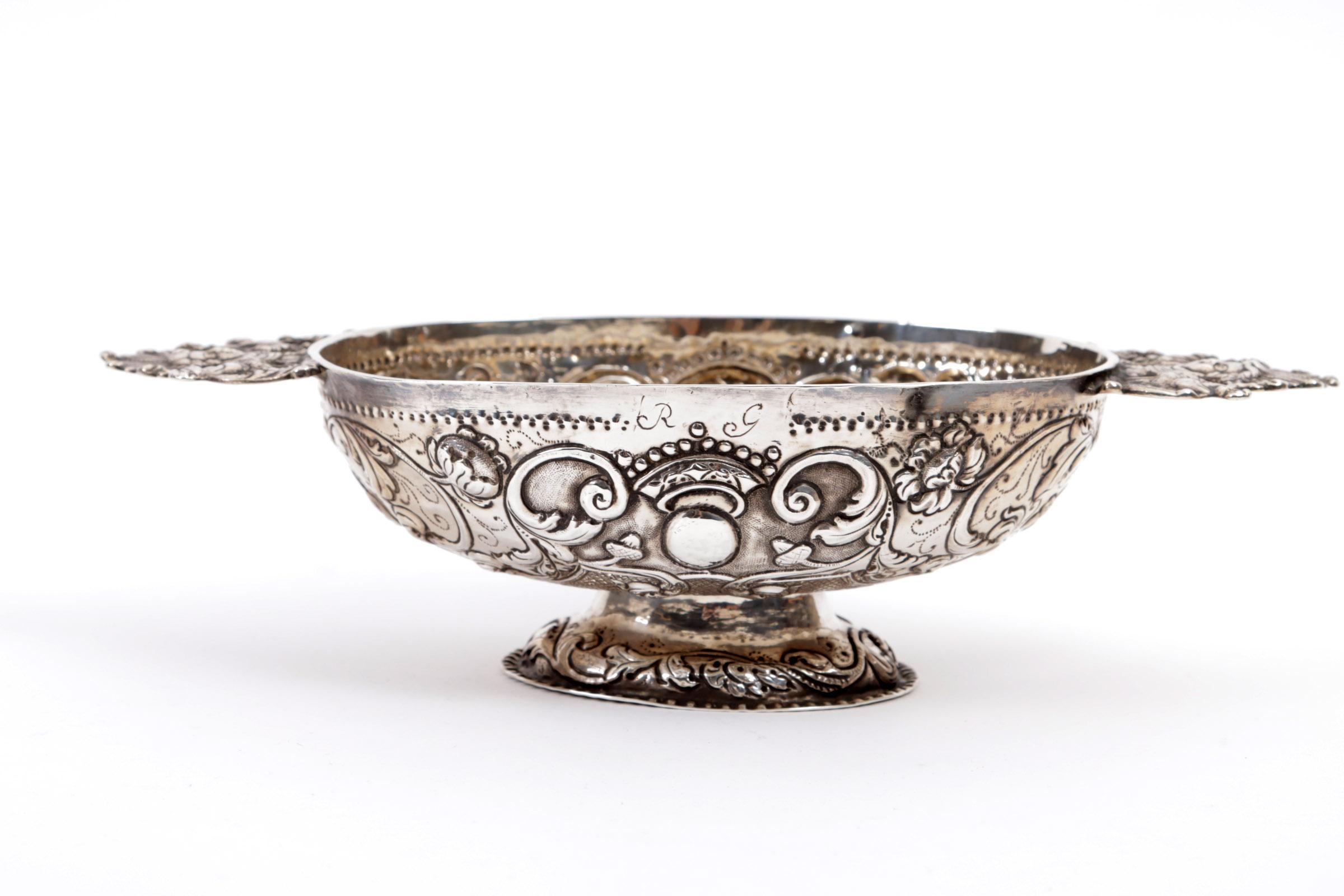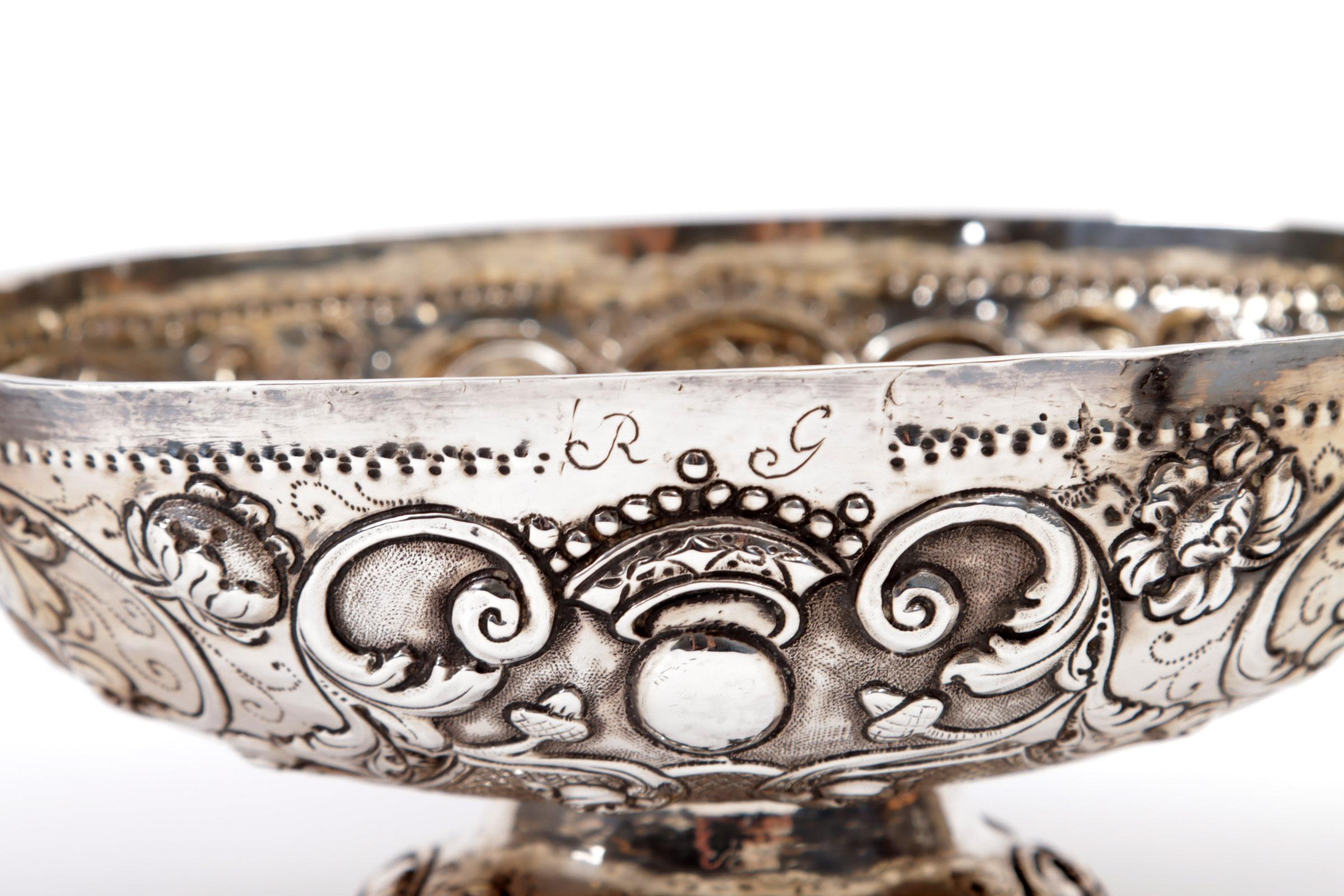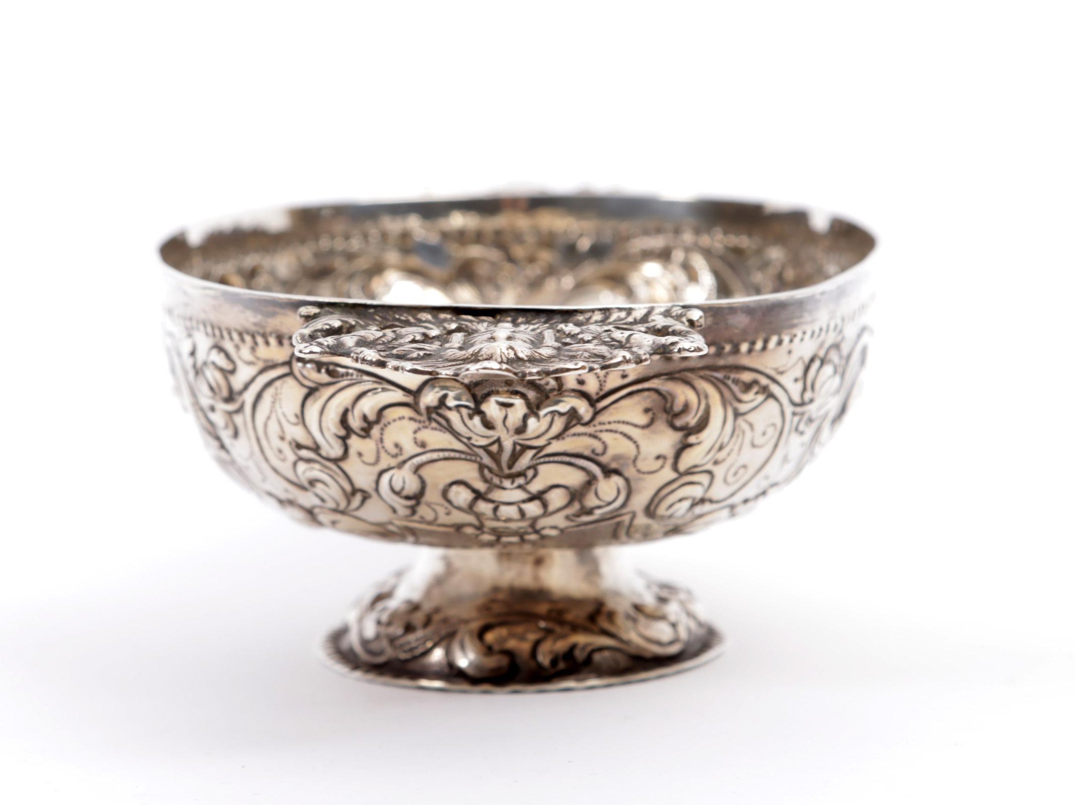 Antieke rijkbewerkte zilveren brandewijnkom, 18e eeuw