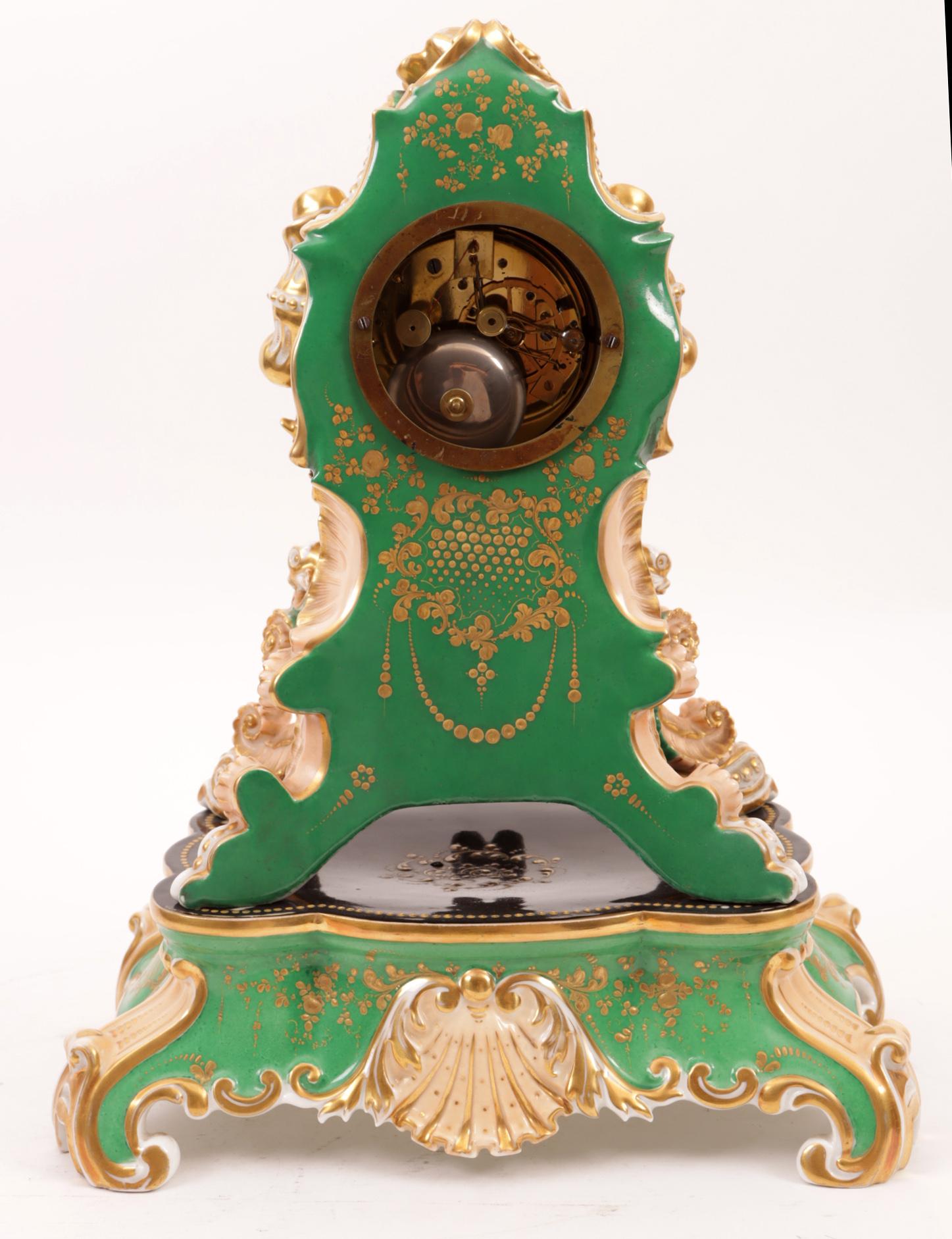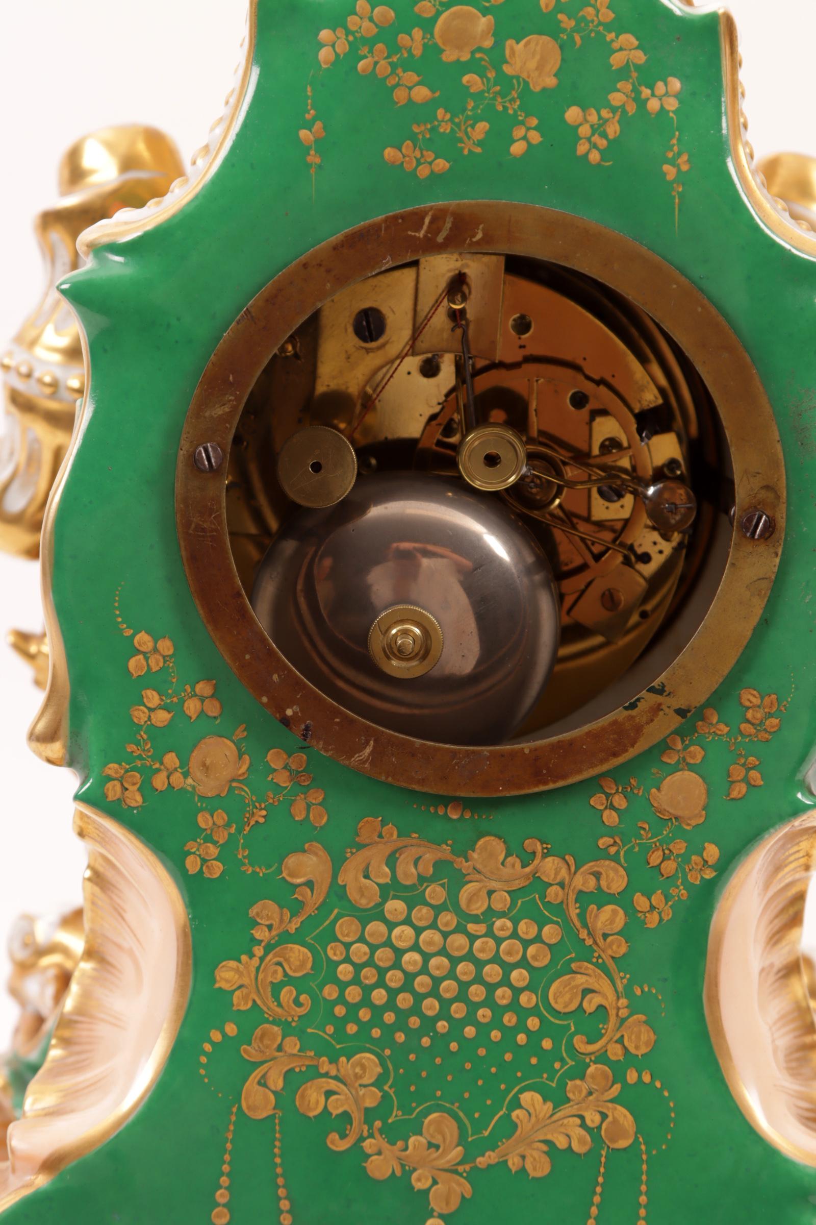 Met bloemen en personen in landschap gedecoreerde porseleinen klok rustend op porseleinen onderstel, h.39 cm.