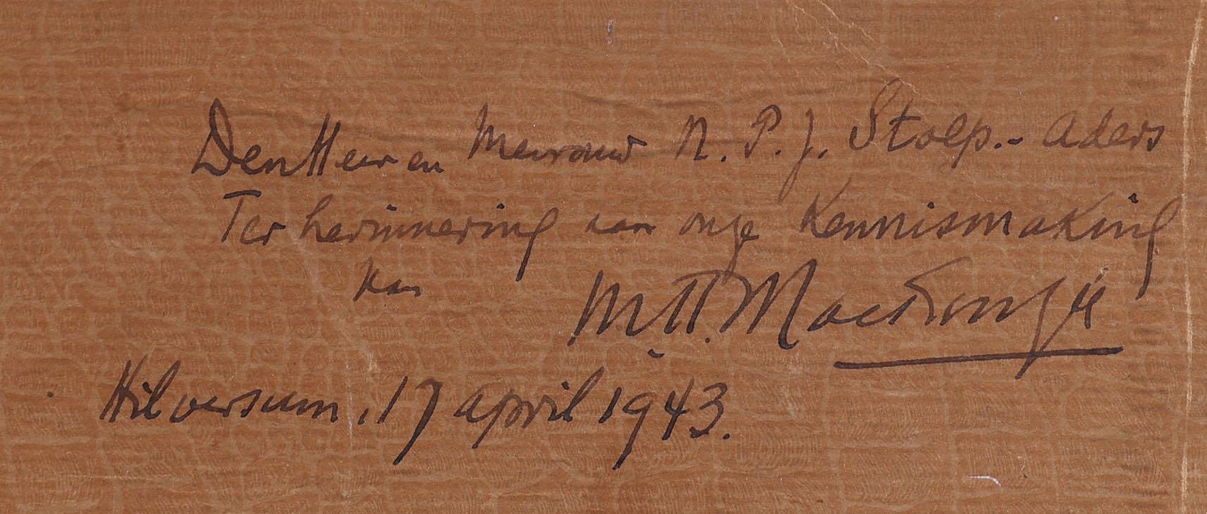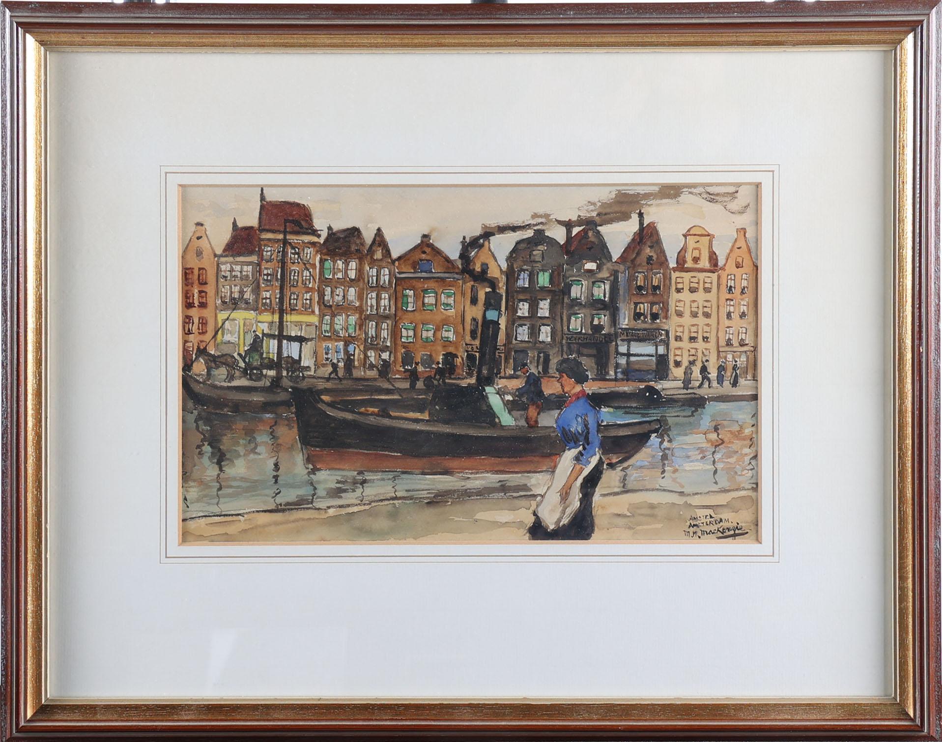 Marie Henri Mackenzie (1878-1961), Stoomboot op de Amstel van Amsterdam met diverse personen op de kade, gouache op papier, 30 x 18 cm., provenance particuliere collectie, note : geschonken in Hilversum, 17 april 1943 als dank