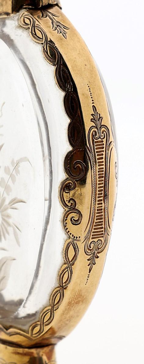 Antieke ovale met bloemen gegraveerde odeurflacon met gouden monturen en dop, Holland gekeurd, 2e helft 19e eeuw, h.10,2 cm.