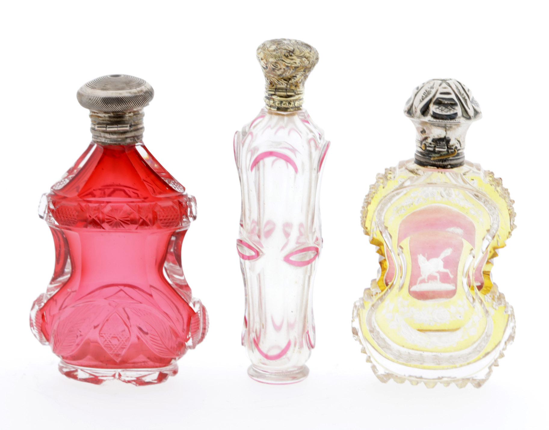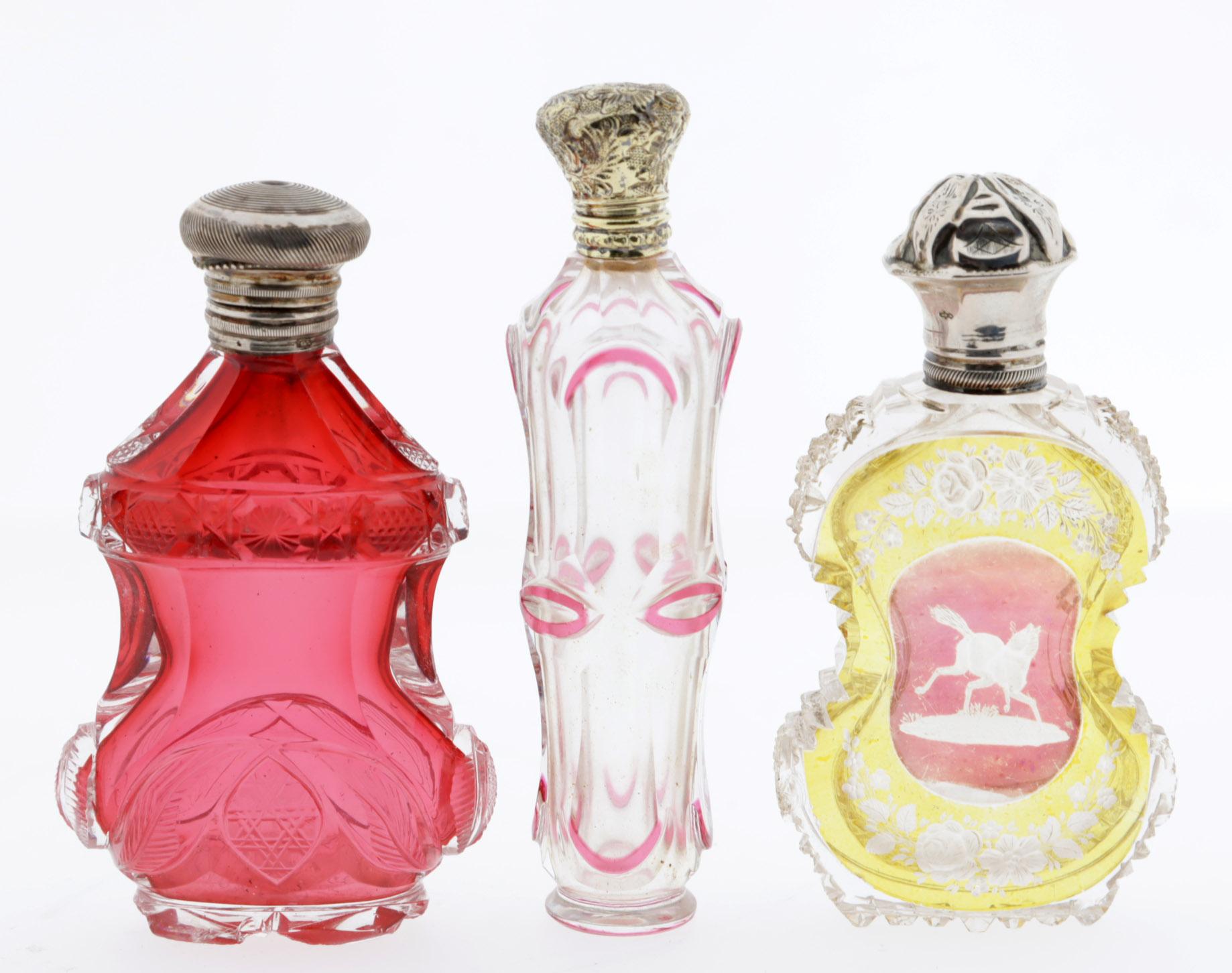 Antieke rood met roze overlay kristallen odeurflacons, Frankrijk 19e eeuw, h.10,7 cm., rode deurflacon met zilveren dop, Nederlands, 19e eeuw en een gele met paard gegraveerde odeurflacon met zilveren dop, Nederland, 19e eeuw